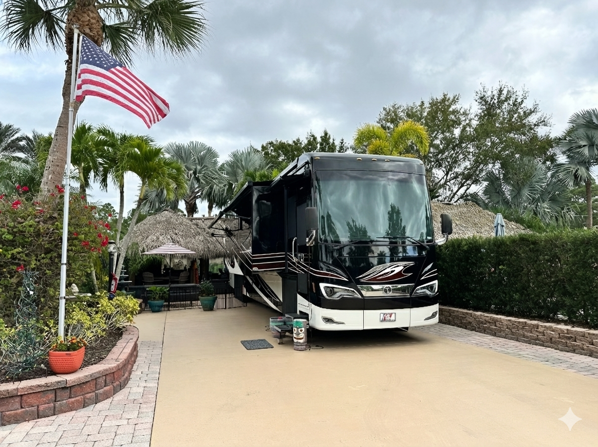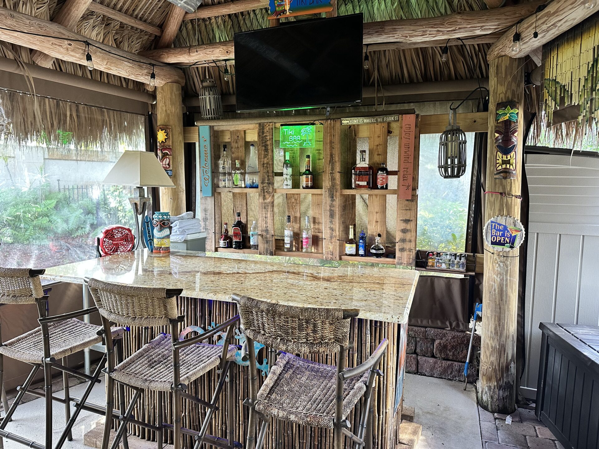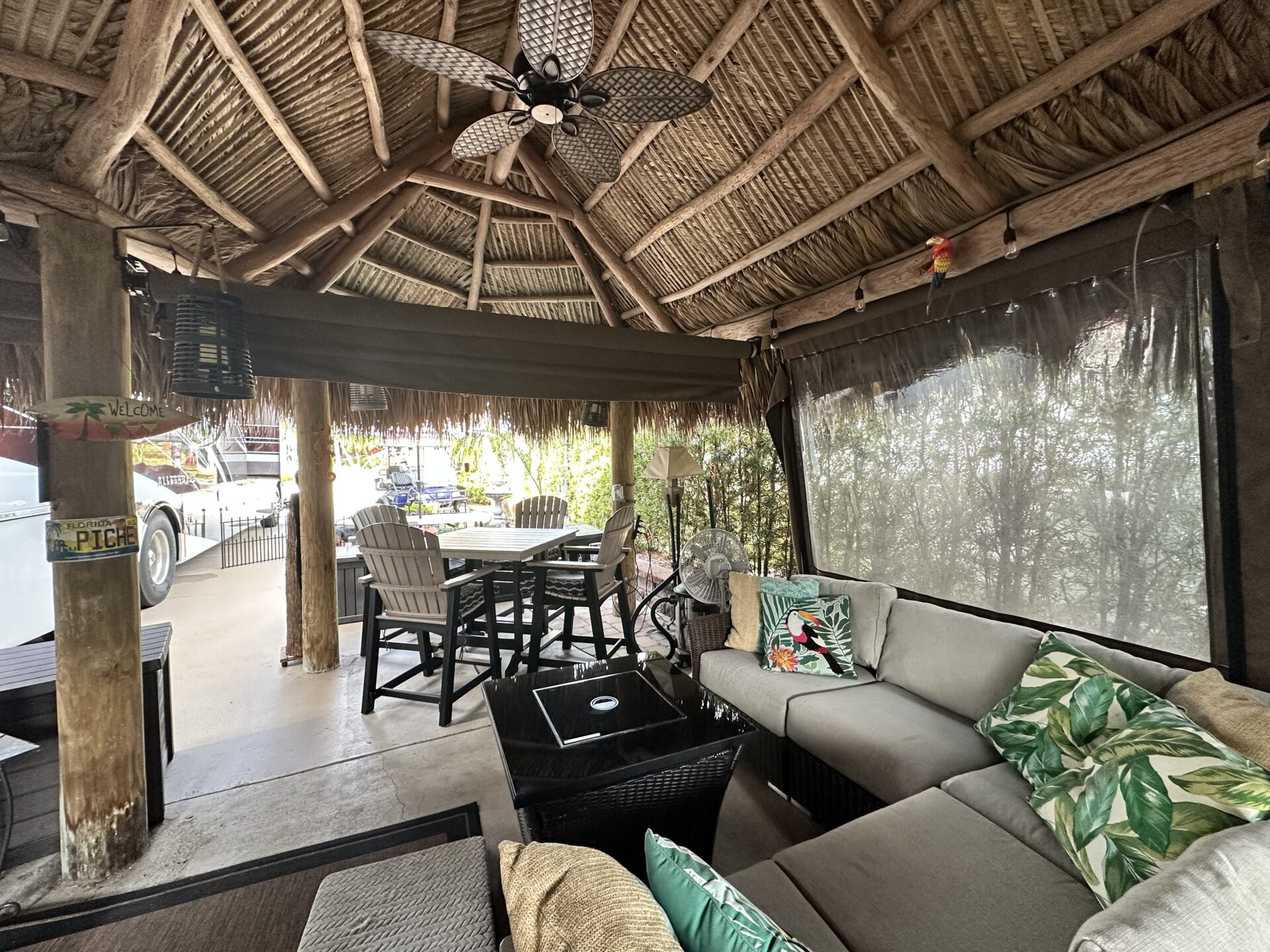 Large L-shaped tiki with kitchen, granite topped bamboo bar with plenty of room for seating and entertaining. Isinglass roll down shades to protect from the elements. Most furnishings to convey. Lot easily accommodates the largest of coaches and still room to park 2 vehicles and a golf cart. Mature landscaping provides privacy. Nearby greenspace for your pets. Close to the front entrance of the resort. Pad was just painted.