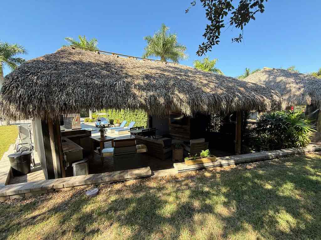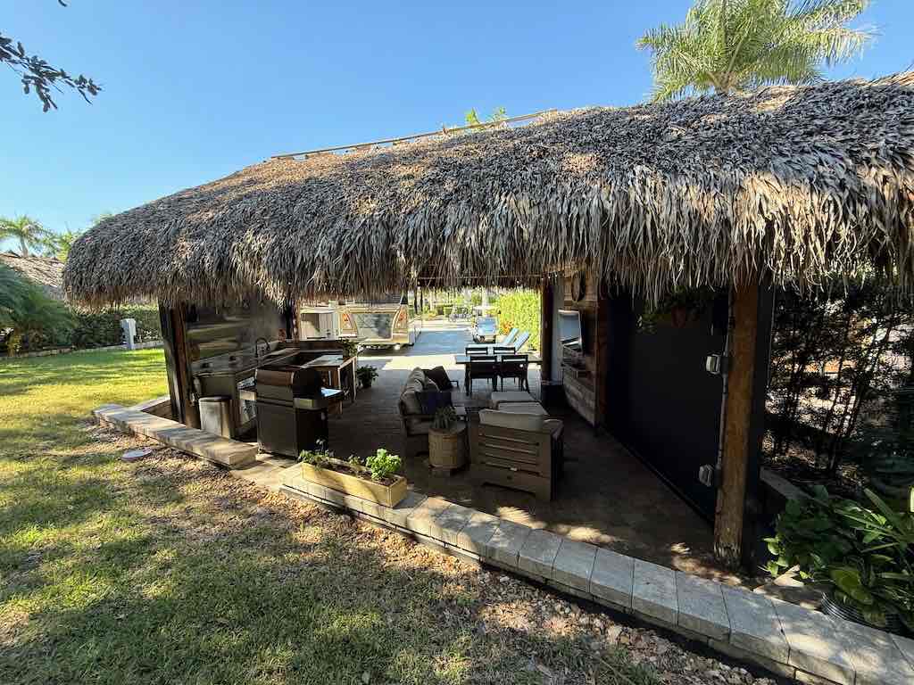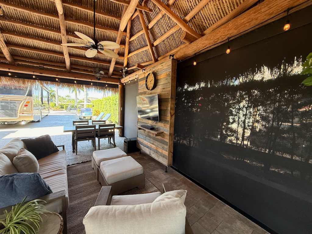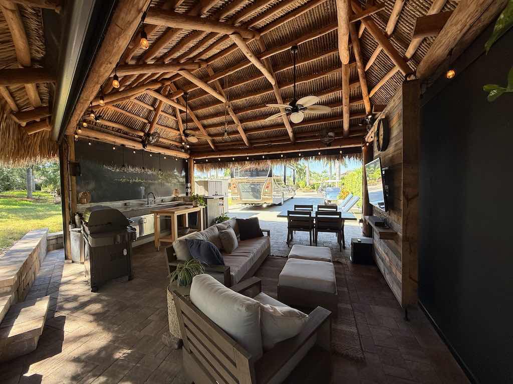 NEW TIKI THATCH NOVEMBER 2025! Inside the tiki, enjoy a dedicated entertainment wall with a flat-screen TV, comfortable sofa and chairs with ottomans, and a spacious dining area—perfect for gatherings or quiet evenings. Motorized screens allow you to enjoy the outdoors in comfort, while storage sheds provide convenient space for all your extras.