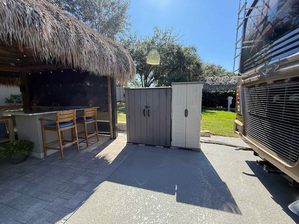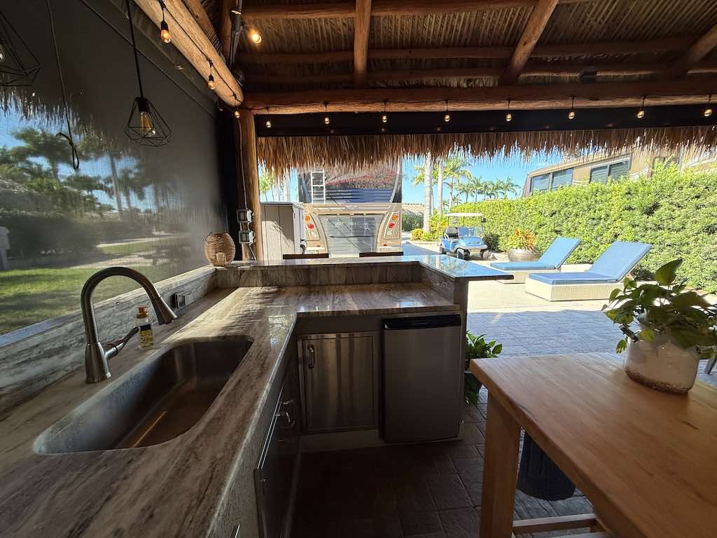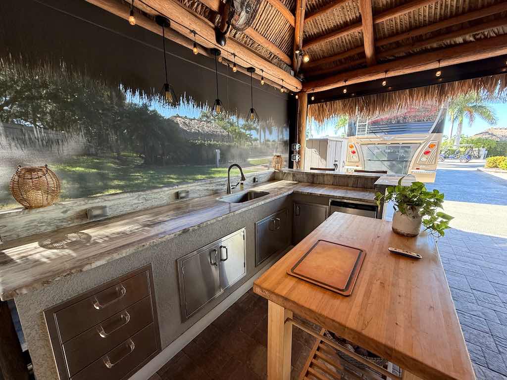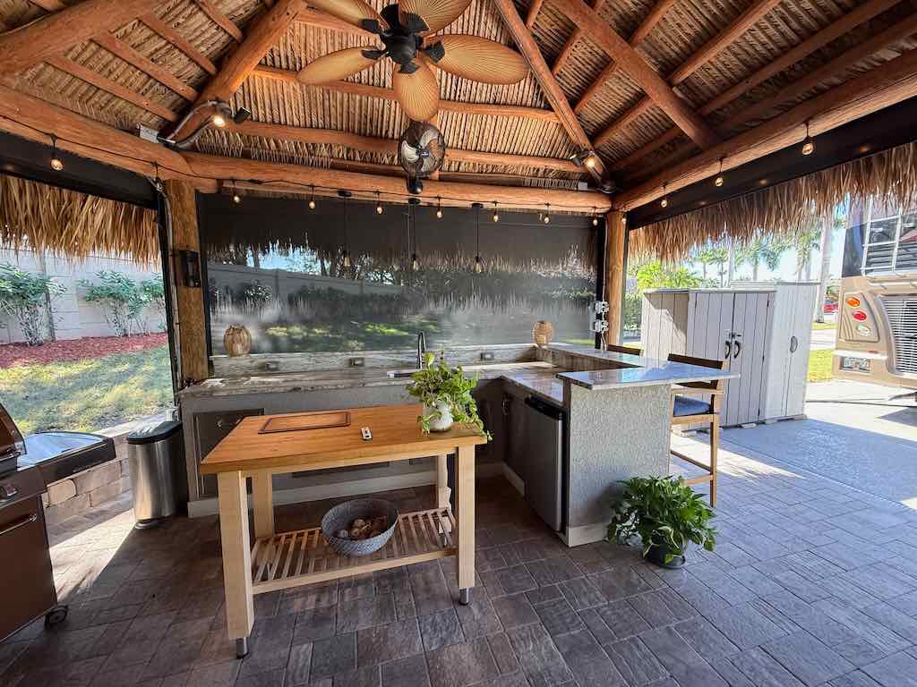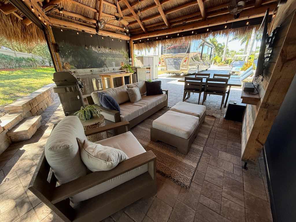 NEW TIKI THATCH NOVEMBER 2025! Inside the tiki, enjoy a dedicated entertainment wall with a flat-screen TV, comfortable sofa and chairs with ottomans, and a spacious dining area—perfect for gatherings or quiet evenings. Motorized screens allow you to enjoy the outdoors in comfort, while storage sheds provide convenient space for all your extras.