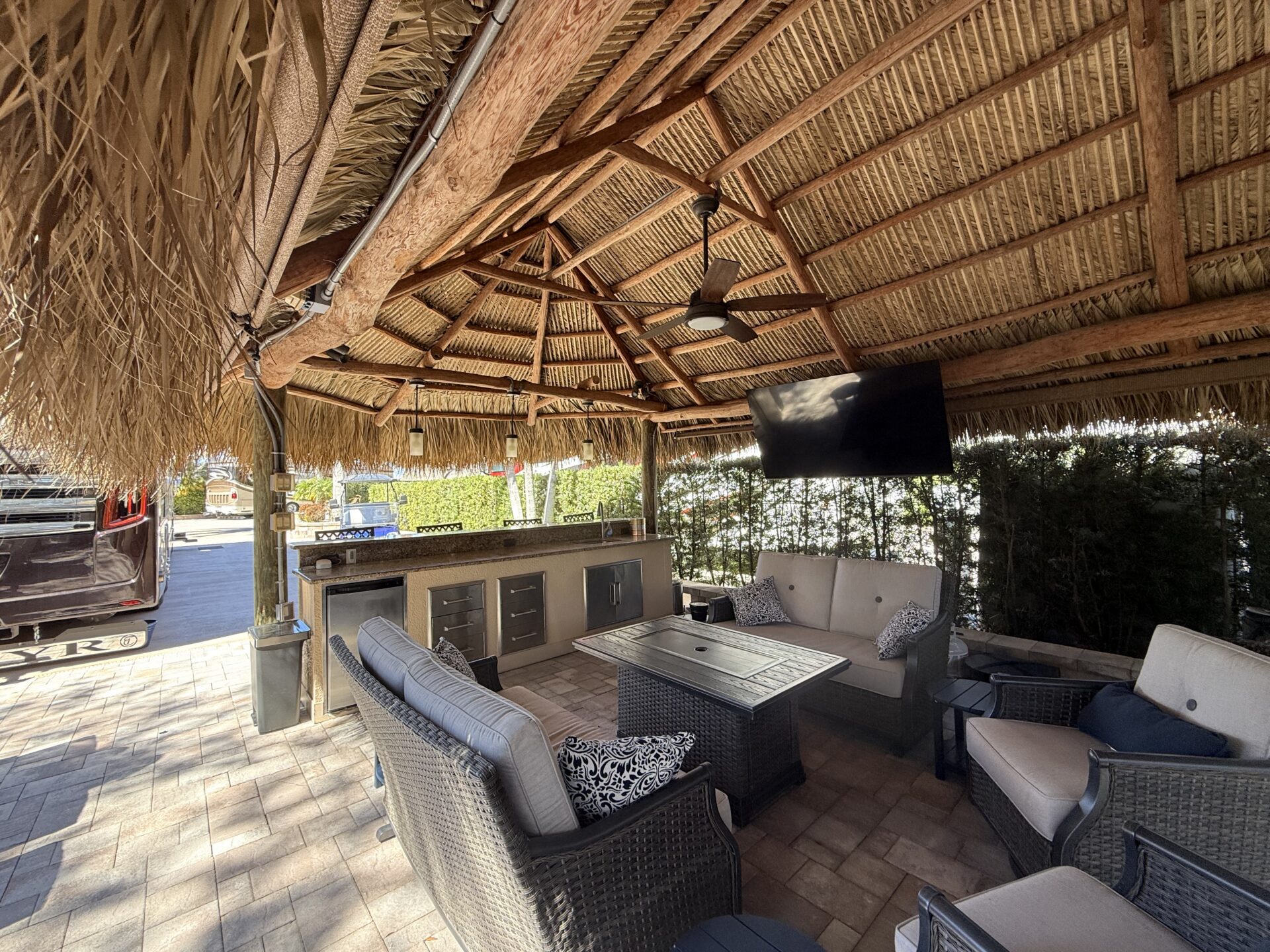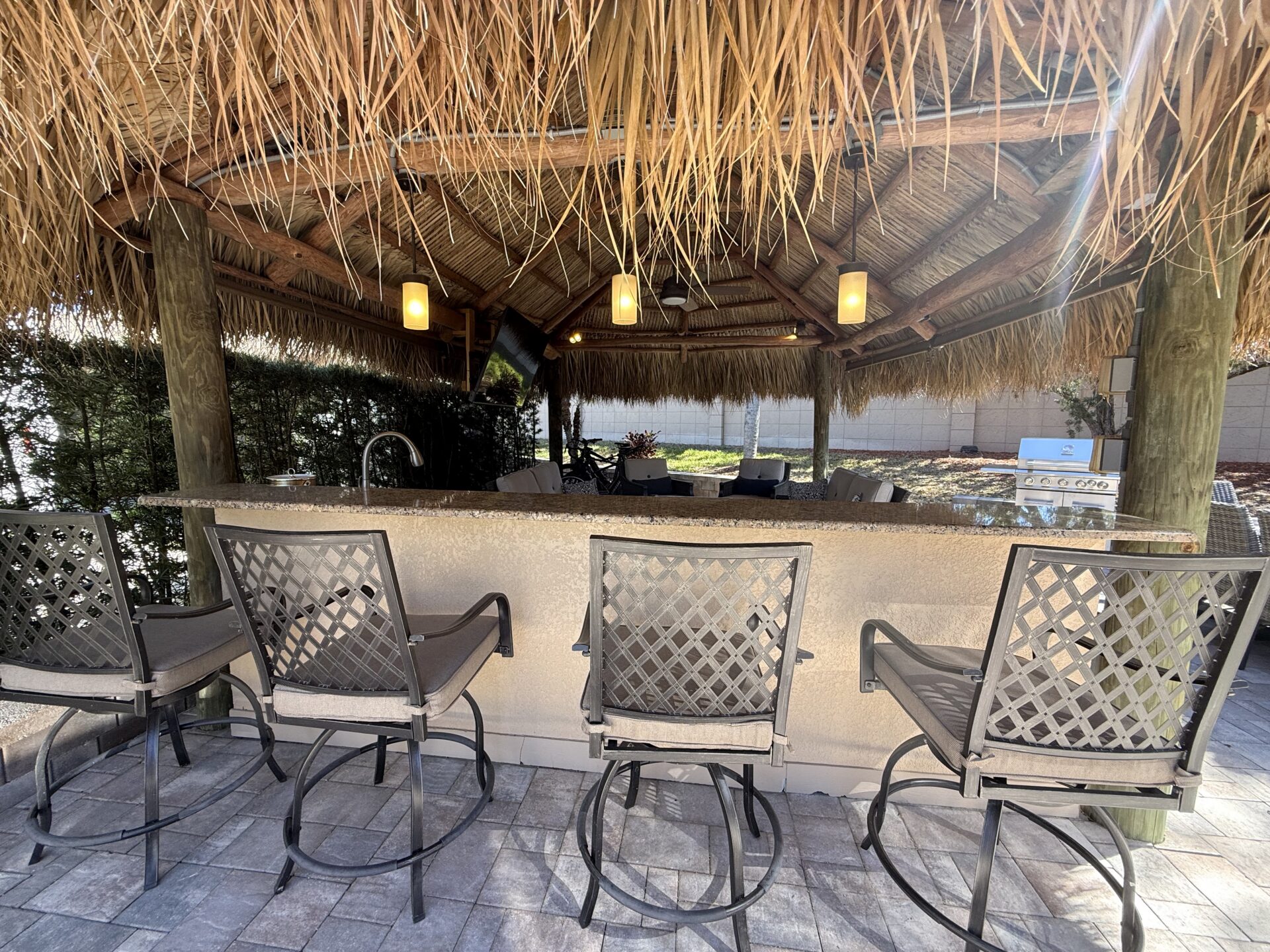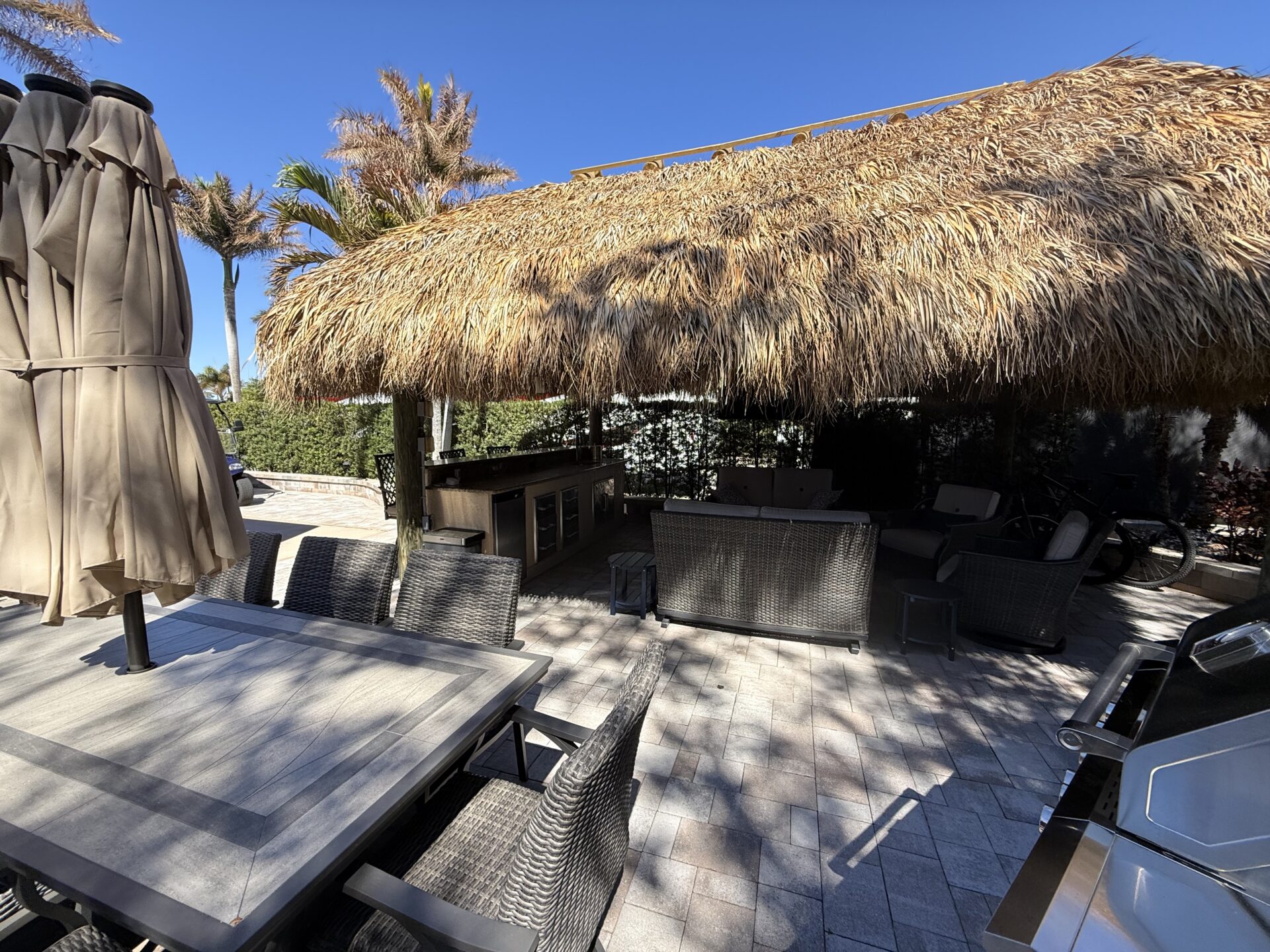 This expansive 2,868 sq. ft. lot offers a desirable layout that widens at the rear and runs along the perimeter wall, providing exceptional privacy and a peaceful setting. Upgraded with newer-style pavers and attractive landscape walls, the property is beautifully framed by mature shrubs and palm trees that enhance both seclusion and tropical charm. Designed for comfortable outdoor living, the granite-topped kitchen and bar area features a built-in sink and refrigerator—perfect for effortless entertaining. The lot is offered fully furnished with high-quality, comfortable seating, a dining set, bar stools, and a stylish fire pit table ideal for relaxing on cooler evenings. Meticulously maintained and thoughtfully appointed, this move-in-ready property presents an outstanding opportunity and is attractively priced for a quick sale.