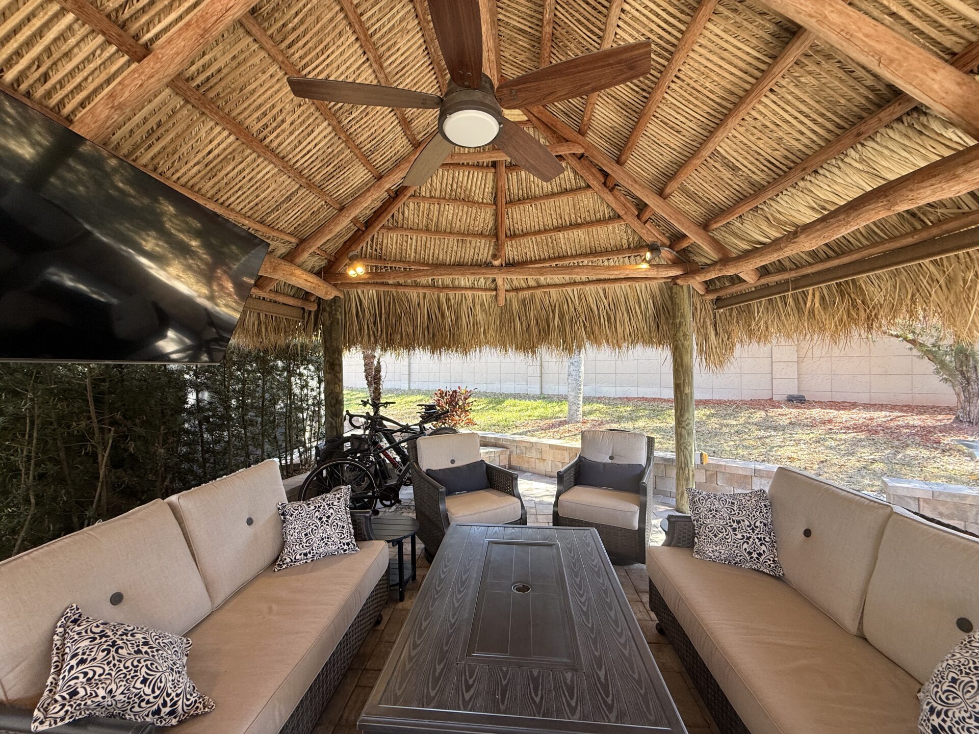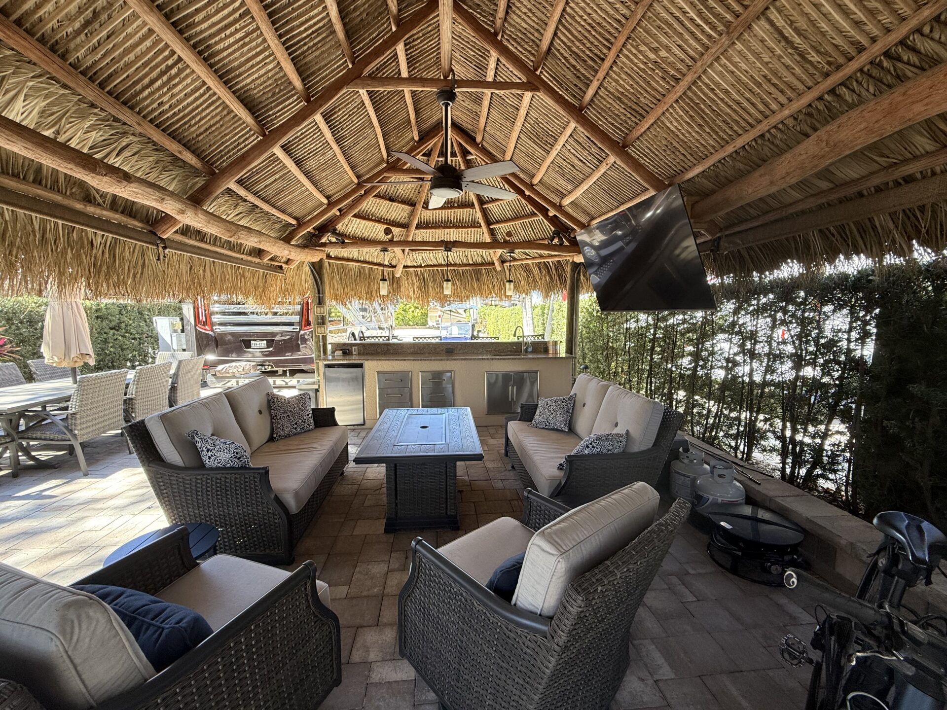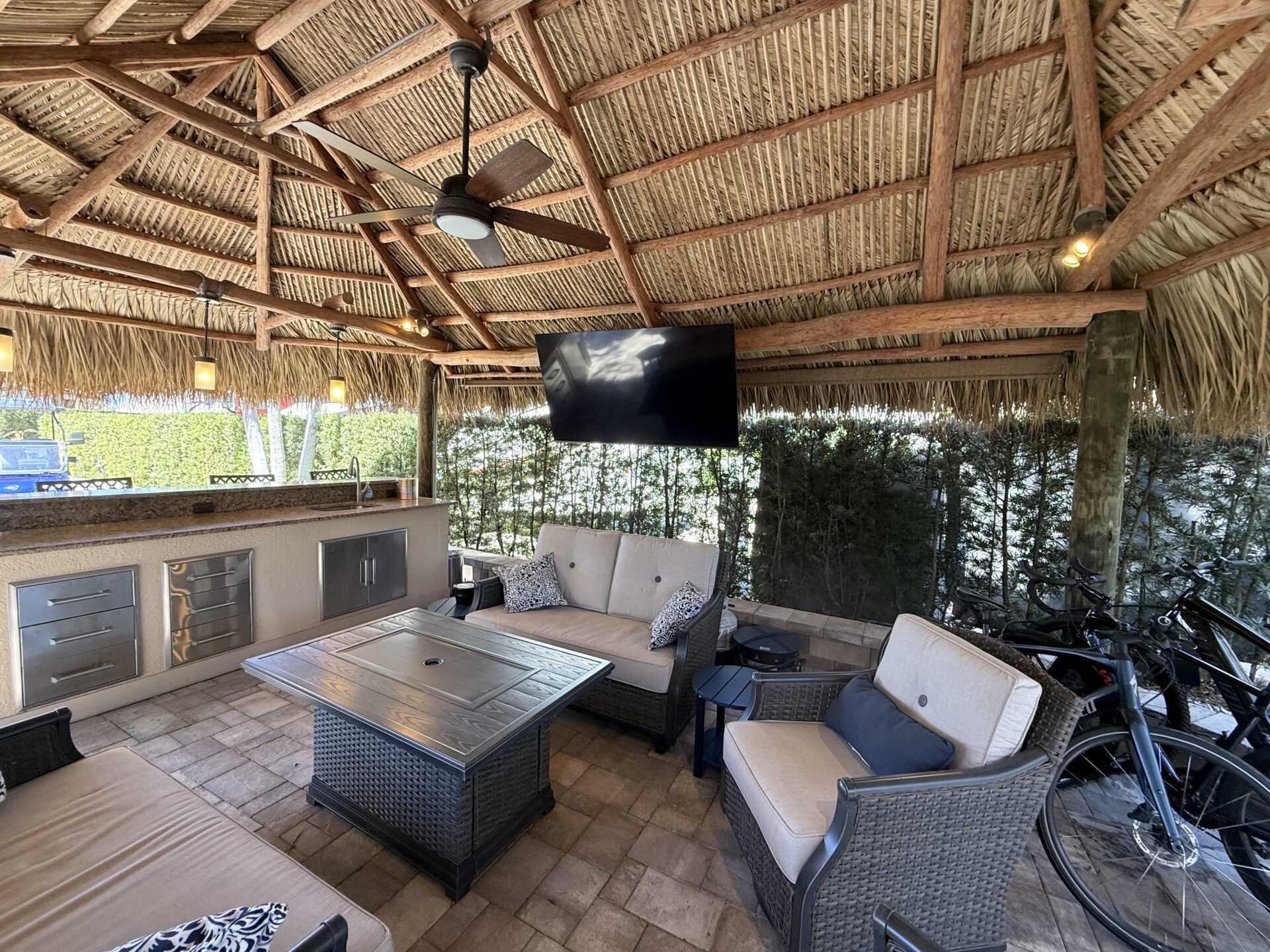 This expansive 2,868 sq. ft. lot offers a desirable layout that widens at the rear and runs along the perimeter wall, providing exceptional privacy and a peaceful setting. Upgraded with newer-style pavers and attractive landscape walls, the property is beautifully framed by mature shrubs and palm trees that enhance both seclusion and tropical charm. Designed for comfortable outdoor living, the granite-topped kitchen and bar area features a built-in sink and refrigerator—perfect for effortless entertaining. The lot is offered fully furnished with high-quality, comfortable seating, a dining set, bar stools, and a stylish fire pit table ideal for relaxing on cooler evenings. Meticulously maintained and thoughtfully appointed, this move-in-ready property presents an outstanding opportunity and is attractively priced for a quick sale.