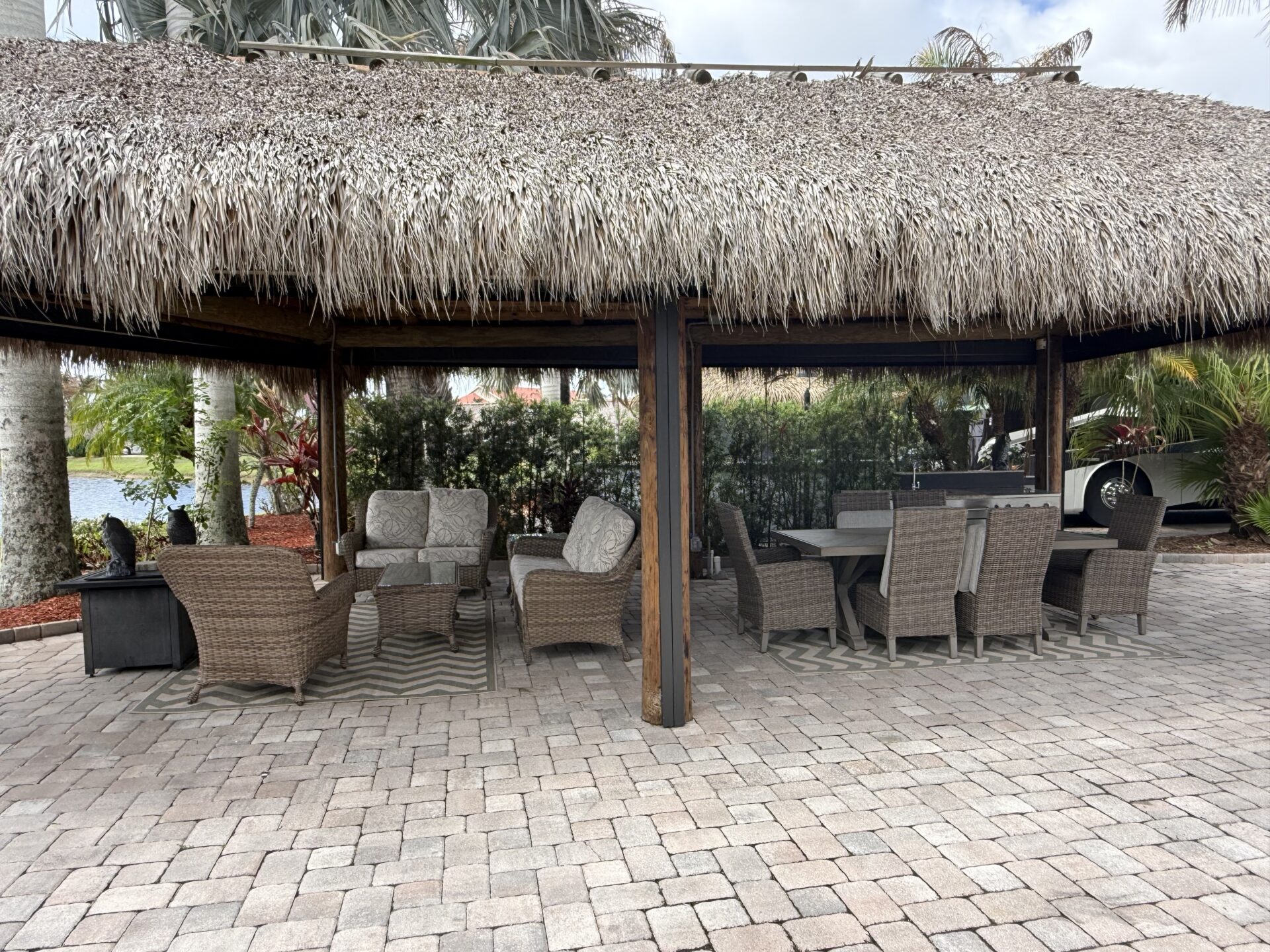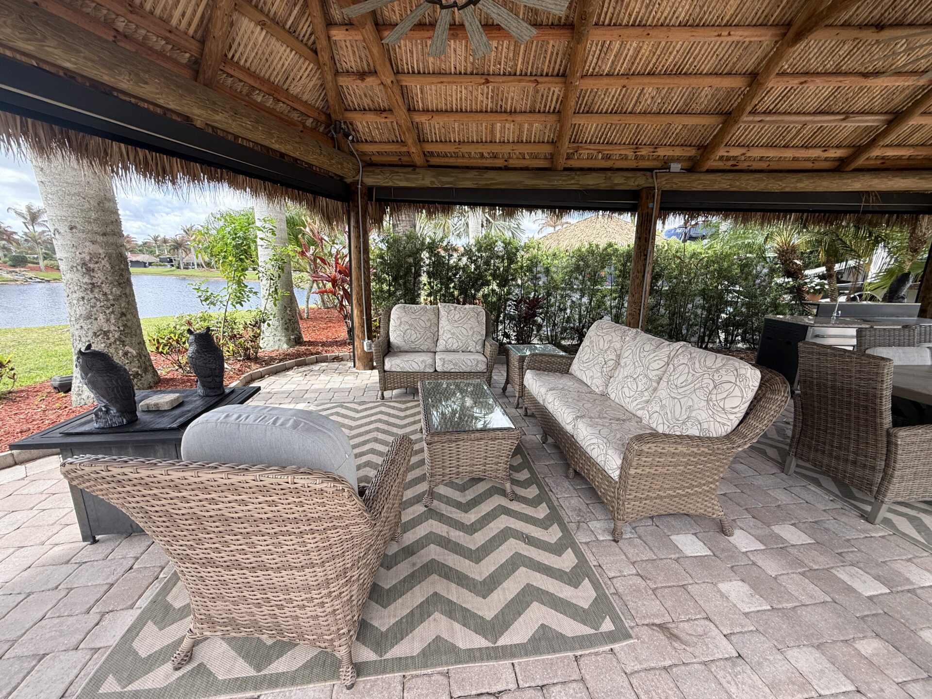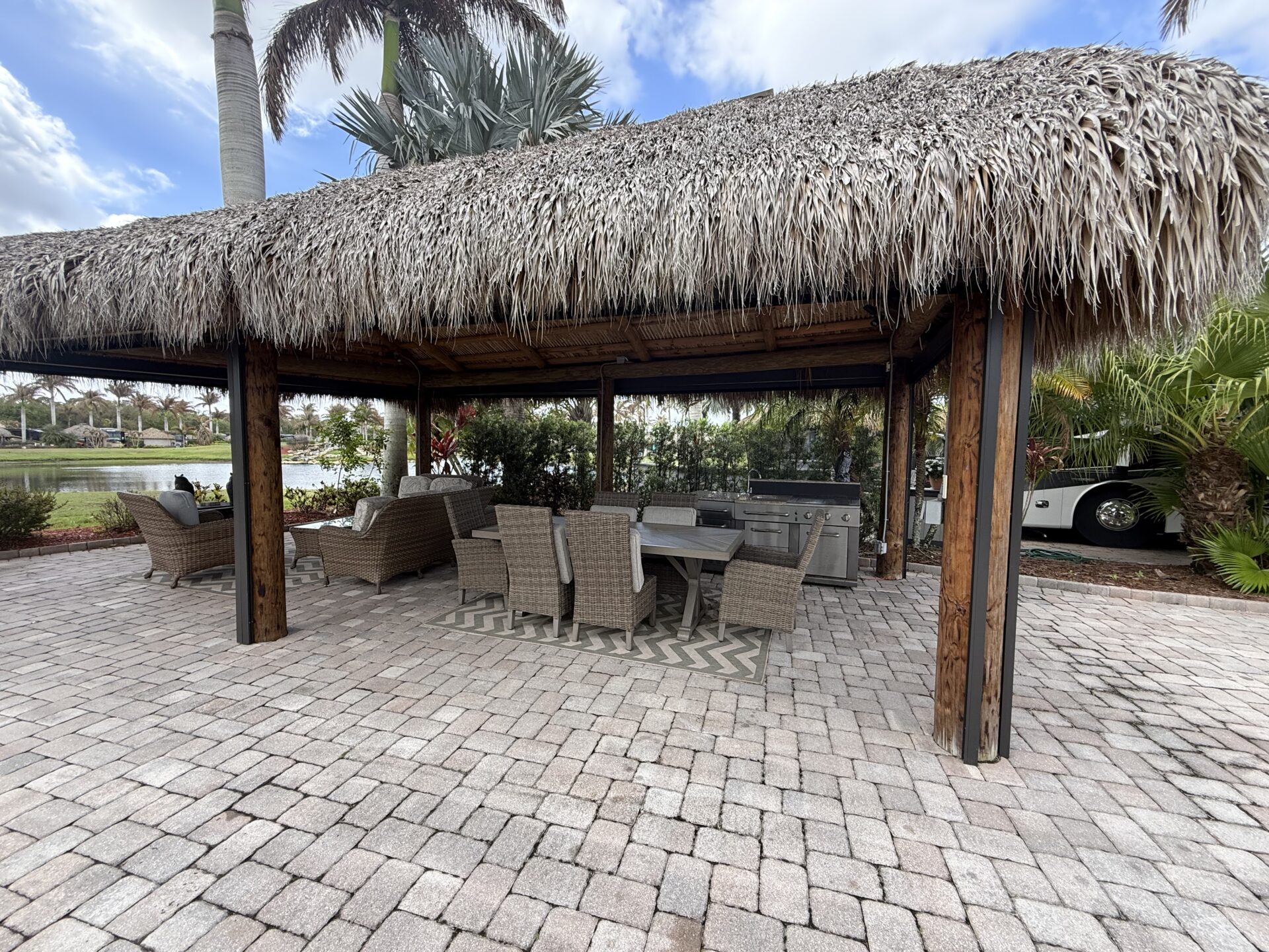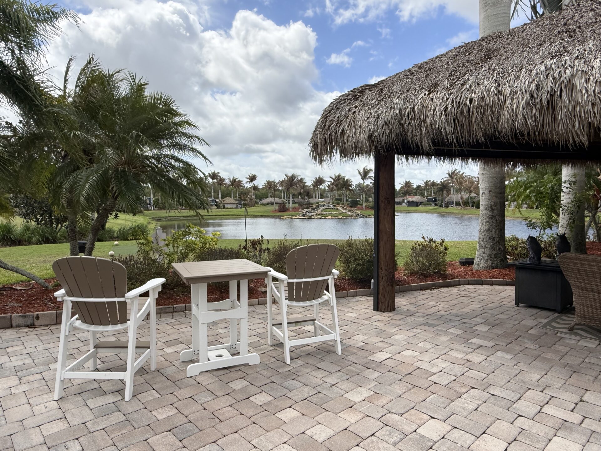 Exceptional oversized 2,749 sq. ft. pull-in lot offering breathtaking views of the golf course and a stunning double waterfall feature. This fully pavered property is designed for both comfort and entertaining, highlighted by a spacious tiki hut complete with a well-appointed modular outdoor kitchen.
