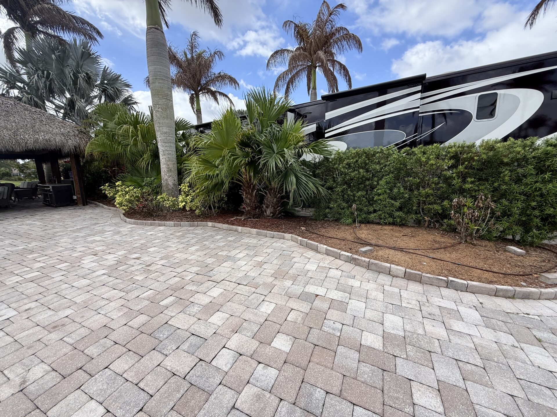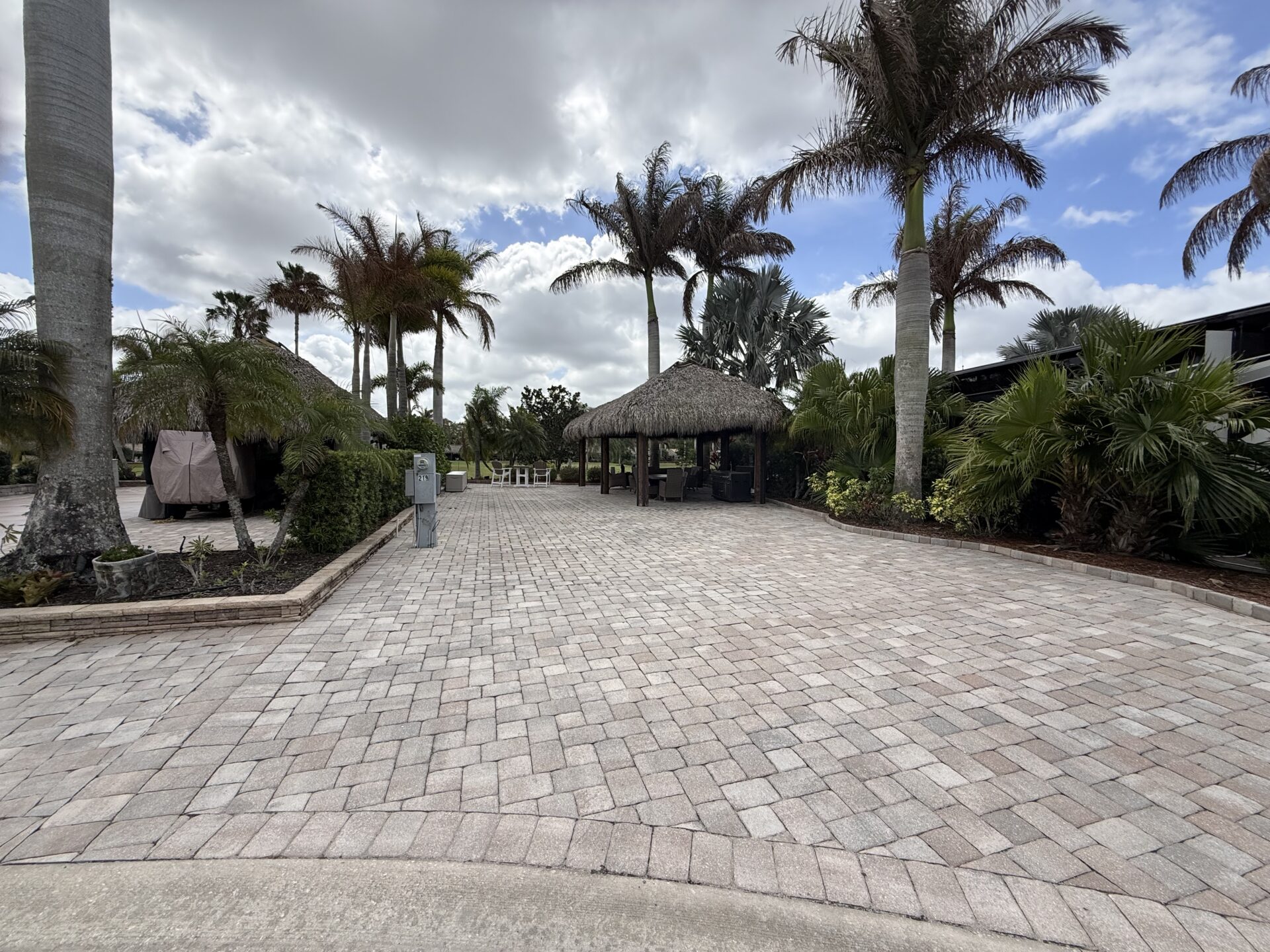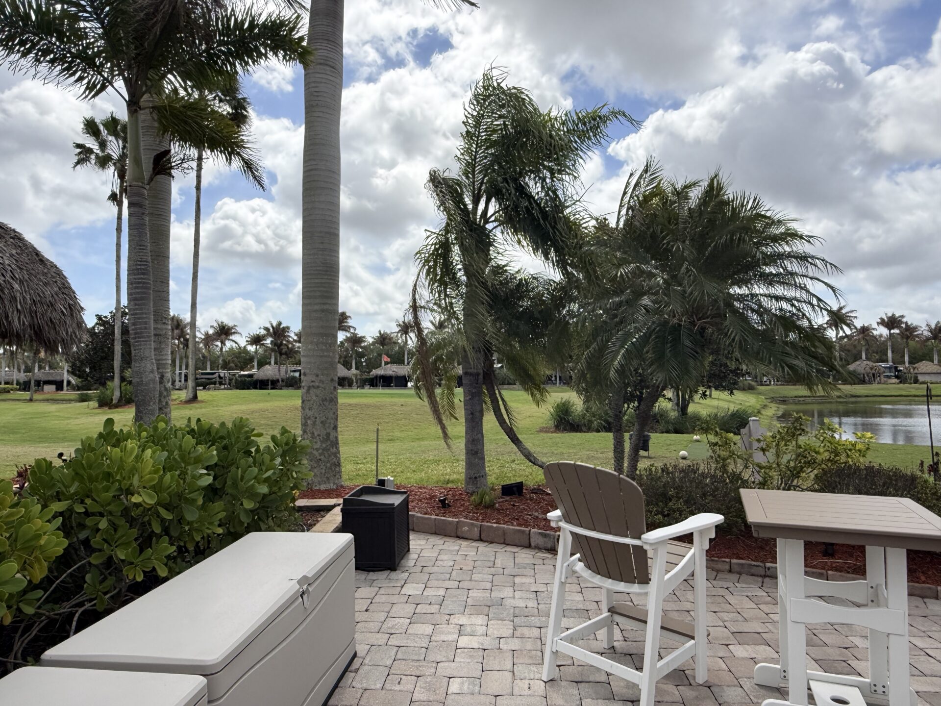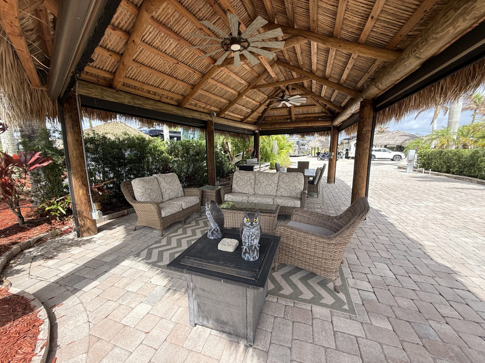 Exceptional oversized 2,749 sq. ft. pull-in lot offering breathtaking views of the golf course and a stunning double waterfall feature. This fully pavered property is designed for both comfort and entertaining, highlighted by a spacious tiki hut complete with a well-appointed modular outdoor kitchen.