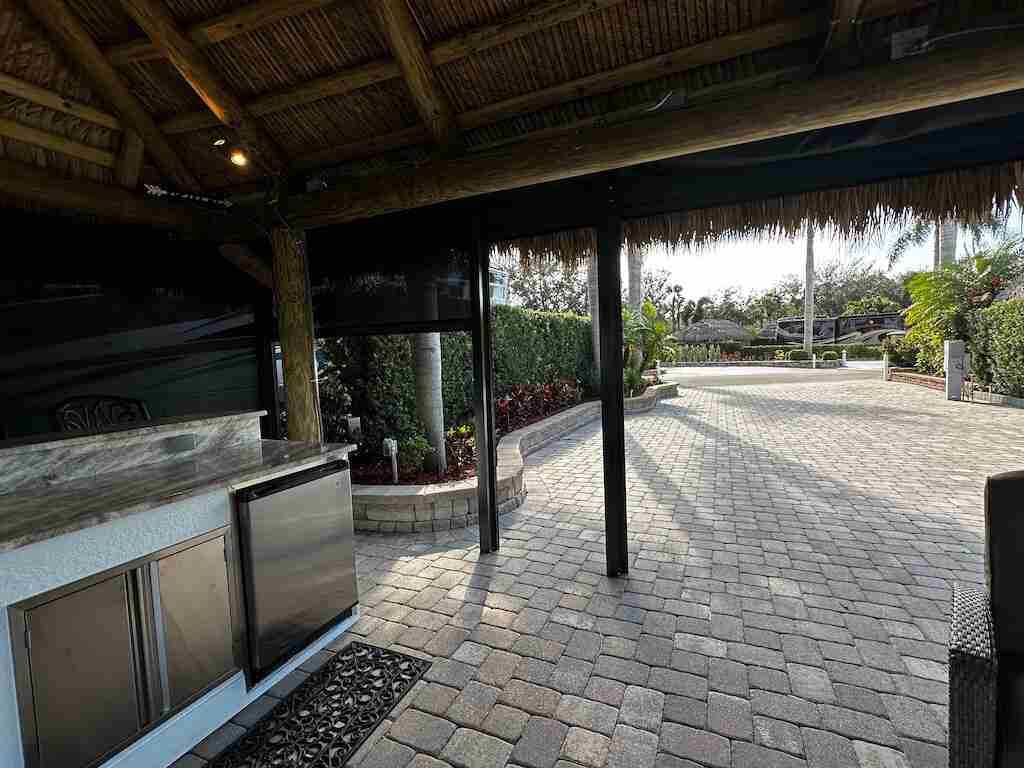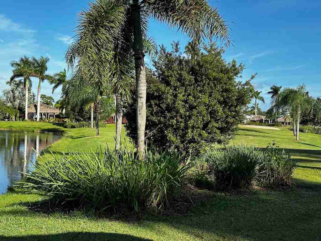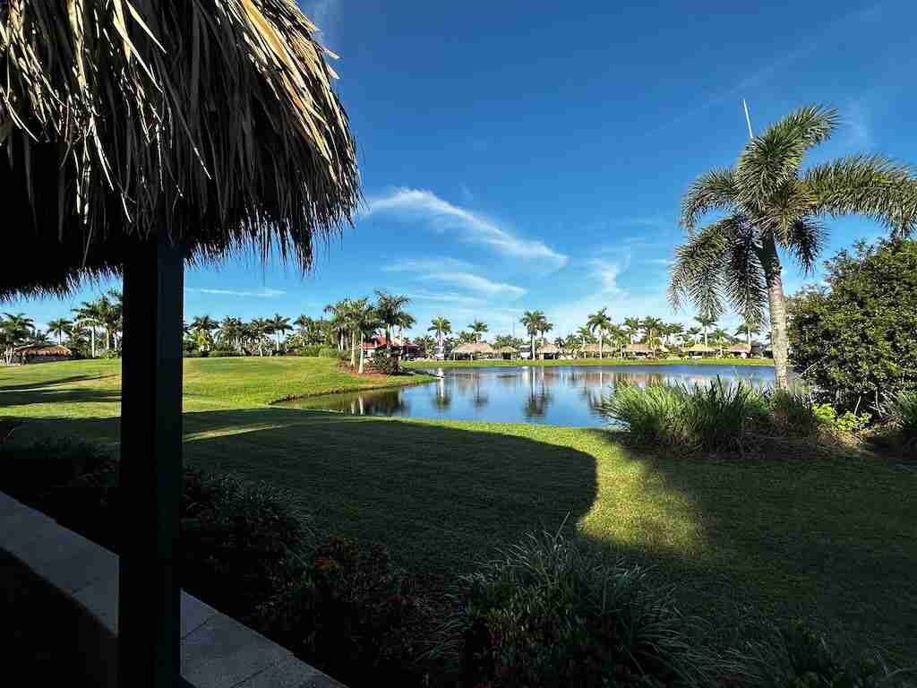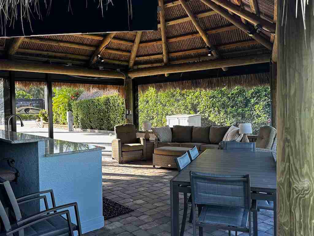 Incredible Panoramic Views Await! This north-facing pull-in lot offers breathtaking vistas of two lakes adorned with mesmerizing lighted waterfalls and some of the most spectacular sunsets you’ll ever witness. The well-appointed, LARGE tiki is a delight, featuring a stylish kitchen/bar with a granite-topped surface. For year-round comfort, the new 415 sq ft tiki is equipped with full remote controlled screens, providing warmth on chilly nights without sacrificing the view. The outdoor space boasts raised beds with stunning landscape walls, pavers, and a variety of mature plantings and trees. This lot comes fully furnished, With every detail carefully considered, this property is move-in ready and an absolute must-see for those seeking a harmonious blend of natural beauty and functional elegance. The wiring, screens, tiki etc. were all replaced/built in spring 2024. Don’t miss the chance to call this haven yours!