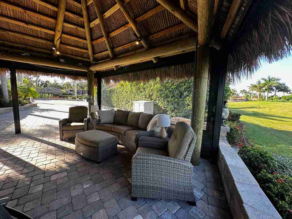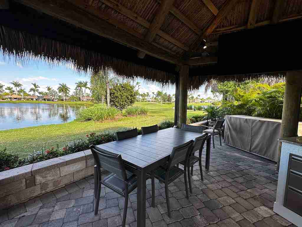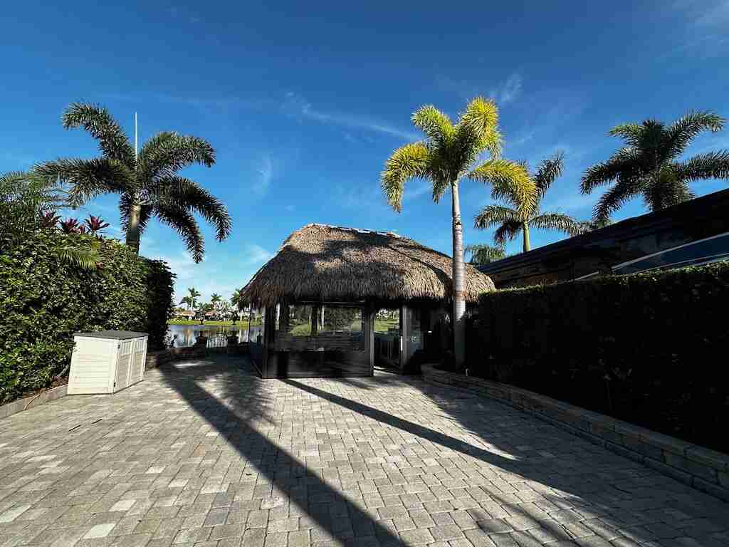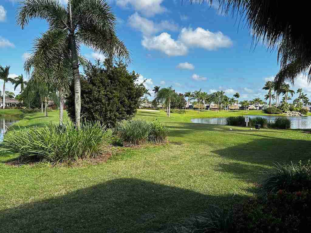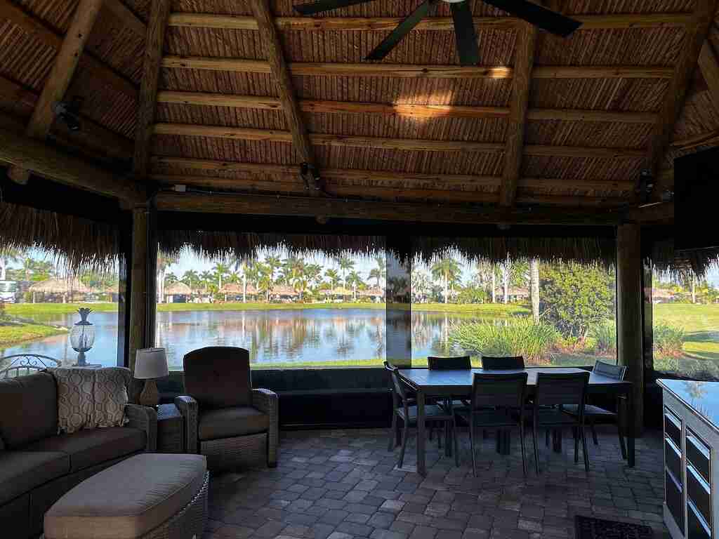 Incredible Panoramic Views Await! This north-facing pull-in lot offers breathtaking vistas of two lakes adorned with mesmerizing lighted waterfalls and some of the most spectacular sunsets you’ll ever witness. The well-appointed, LARGE tiki is a delight, featuring a stylish kitchen/bar with a granite-topped surface. For year-round comfort, the new 415 sq ft tiki is equipped with full remote controlled screens, providing warmth on chilly nights without sacrificing the view. The outdoor space boasts raised beds with stunning landscape walls, pavers, and a variety of mature plantings and trees. This lot comes fully furnished, With every detail carefully considered, this property is move-in ready and an absolute must-see for those seeking a harmonious blend of natural beauty and functional elegance. The wiring, screens, tiki etc. were all replaced/built in spring 2024. Don’t miss the chance to call this haven yours!