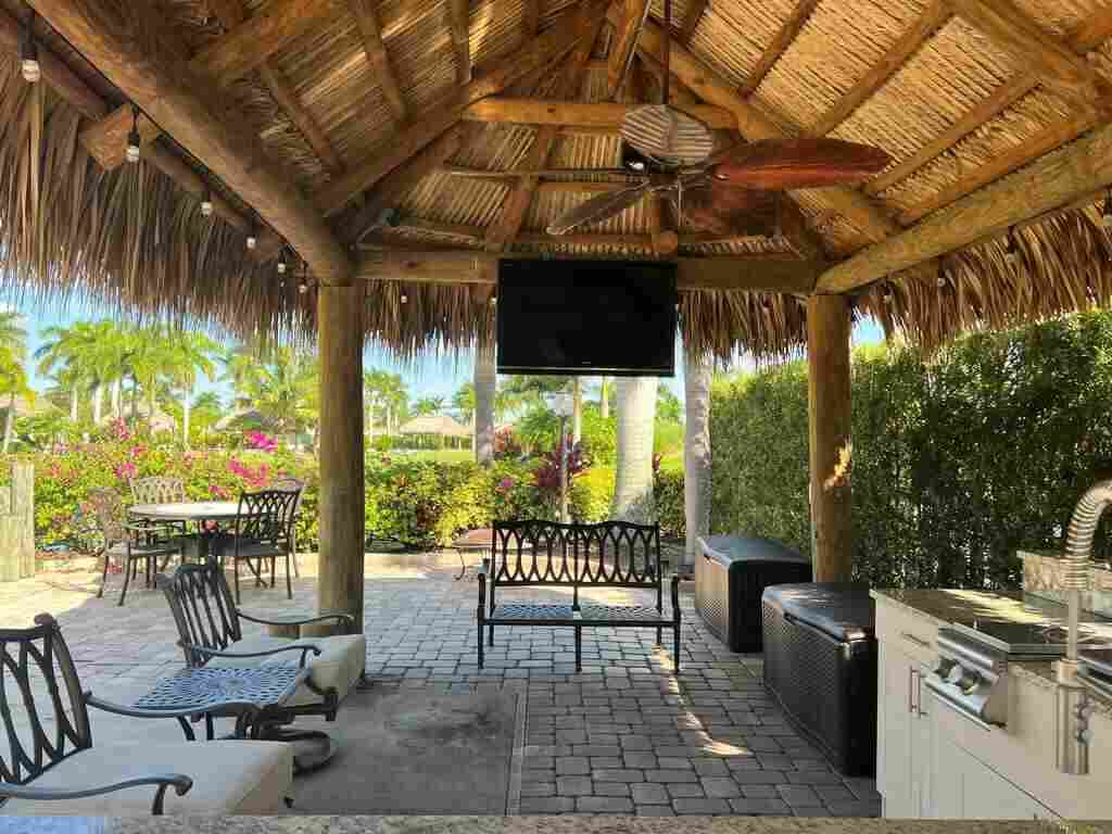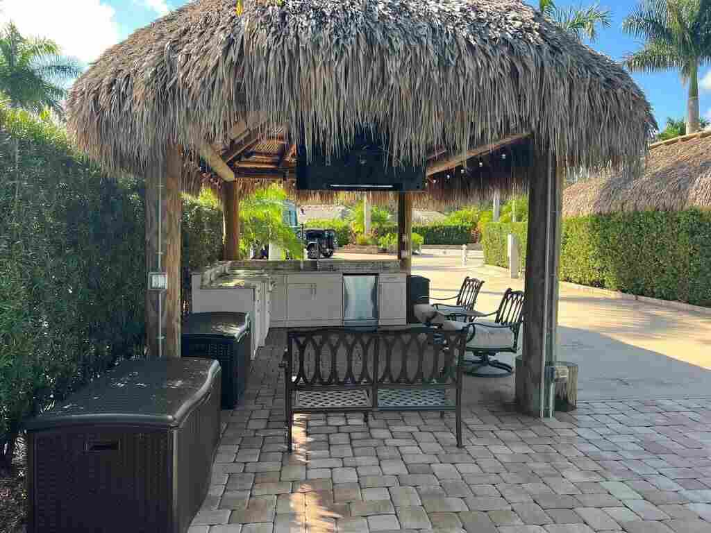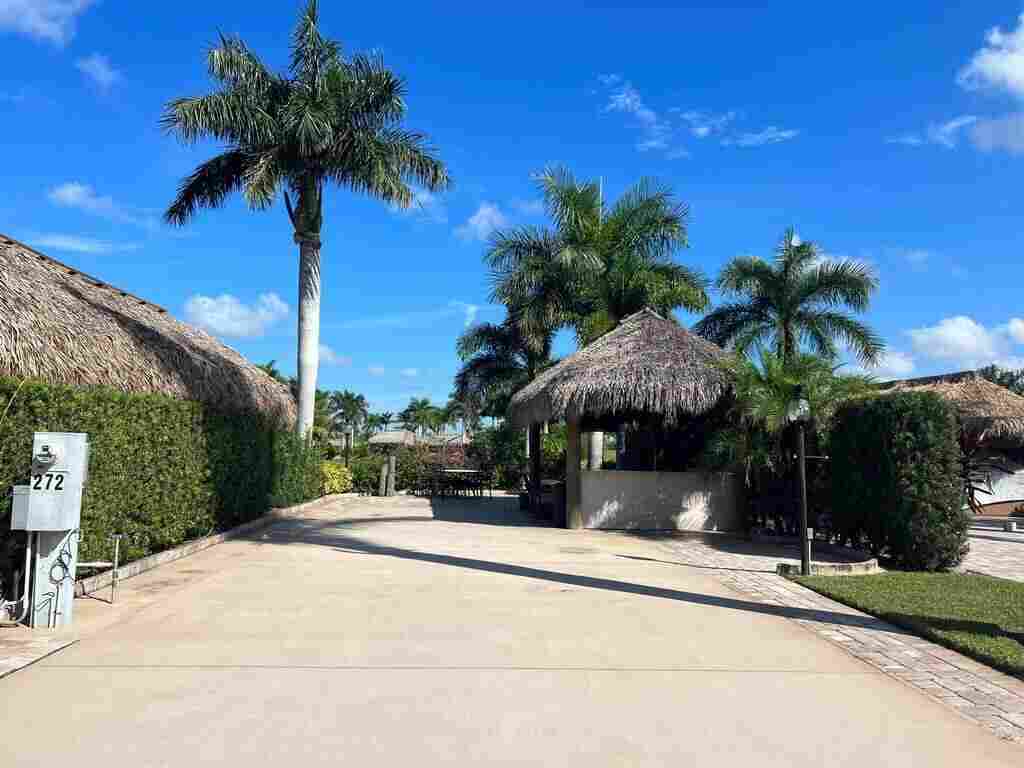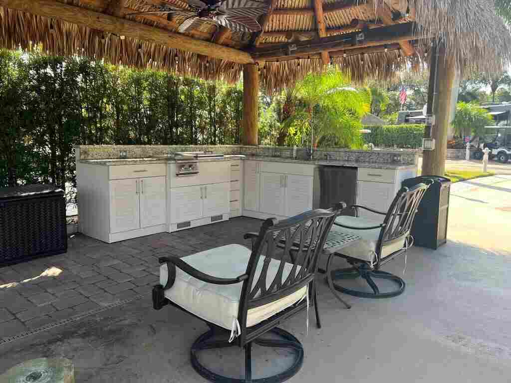 Peaceful Waterfront Lot with Tropical Views and Cozy Tiki Experience tranquility on this serene pull in waterfront lot, where you can enjoy views of the water, golf course, and lush tropical landscaping from inside your coach or under the tiki. Thoughtfully positioned for privacy and ambiance, the tiki boasts a well-designed kitchen with white shutter-style cabinets and complementary granite countertops, blending sophistication with functionality. Fully equipped with a sink, refrigerator, and cooktop, the kitchen is ready for gatherings with family and friends. Conveniently located just a short walk from the clubhouse, you’ll have easy access to organized social events and entertainment, as well as the main pool, spa, and sports complex with tennis, pickle ball, bocce, and shuffleboard courts. The tiki comes fully furnished with a TV and comfortable seating, making it the perfect place to unwind, relax, or entertain friends in style.
