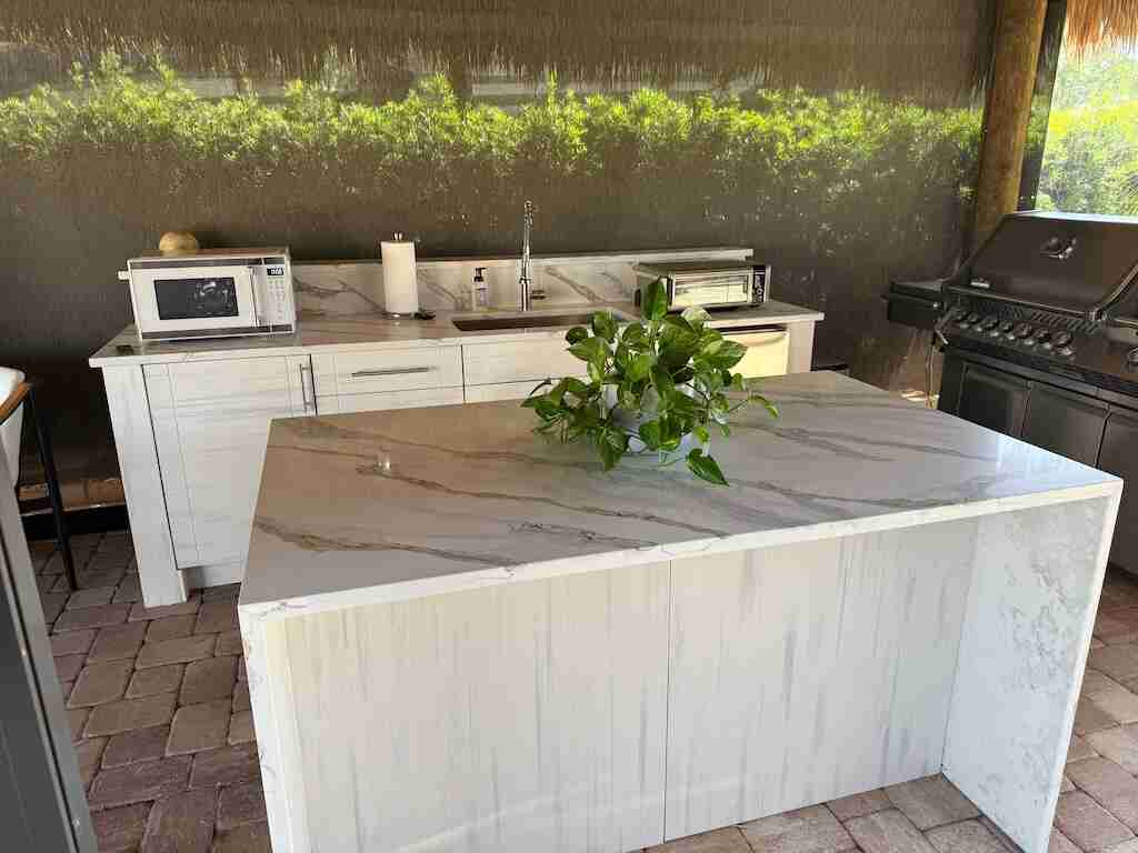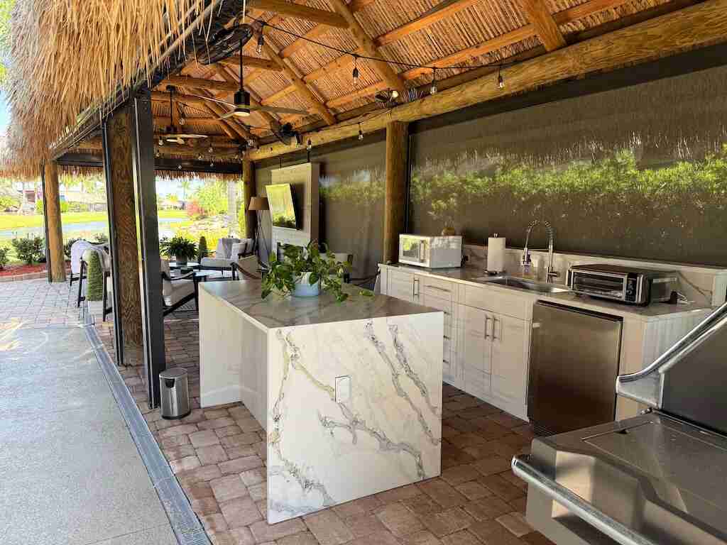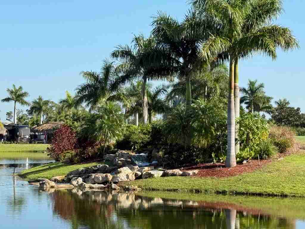 Best in Class – NOW REDUCED! Simply Stunning Lot with Breathtaking Waterfall View! This exceptional pull-in lot offers a prime location, just steps away from the clubhouse and all community amenities. Surrounded by mature landscaping that ensures privacy on both sides, it provides the perfect retreat to sit and listen to the waterfall and watch the golfers tee off nearby. Built in 2021, the spacious tiki features automatic screens and a fully equipped, beautiful quartzite kitchen complete with an island featuring a waterfall edge. The elegant TV wall with a cozy fireplace insert adds to the luxurious feel. Included in the price are all furnishings, storage units, plus a top-of-the-line $5,000 Napoleon grill! Tastefully decorated with a warm, homey touch, this lot is the perfect spot for you and your coach. With that incredible waterfall view and the gorgeous amenities, it’s an opportunity you won’t want to miss — this gem won’t last long!