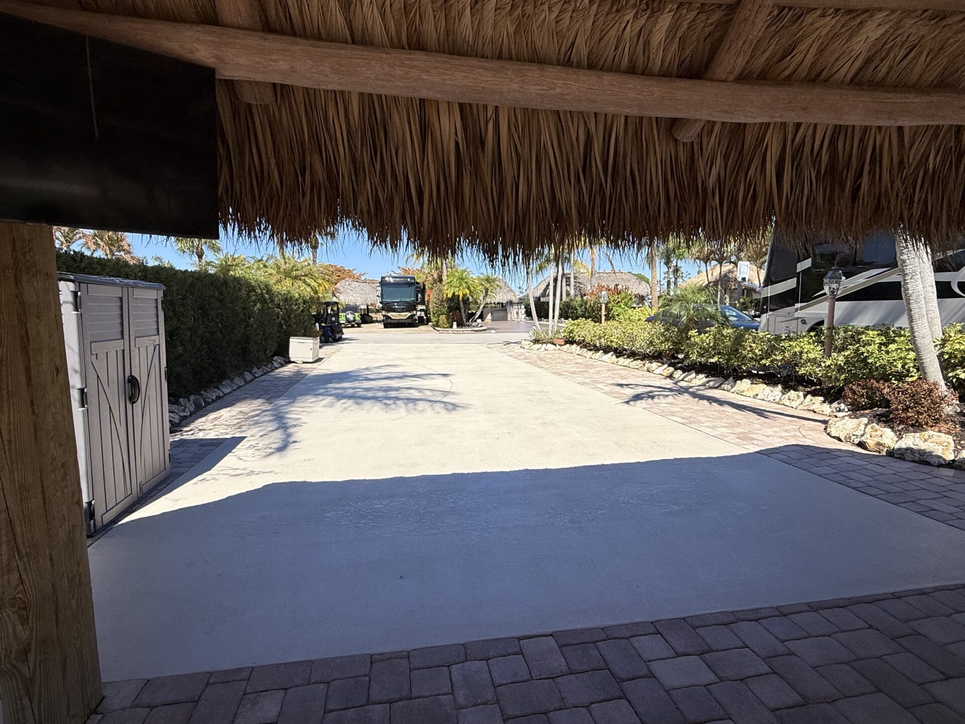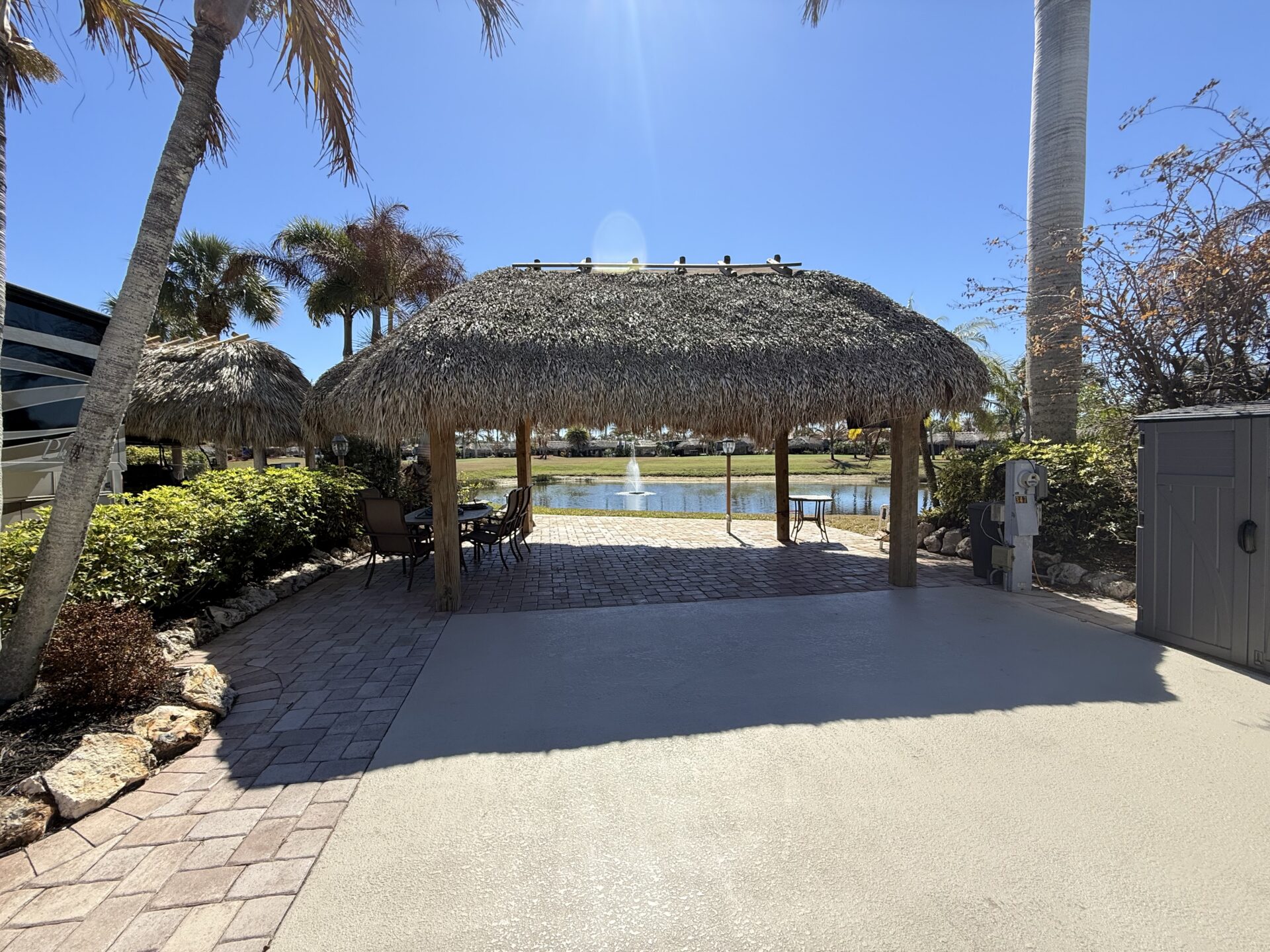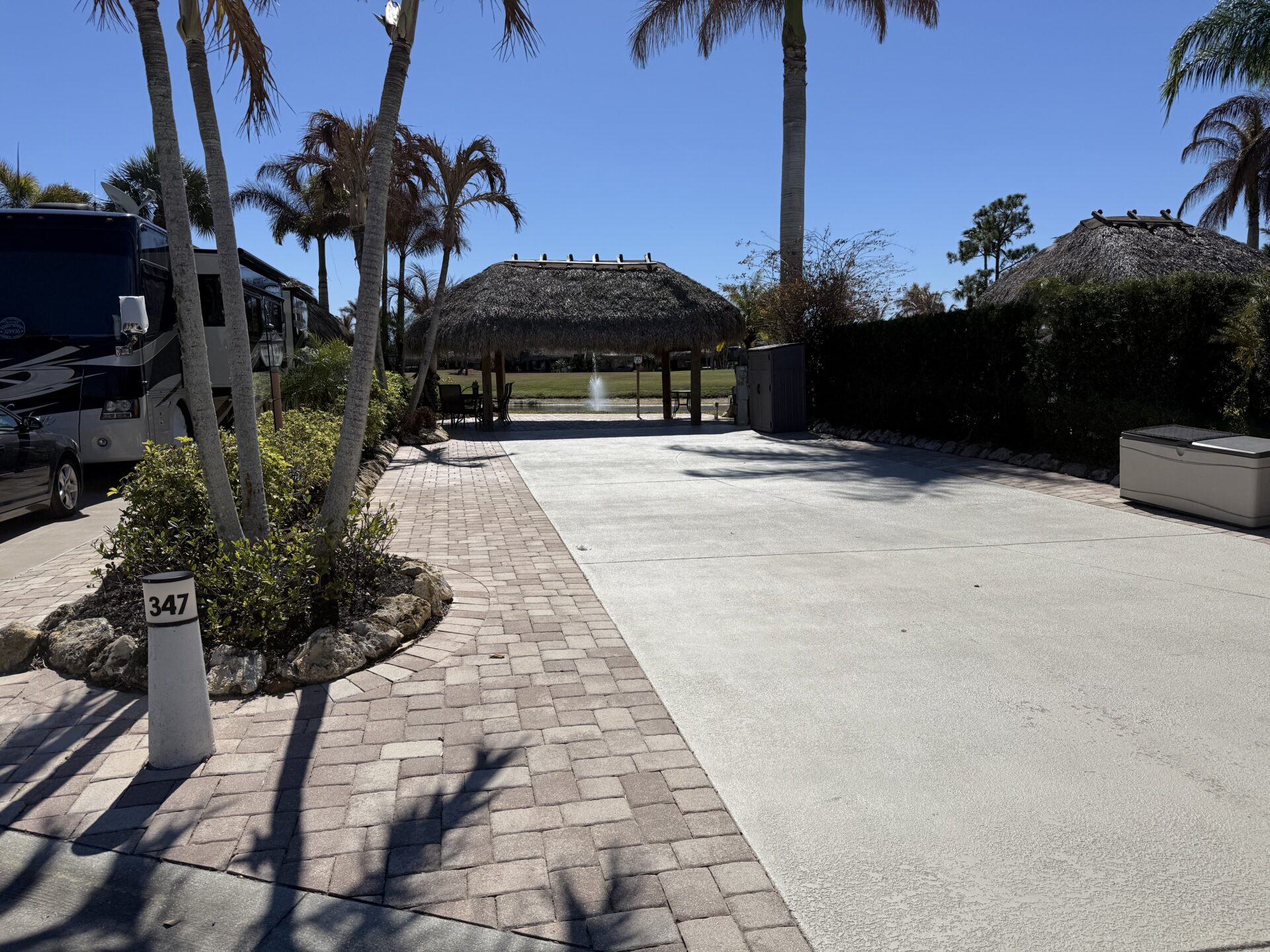 Nestled within an exclusive gated RV resort, this exceptional north-facing lot offers the perfect blend of privacy, tranquility, and upscale outdoor living. A spacious paver patio extends across the rear of the property, creating an inviting setting for relaxing or entertaining beneath a large, beautifully crafted tiki hut.