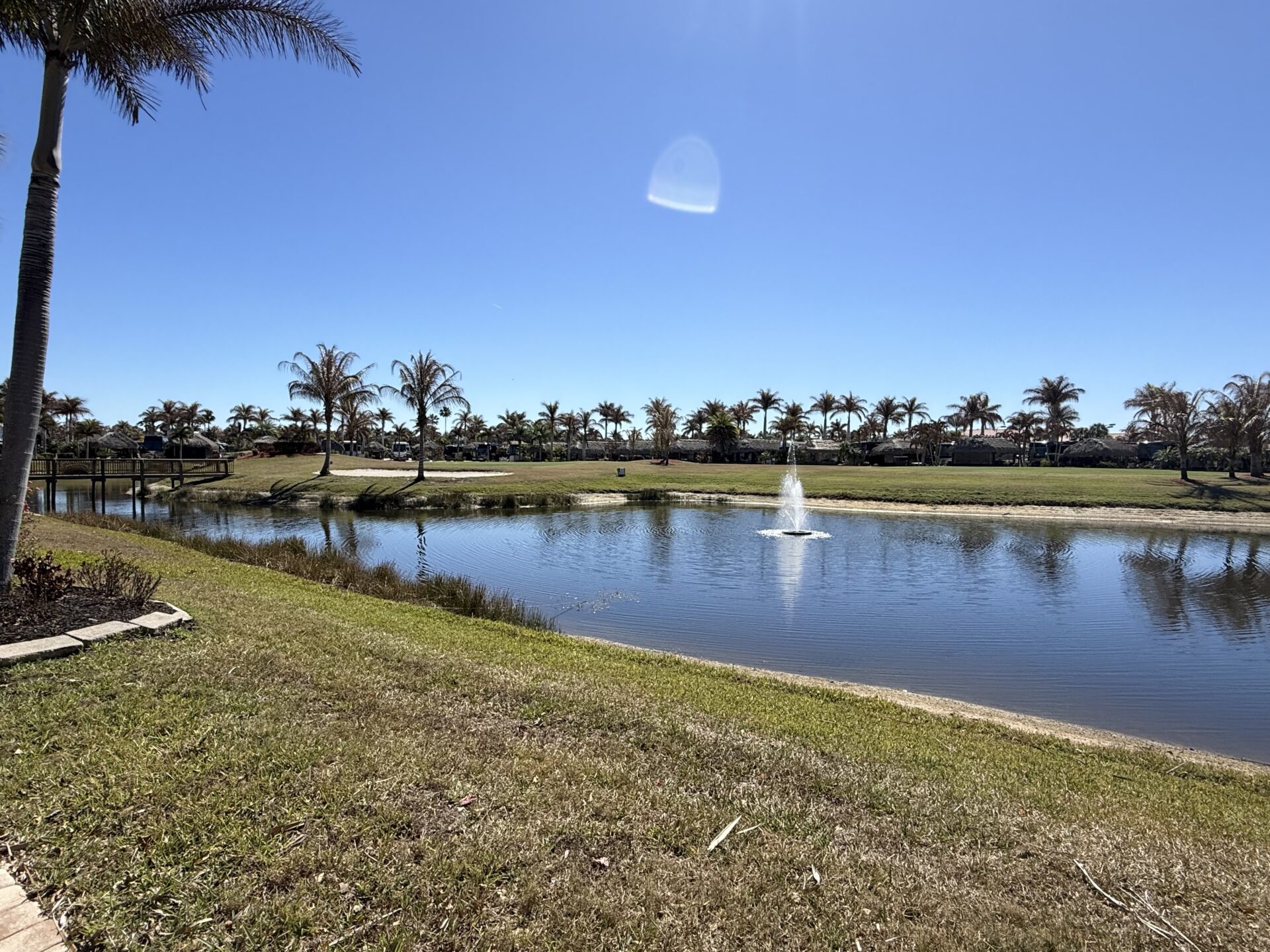 Surrounded by mature trees and lush, established landscaping, the space feels serene and secluded while still capturing picturesque views. From the patio, enjoy a peaceful outlook of a softly illuminated water fountain and a charming wooden bridge that leads toward the golf green — a truly scenic backdrop both day and night.
