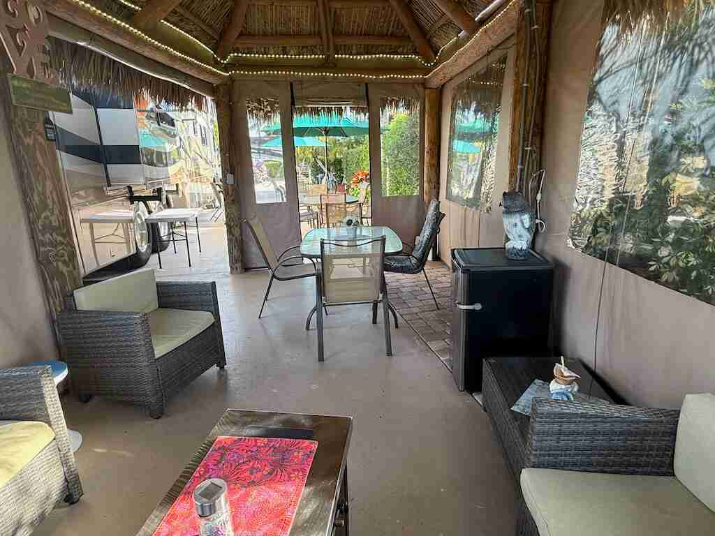 Make an offer! Discover the epitome of convenience and luxury in this exceptional listing, perfectly positioned between the serene north and east pools and the bustling central clubhouse. Enjoy the best of both worlds with a coveted north-facing orientation and breathtaking golf views from the rear. Step into the thoughtfully designed tiki, entirely enclosed with eisenglass curtains, creating a tranquil retreat for relaxation and entertainment alike. Indulge in the generous seating arrangement while the charming dining table for six sets the stage for memorable al fresco meals. The kitchen area is nicely equipped with a built-in refrigerator, grill, and sink, ensuring seamless outdoor culinary experiences. Additional dining and seating areas out front provide versatility and space for gathering with loved ones. Don’t miss out on the opportunity to experience luxury living at its finest. Schedule your viewing today and make this extraordinary property your own.