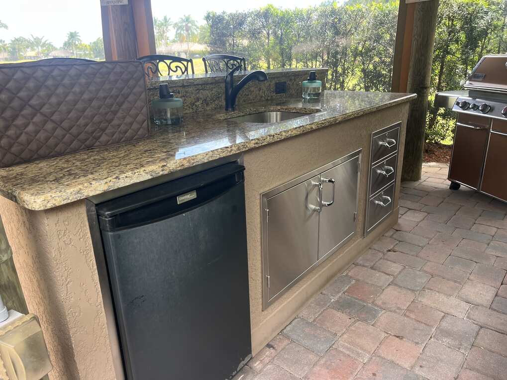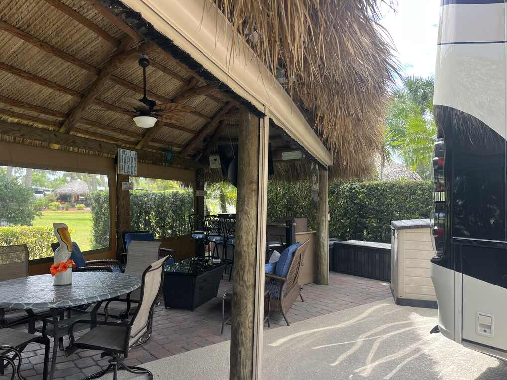 Beautiful 5 star resort in Motor Coach Resort . Enjoy this wonderful lot that is on the golf course with beautiful sunsets. Granite top kitchen with bar area to enjoy outdoor entertainment. Weber grill , stainless steel cabinets for storage ,stainless steel refrigerator with sink.Newly thatched large tiki. Very active resort. The resort has everything that you would want close to shopping , dining and beaches. Mature landscaping , private location. Electric remote controlled roller shades. Resort has 4 pools and hot tubs, pickle ball several courts, golf par 3 golf course, shuffleboard, bocce ball , darts, gym, yoga, water aerobics, tennis, clubhouse ,bike club.Happy hour Fridays 5-7.Eisenglass curtains protecting from rain and wind