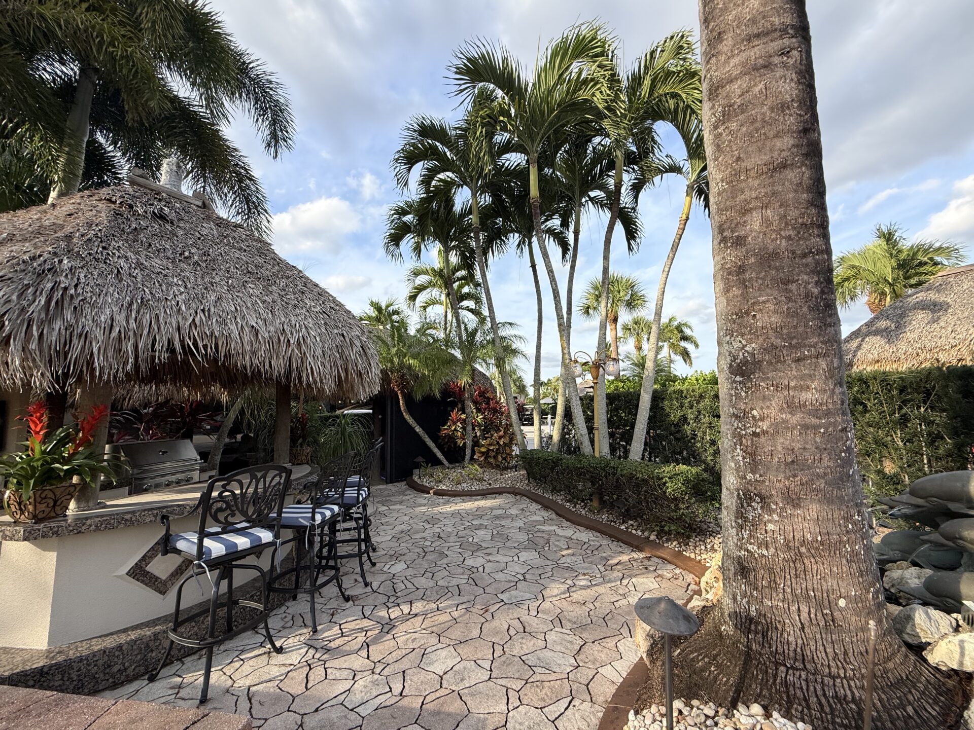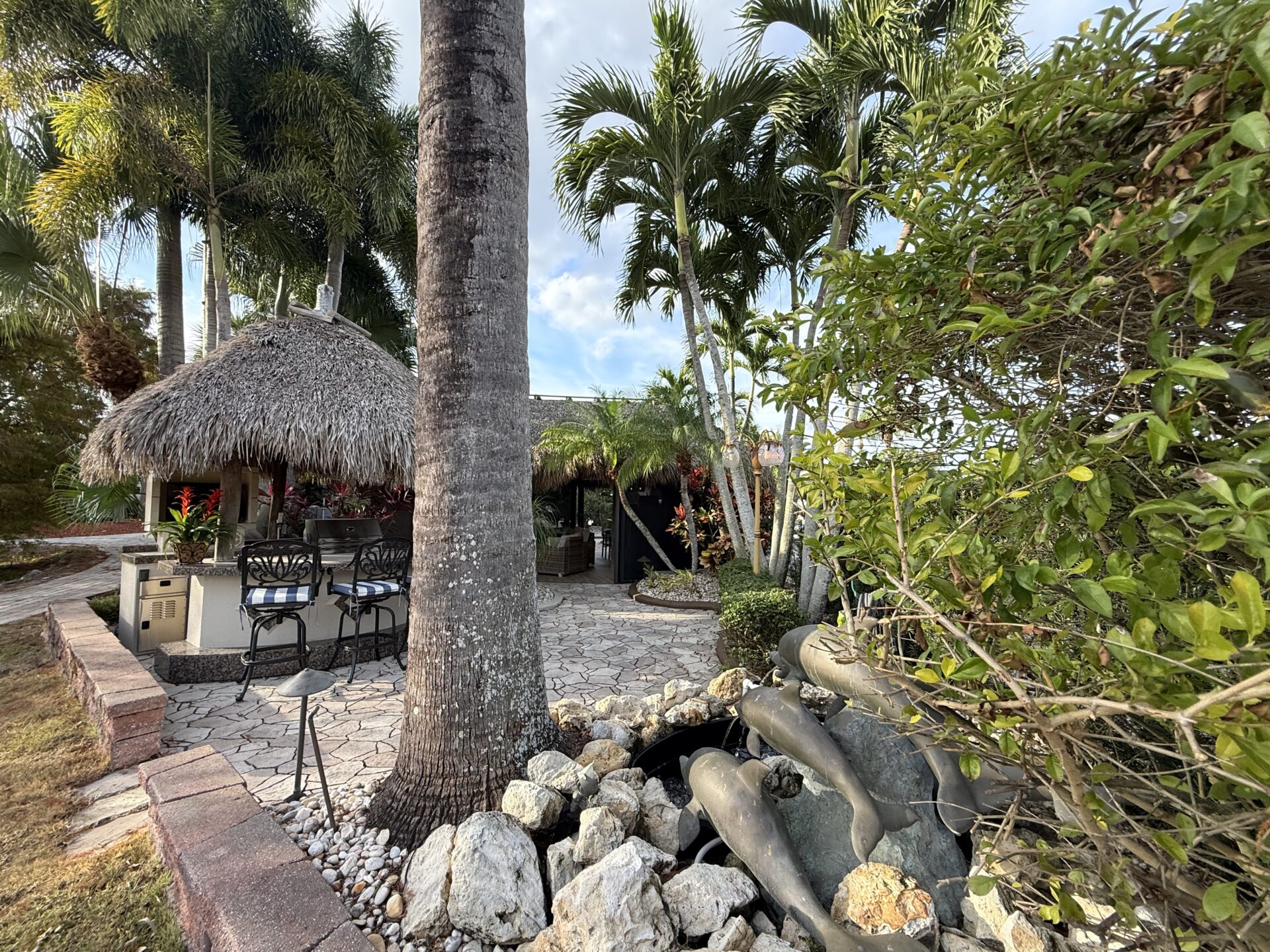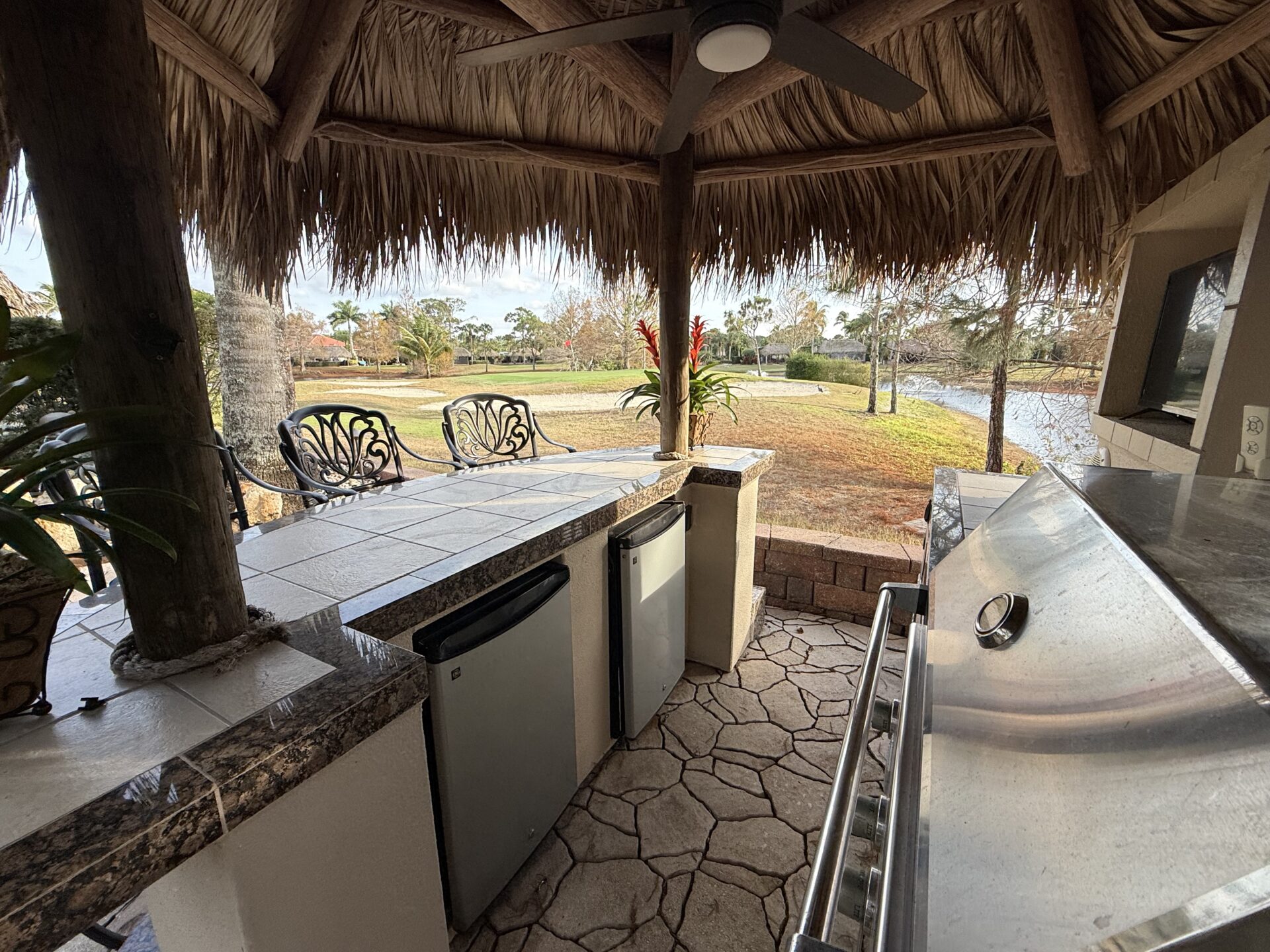 Discover a true gеm thаt rеdefineѕ luxurу and outdoor living! Thіs ѕtunning lot features a large tiki hut with a fully equipped kitchen and the perfect space for relaxation and entertaining. Loaded with amenities, this property offers two water features, including a striking bronze dolphin fountain, separate parking for convenience, and an organic mosquito control system for comfort. The gourmet kitchen boasts a built-in wine chiller, cooktop, paper towel holder, and dishwasher. For entertaining, there’s a separate tiki bar tucked at the rear of the lot overlooking the 14th hole. The bar is fully equipped with built-in grill, 2 beverage refrigerators, TV and built-in audio system, lux furnishings, sound systems, and storage units are included, along with remote-controlled screens for effortless indoor-outdoor living. The lot’s gorgeous landscaping and lighting enhance its beauty day and night, with lighted fountains in both the front and rear and picturesque views of the golf course.
