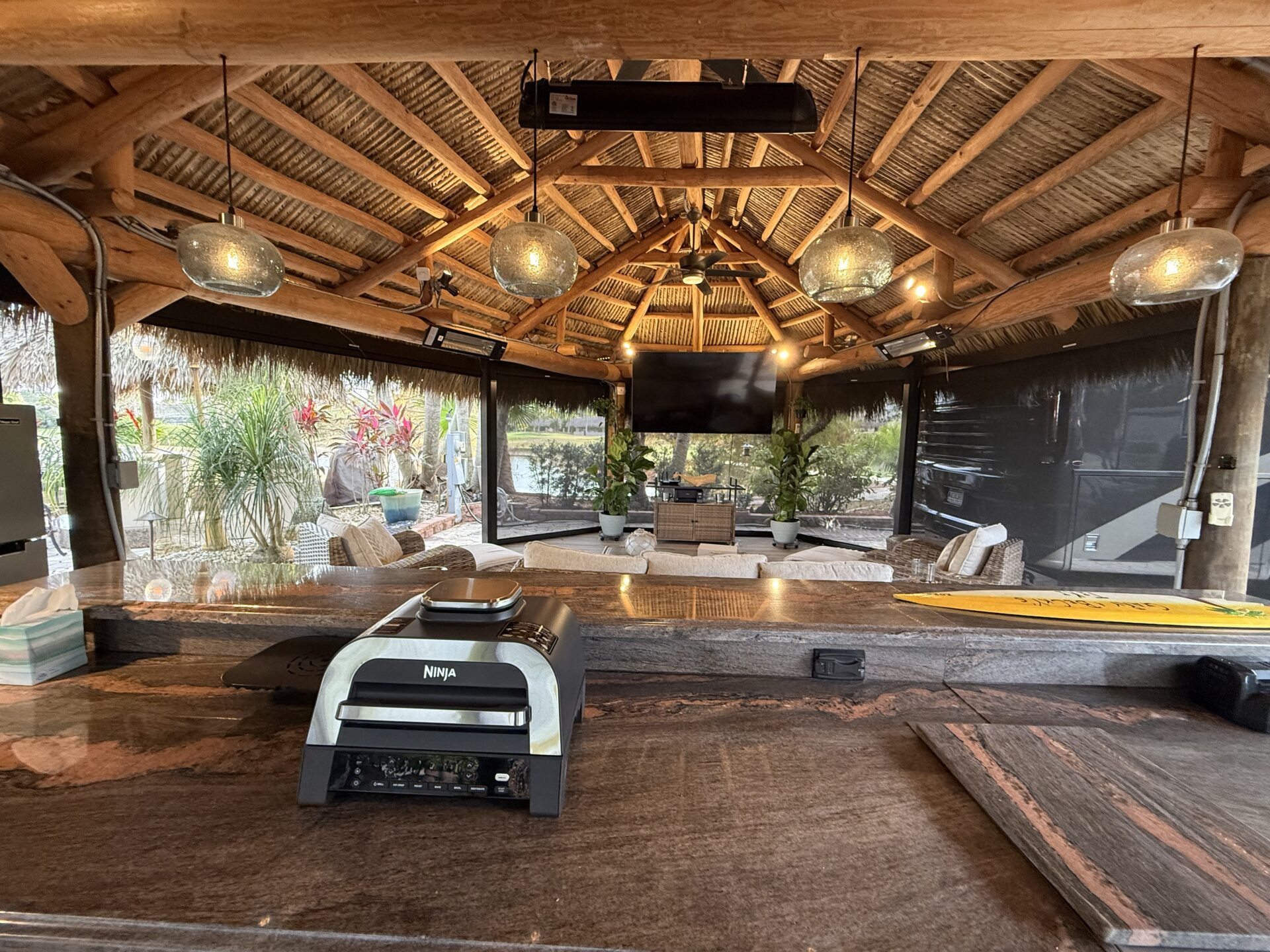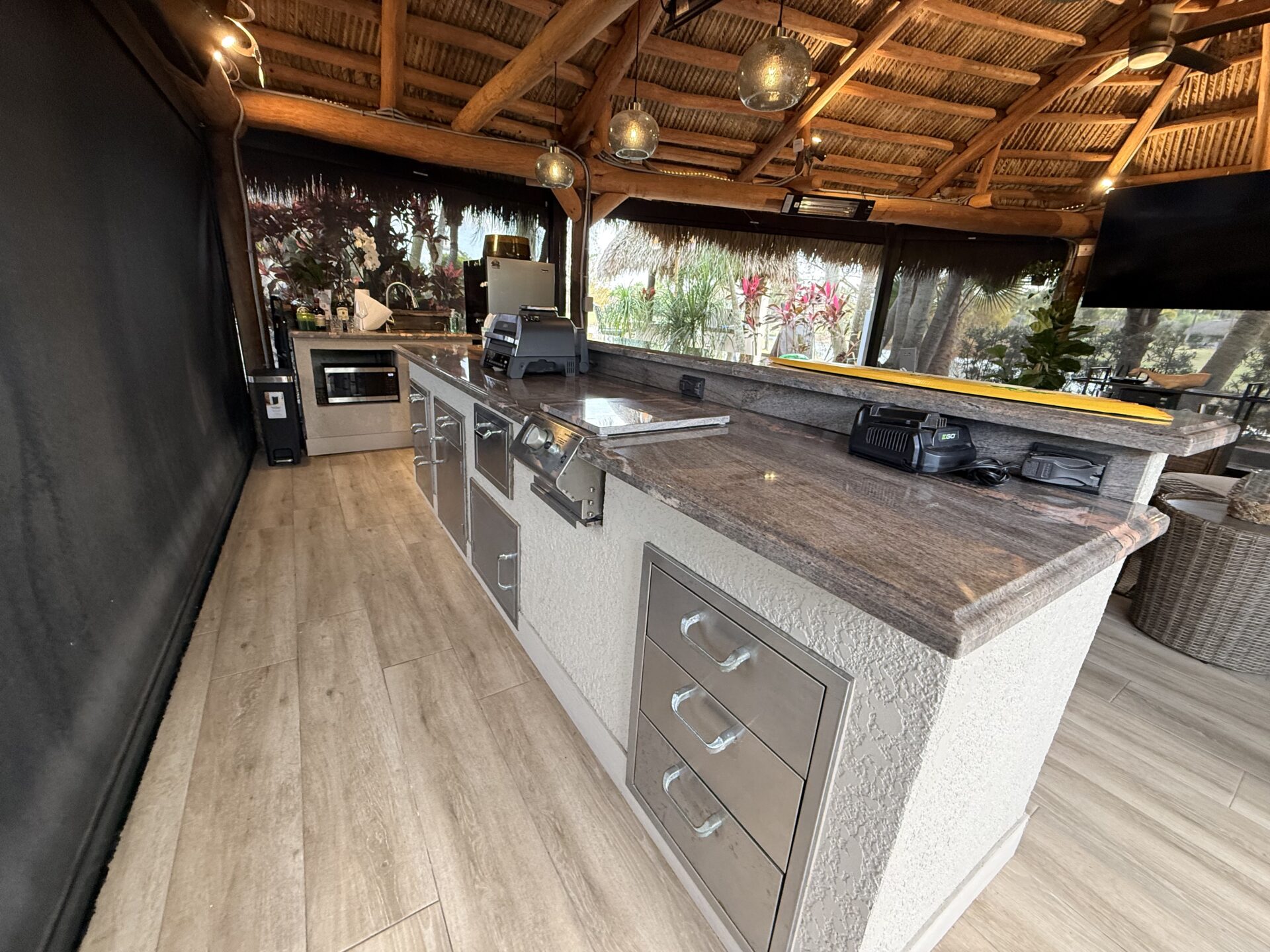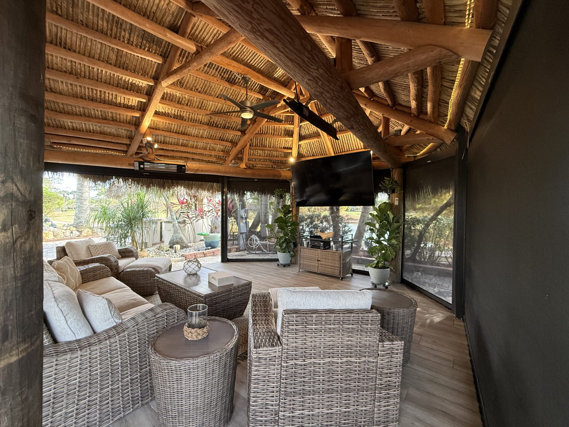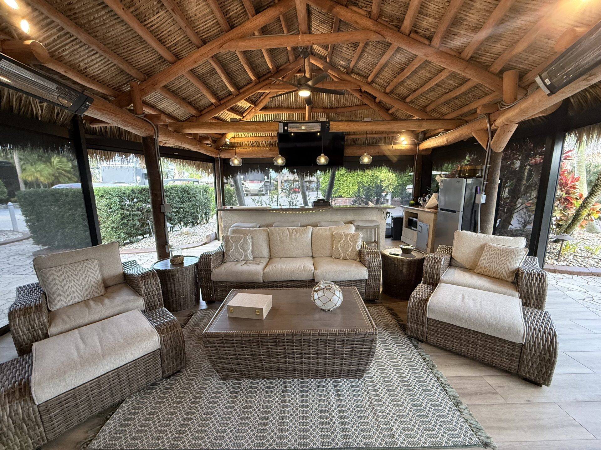 Discover a true gеm thаt rеdefineѕ luxurу and outdoor living! Thіs ѕtunning lot features a large tiki hut with a fully equipped kitchen and the perfect space for relaxation and entertaining. Loaded with amenities, this property offers two water features, including a striking bronze dolphin fountain, separate parking for convenience, and an organic mosquito control system for comfort. The gourmet kitchen boasts a built-in wine chiller, cooktop, paper towel holder, and dishwasher. For entertaining, there’s a separate tiki bar tucked at the rear of the lot overlooking the 14th hole. The bar is fully equipped with built-in grill, 2 beverage refrigerators, TV and built-in audio system, lux furnishings, sound systems, and storage units are included, along with remote-controlled screens for effortless indoor-outdoor living. The lot’s gorgeous landscaping and lighting enhance its beauty day and night, with lighted fountains in both the front and rear and picturesque views of the golf course.