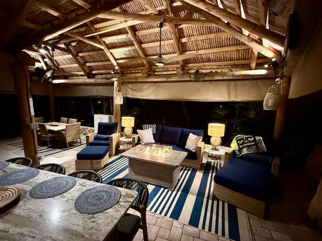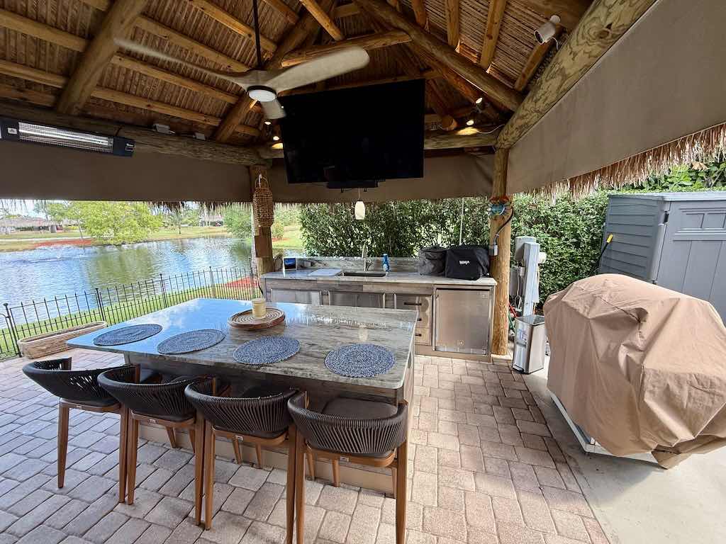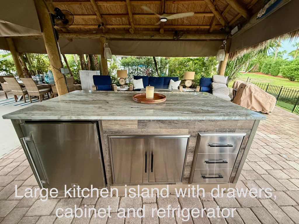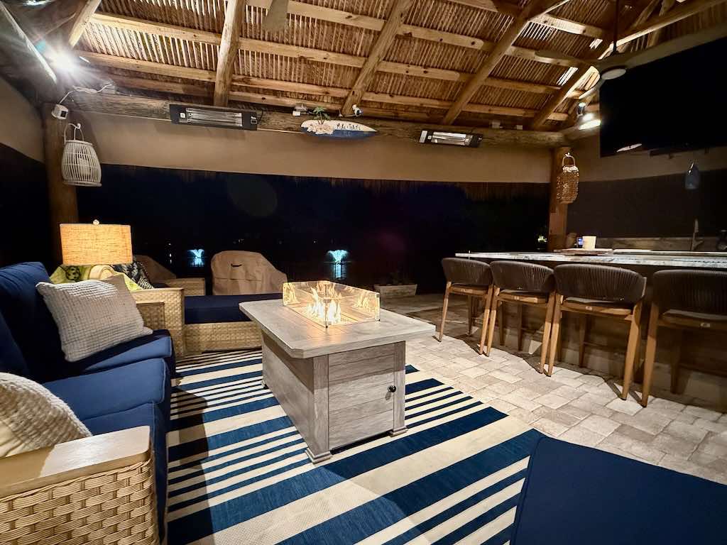 The L-shaped tiki, newly built in 2023, is a showstopper! It features a marine-grade galley kitchen with bar seating, built-in appliances, and upgraded finishes that make entertaining effortless. The space is fully furnished with top-of-the-line outdoor furniture, including a plush sofa, lounger, fire pit coffee table, and a large dining table—perfect for gatherings with family and friends.