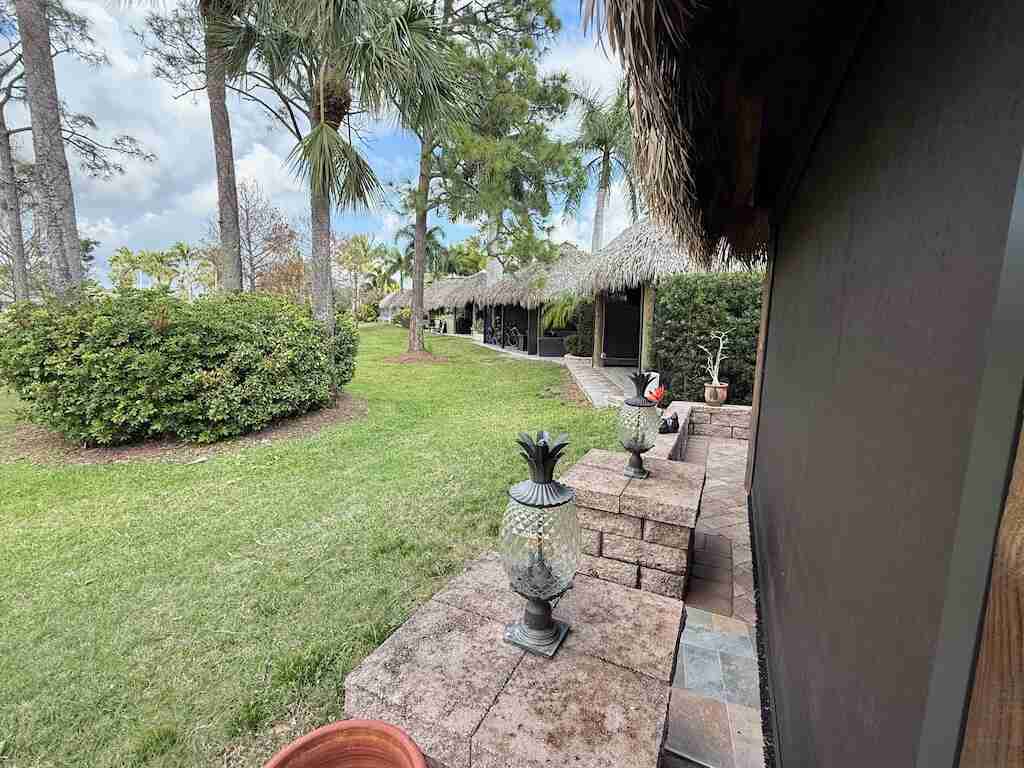 Immaculate Corner Lot with Exceptional Views & Luxury Upgrades! Pride of ownership shines in every detail of this meticulously maintained 3,853 sq. ft. corner lot, perfectly situated across from the clubhouse, pool, hot tub, and sports facilities. Offering both convenience and luxury, this premium lot is designed for those who love to entertain and relax in style. The spacious tiki hut built in 2022 is an entertainer’s dream, enclosed with electric screens for year-round enjoyment. Constructed with large decorative posts and topped with 20-year artificial fronds, it exudes both durability and elegance. The upgraded L-shaped outdoor kitchen features marine-grade cabinetry, providing both beauty and functionality. With stunning golf course views and a picturesque backdrop of the lake’s three lighted fountains, this lot is a rare find. Move-in ready with upscale furnishings, and completely equipped kitchen—just bring your coach and start living the dream! This gem won’t last long!