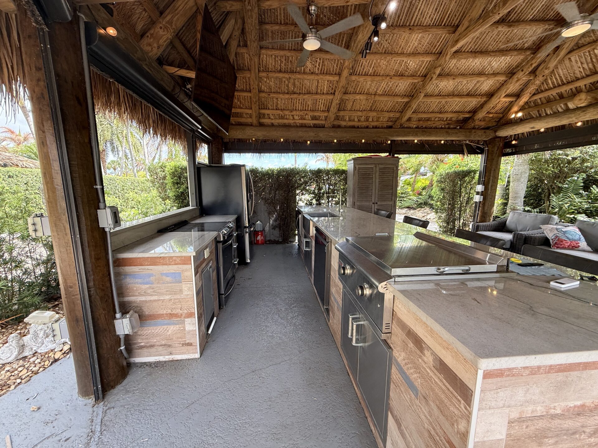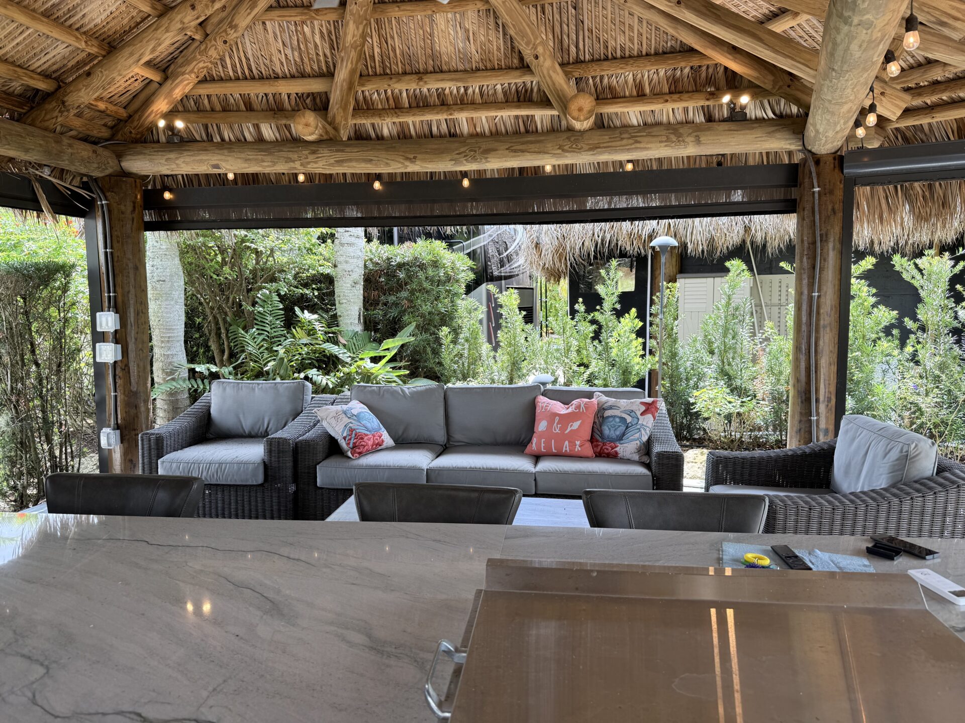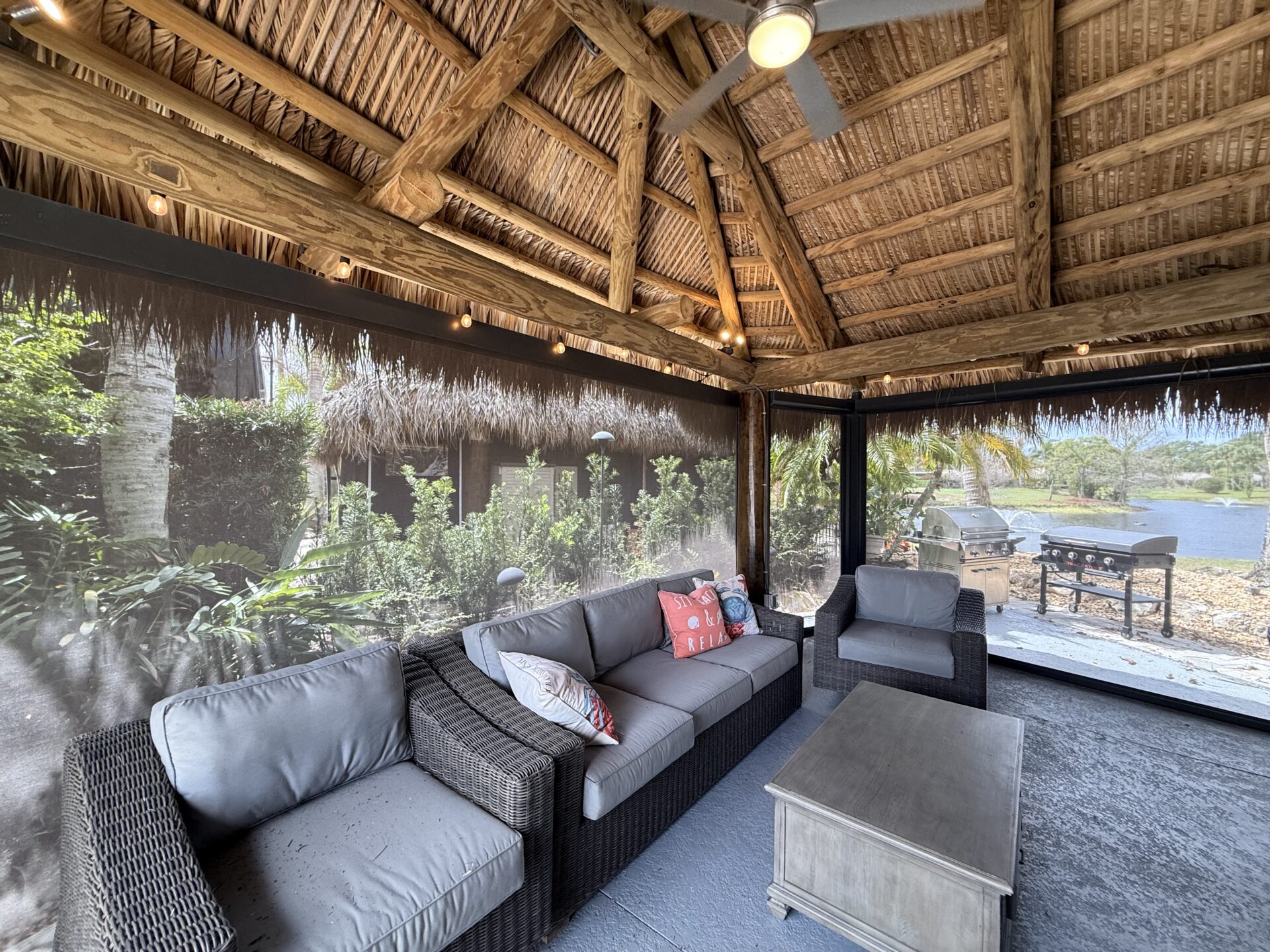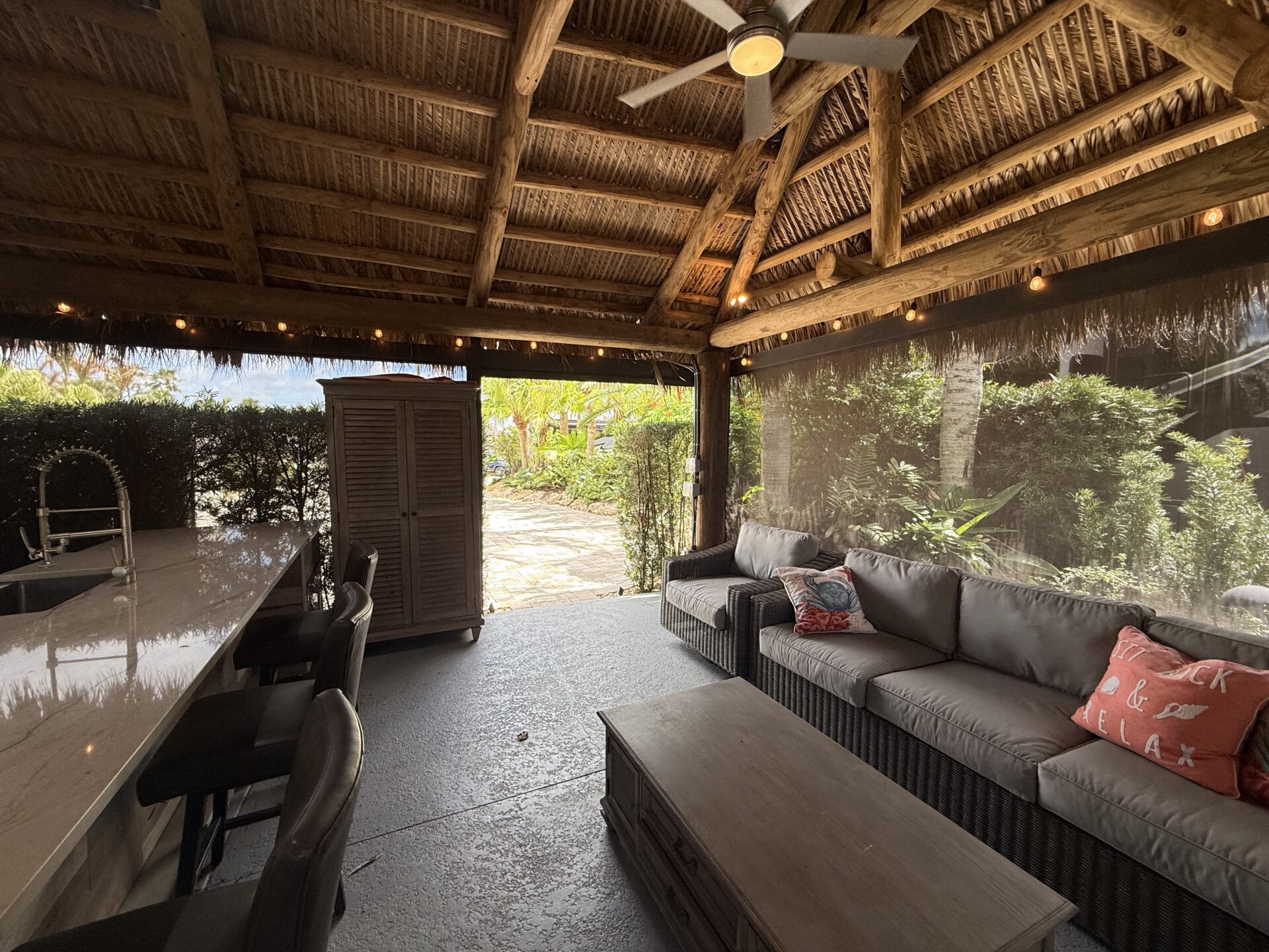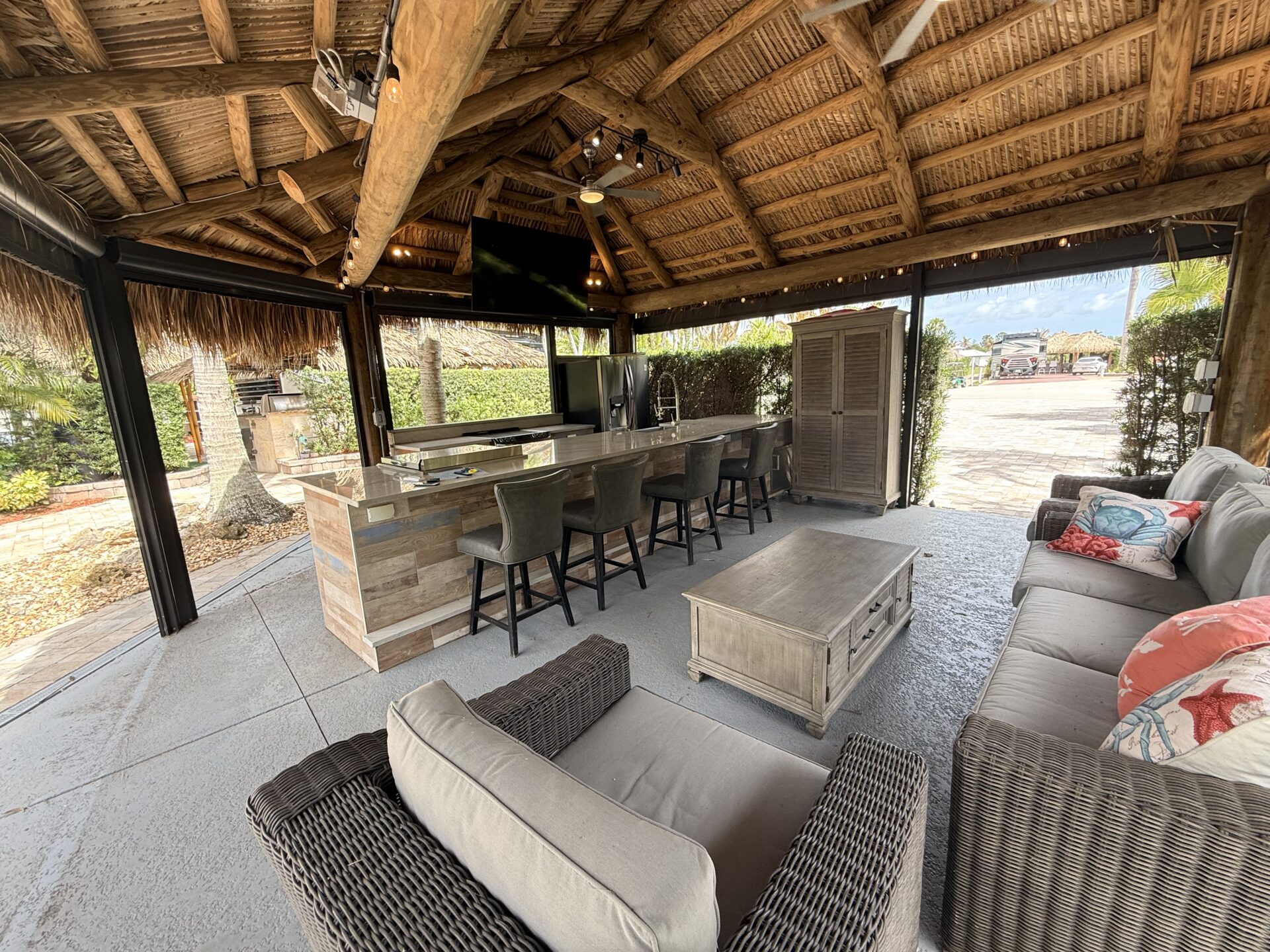 Designed with both privacy and entertaining in mind, the meticulously landscaped grounds feature a substantial hedge and strategic placement that create a secluded, tranquil setting. A distinctive raised patio anchors the outdoor living space, complemented by a generous tiki structure that invites relaxation and social gatherings alike.