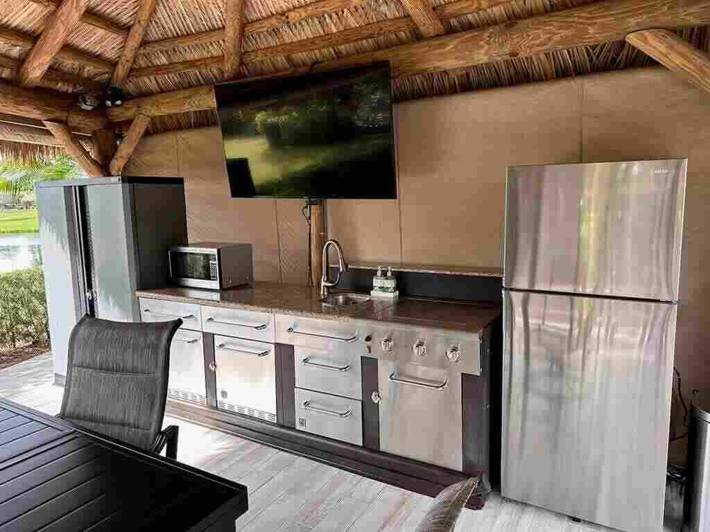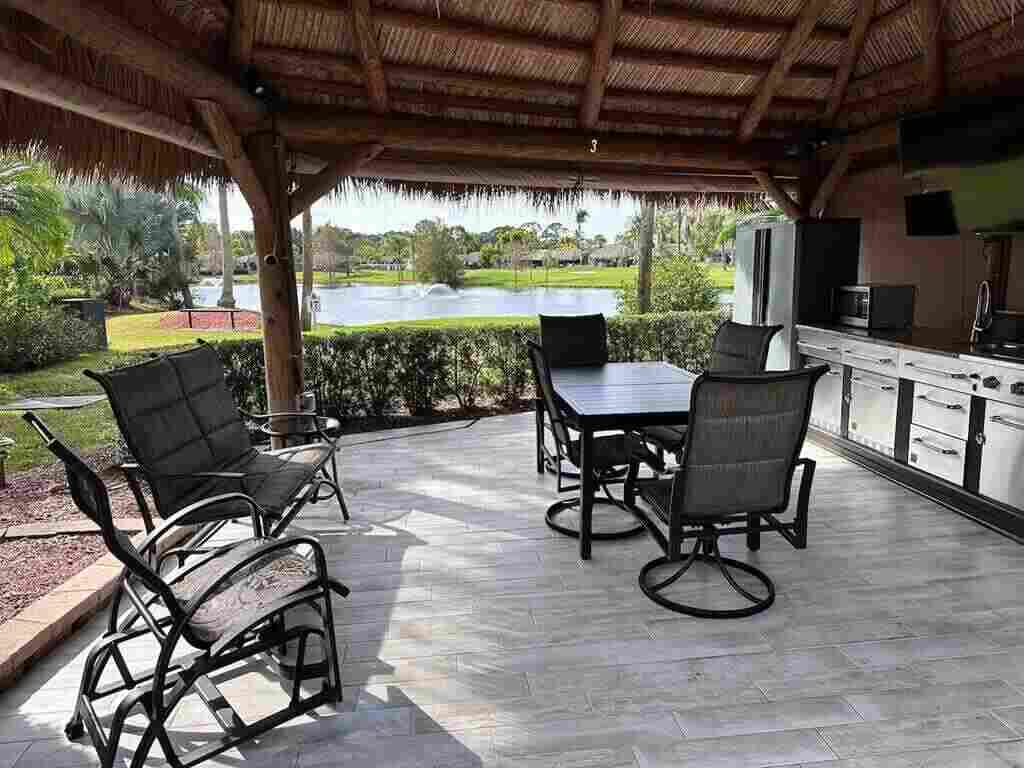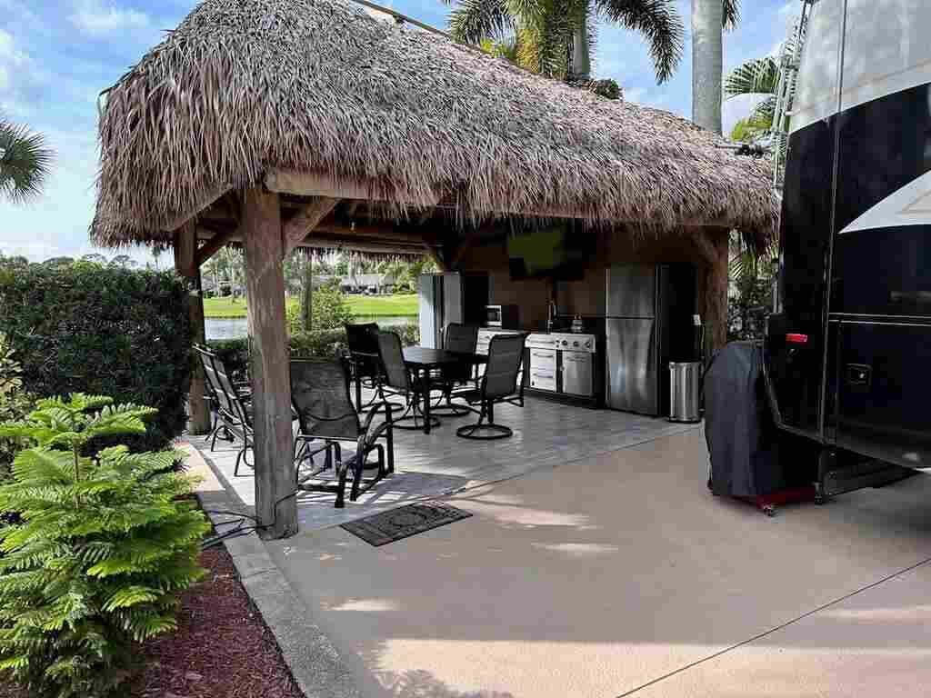 Nestled in the heart of the resort, this prime lot boasts an enviable proximity to the clubhouse, making it a focal point in one of the most sought-after areas. Revel in the breathtaking panorama of two majestic fountains and a serene lake, creating an idyllic backdrop for your retreat. The expansive tiki, showcases a well-appointed kitchen. Your culinary adventures are elevated in this stylish and functional space. The meticulously designed lot features a fully paved oasis adorned with mature palm trees, providing both shade and a touch of tropical charm. Raised landscape beds add an extra layer of sophistication, enhancing the overall aesthetic appeal of the surroundings. Step into luxury, as this property comes fully furnished, ensuring a seamless transition into your new haven. The open green space provides a spacious feeling. Opportunities like these are rare, and this one is poised to be snapped up quickly.