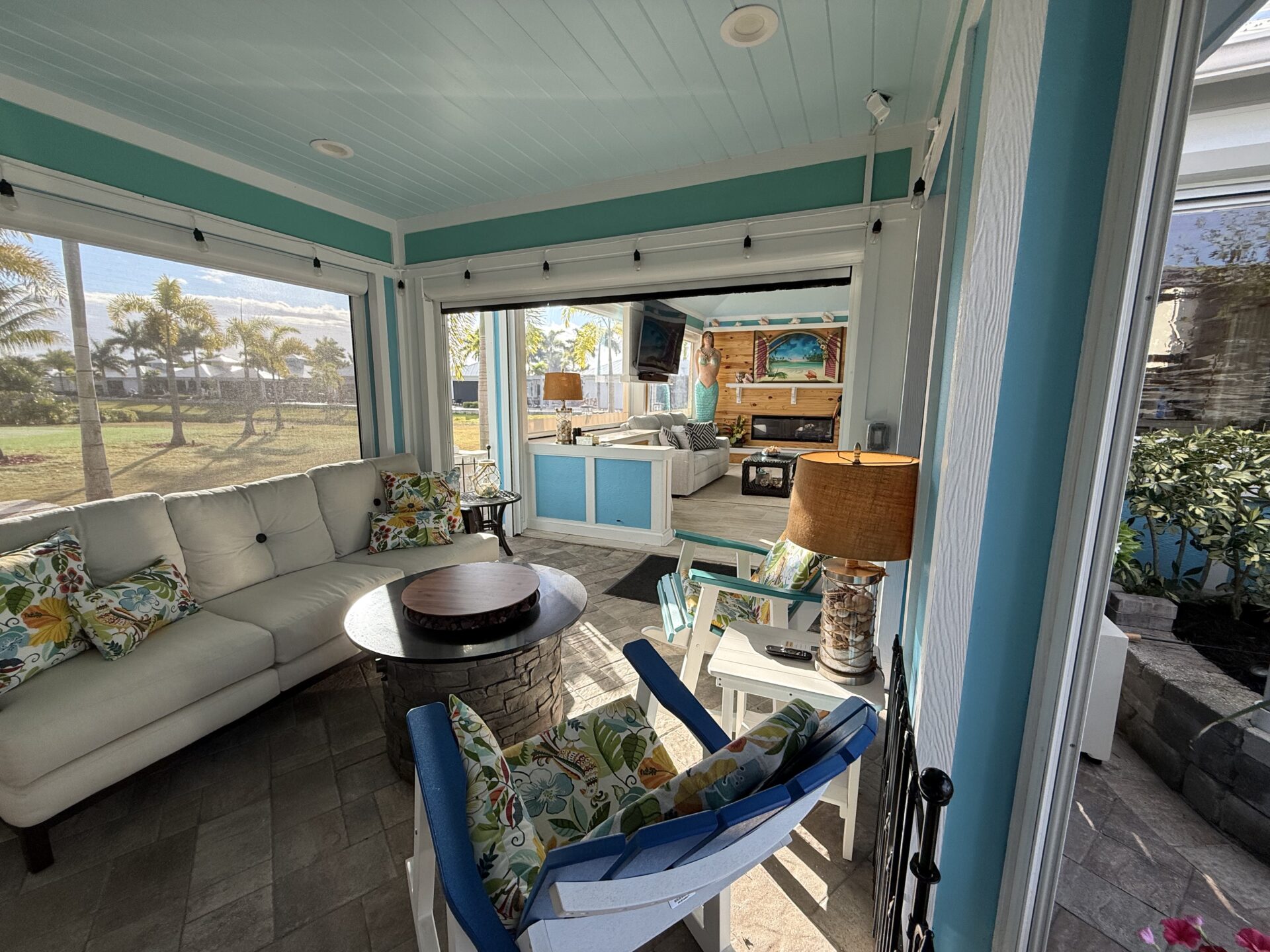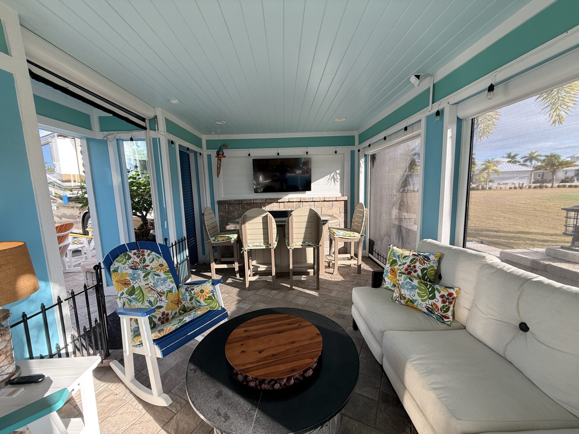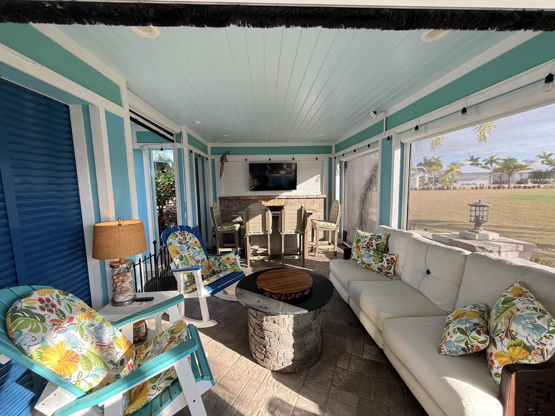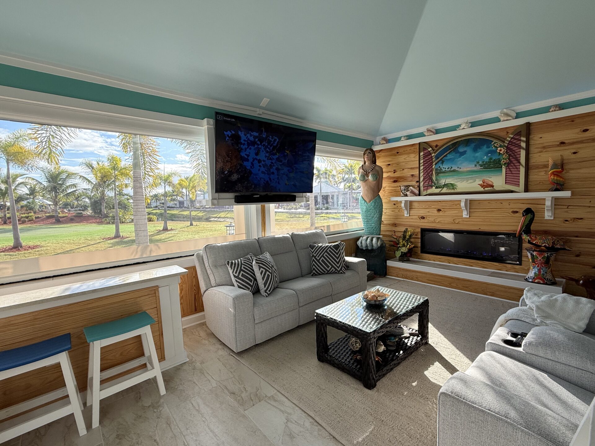 Step outside to your private pergola-covered lounge — a perfect setting to unwind, watch TV, or entertain while enjoying peaceful golf course and waterfall views. Every detail of the décor is colorful, curated, and full of personality, delivering a home that feels both upscale and effortlessly inviting.