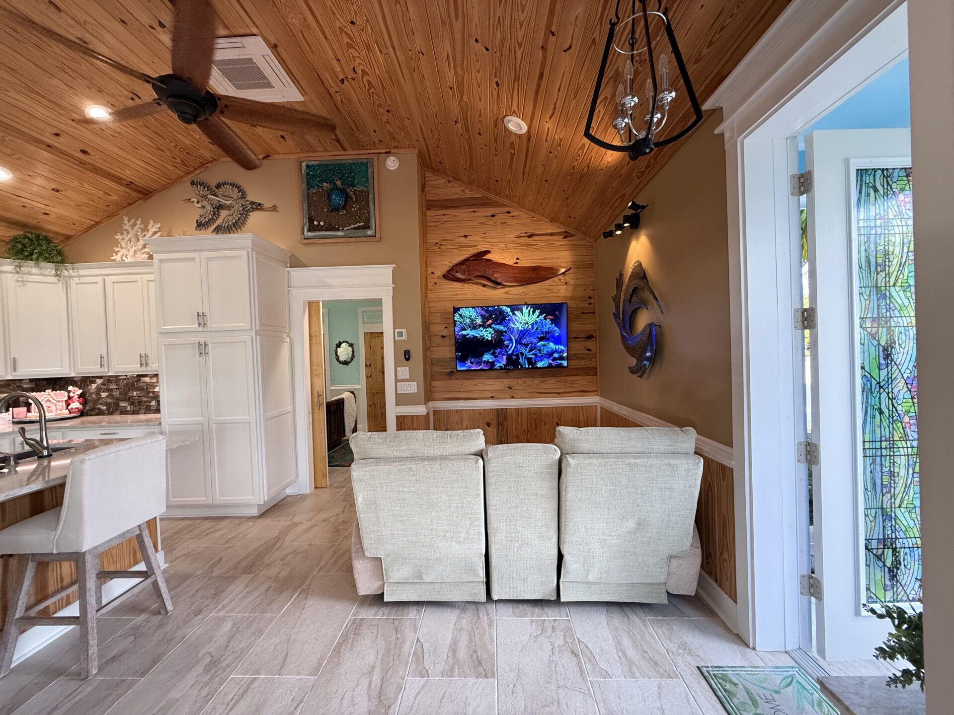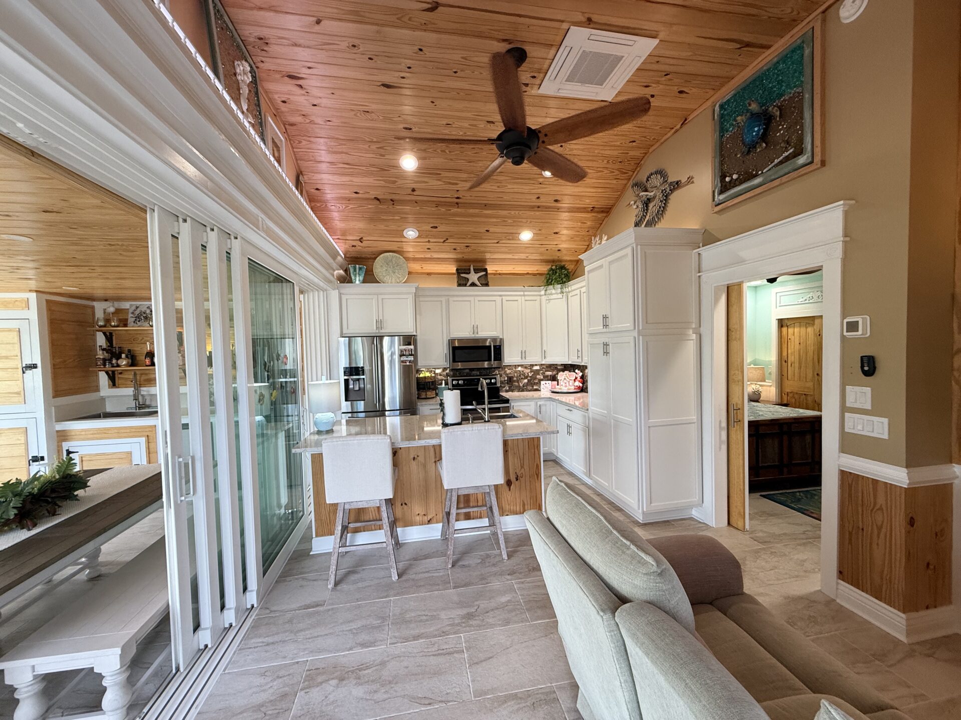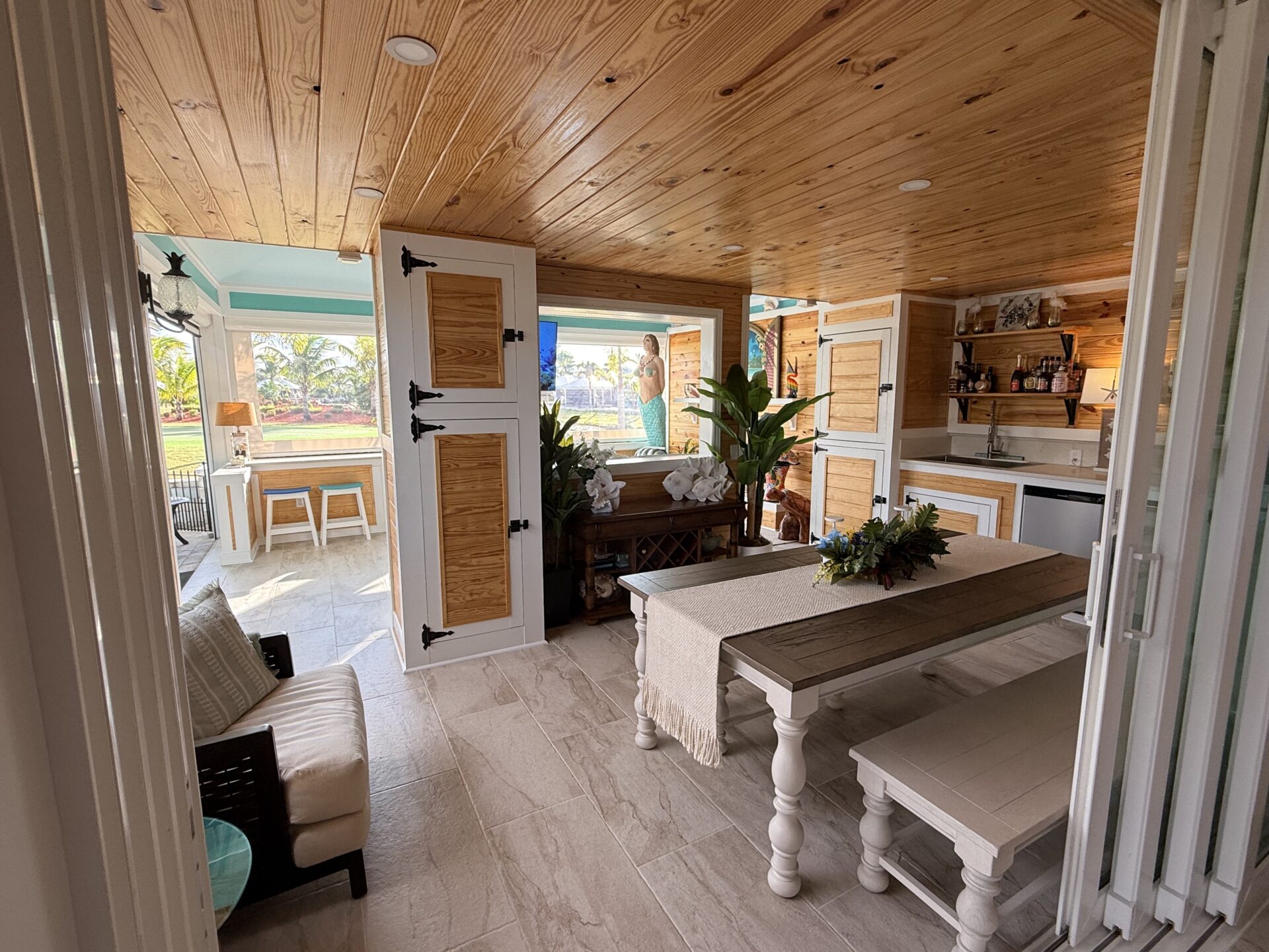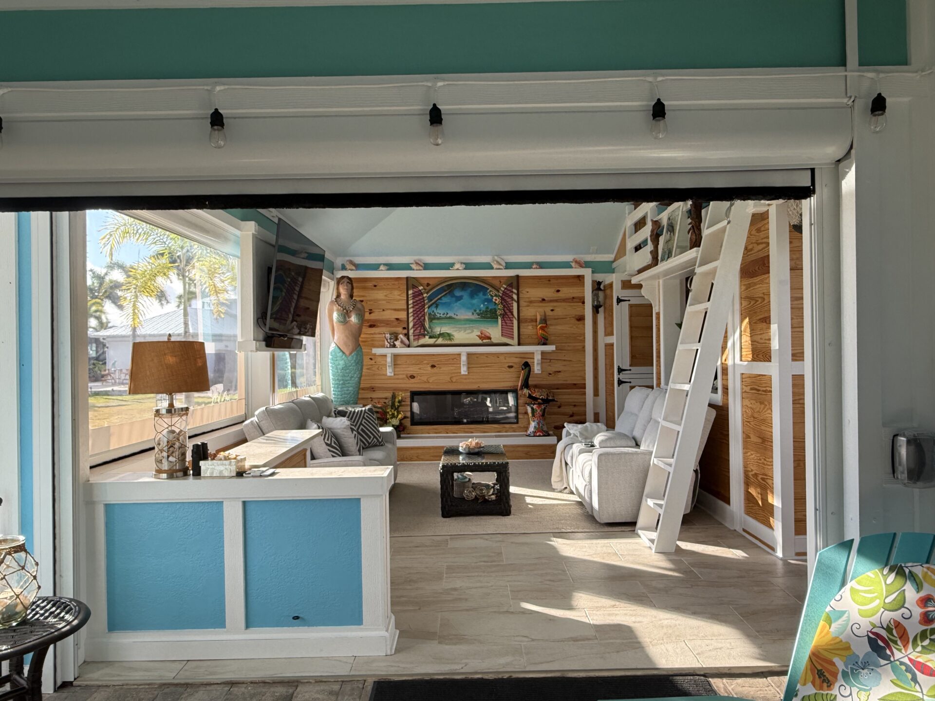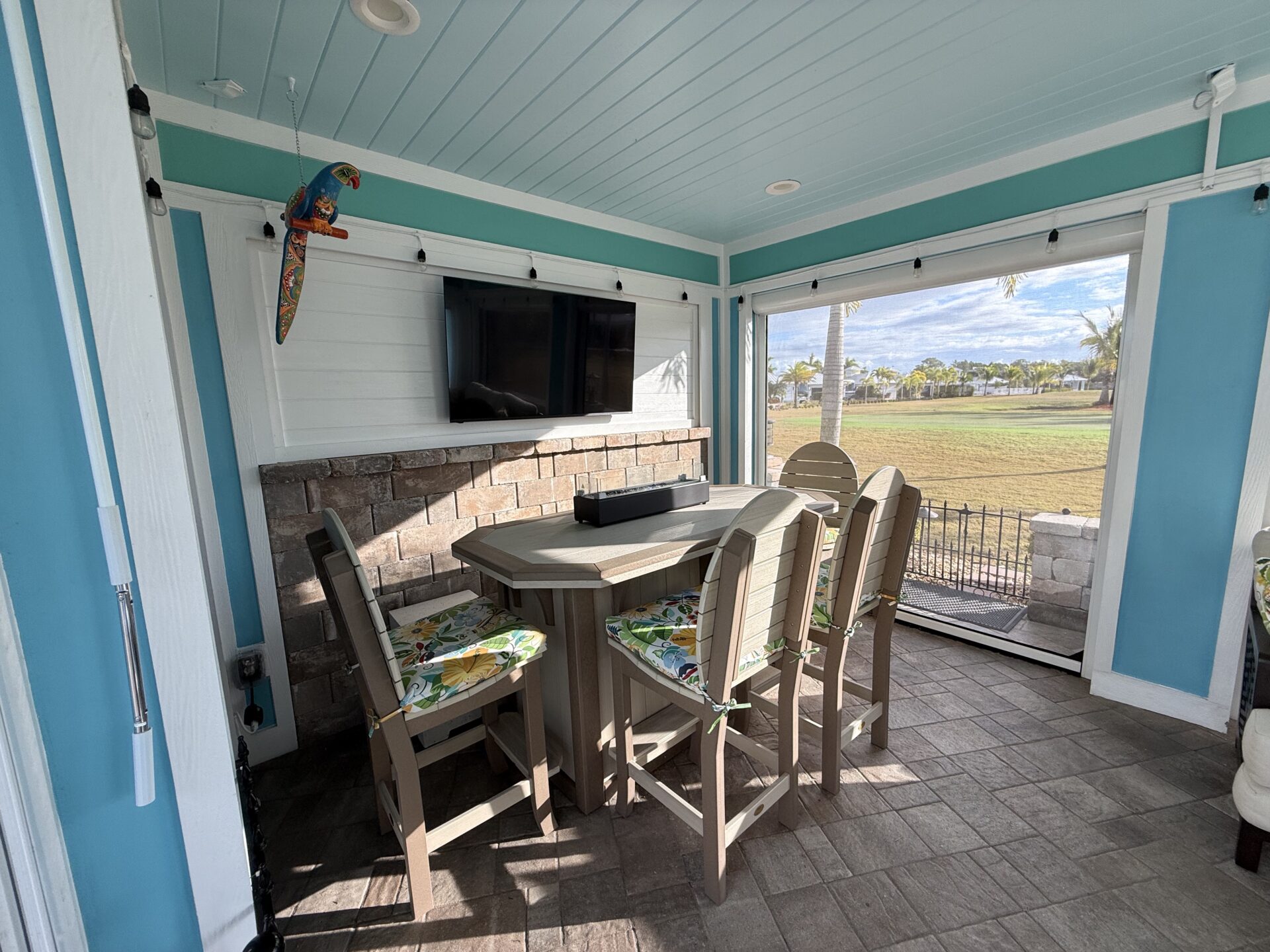 Step outside to your private pergola-covered lounge — a perfect setting to unwind, watch TV, or entertain while enjoying peaceful golf course and waterfall views. Every detail of the décor is colorful, curated, and full of personality, delivering a home that feels both upscale and effortlessly inviting.