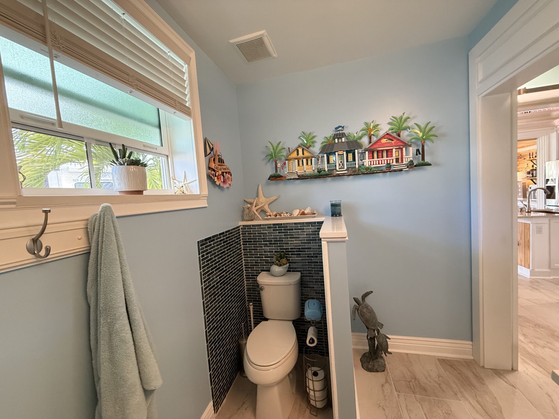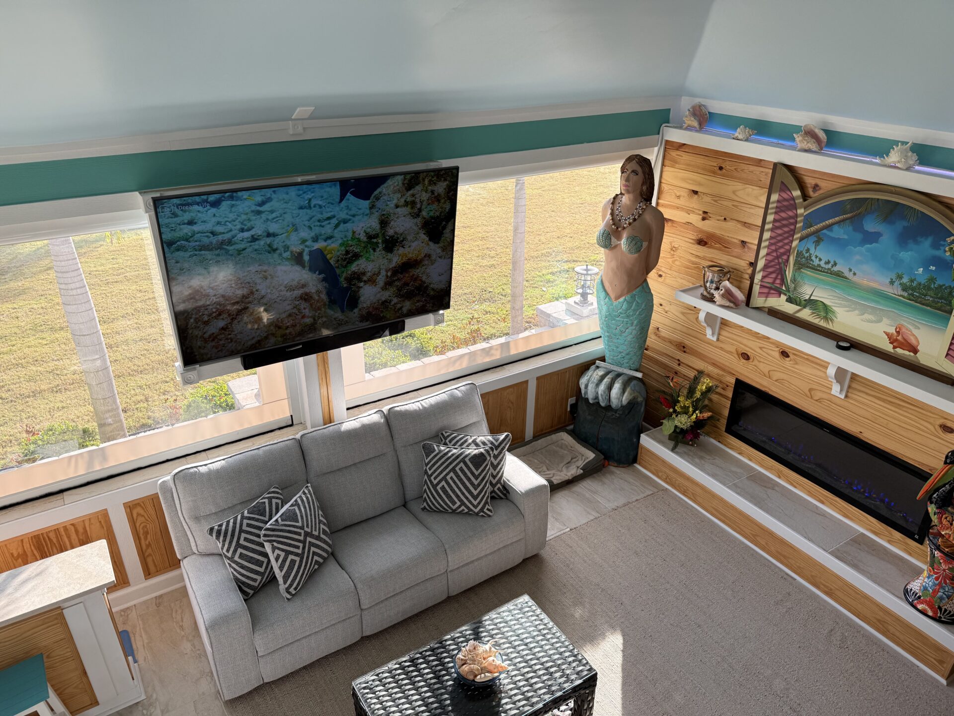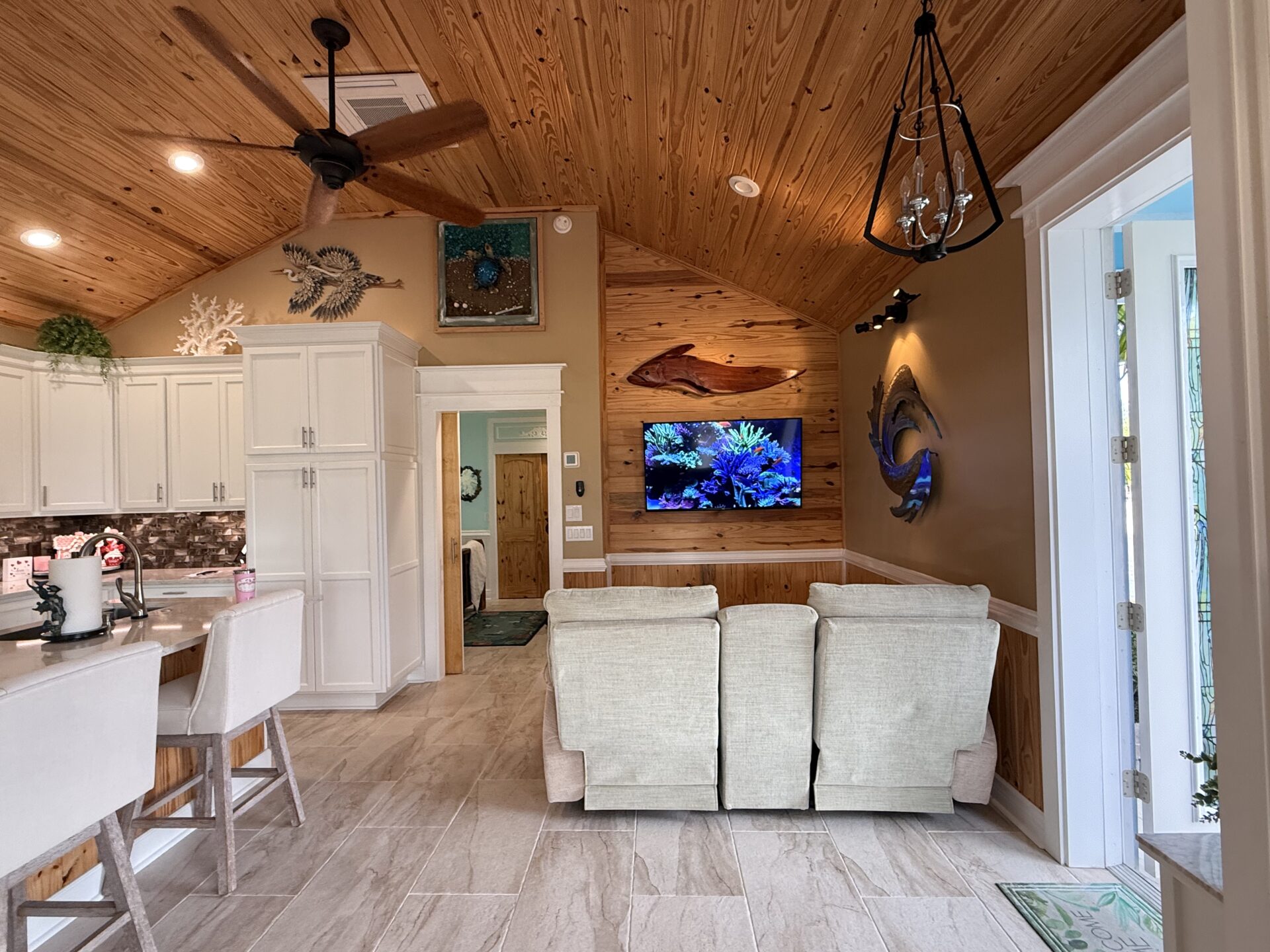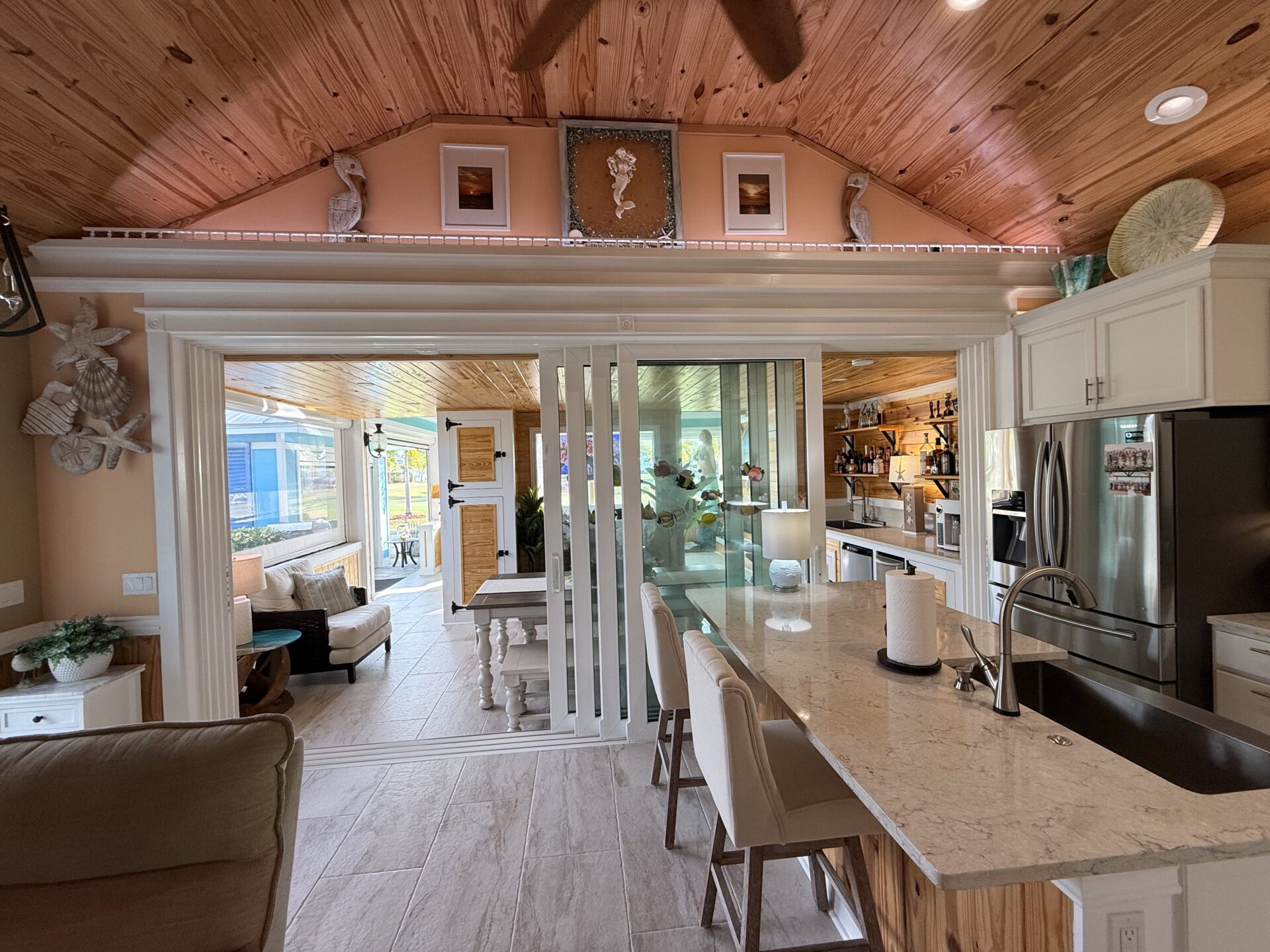 Step outside to your private pergola-covered lounge — a perfect setting to unwind, watch TV, or entertain while enjoying peaceful golf course and waterfall views. Every detail of the décor is colorful, curated, and full of personality, delivering a home that feels both upscale and effortlessly inviting.