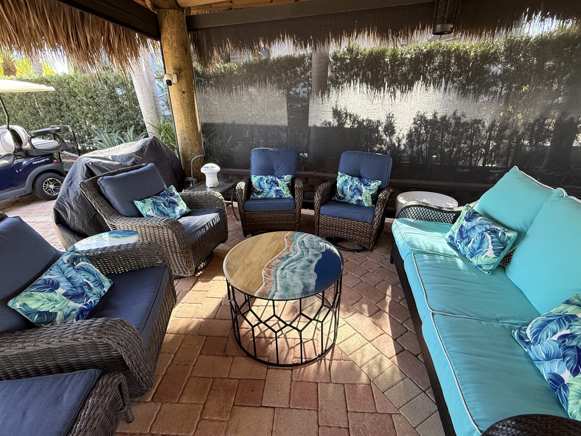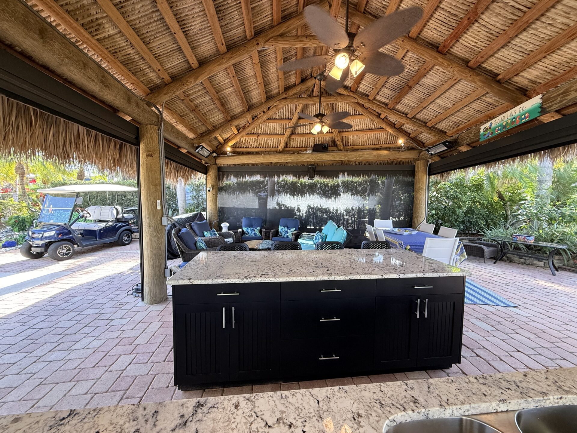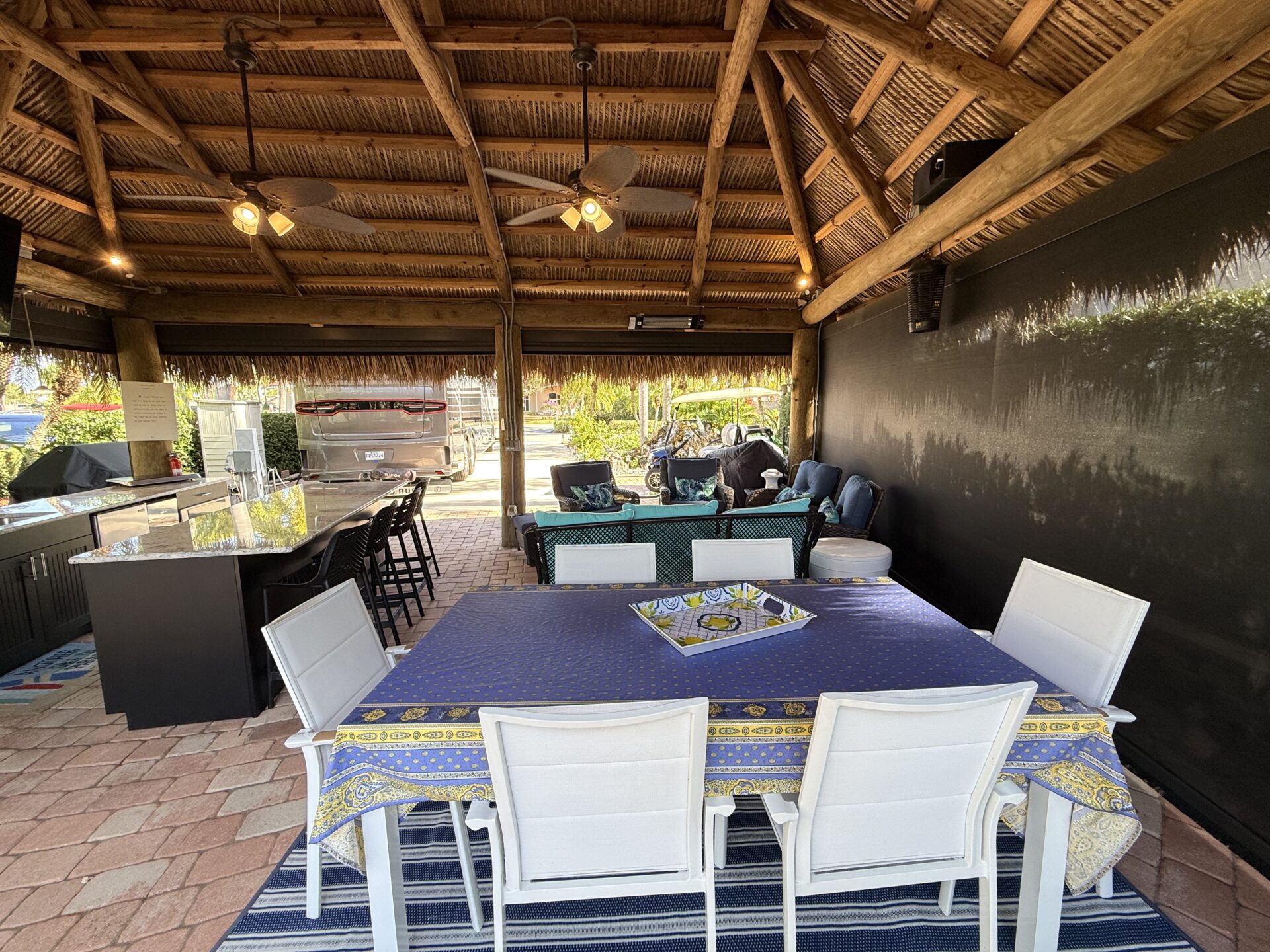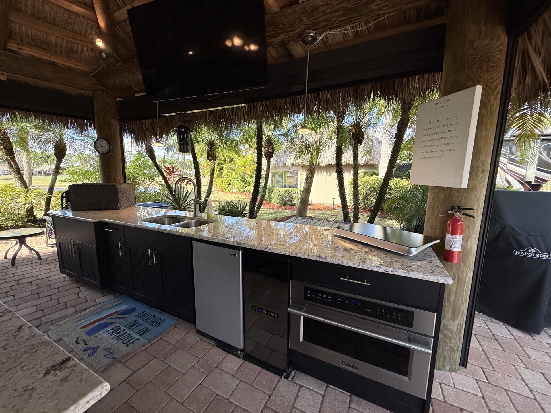 Located on the large lake with double fountains, this is truly one of the most exceptional lots in the resort. A breathtaking double-waterfall pond on property creates a serene, resort-style backdrop and serves as the property’s stunning focal point. Spanning an expansive 3,499 square feet, this lot offers multiple, thoughtfully designed entertaining spaces—perfect for both lively gatherings and quiet relaxation. The oversized tiki hut is equipped with remote-controlled screens, allowing for effortless comfort and seamless indoor-outdoor living in any weather. A large bar with generous seating anchors the space, creating the ultimate setting for hosting. The built-in outdoor kitchen blends style and function with upgraded cabinetry, a wine refrigerator, built-in oven, and ample counter space Recently refreshed landscaping and low-voltage lighting enhance the lush surroundings, while illuminated water features provide a striking ambiance from day into evening.