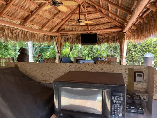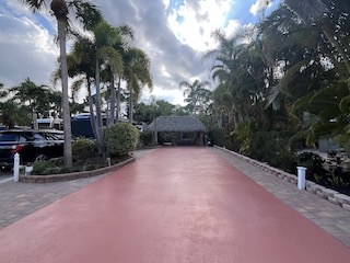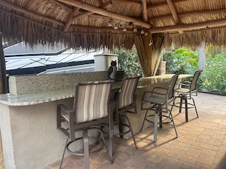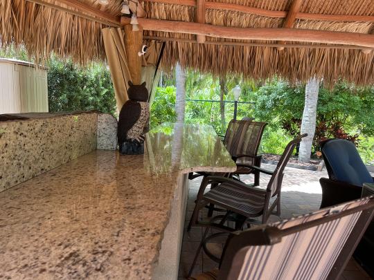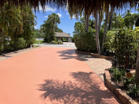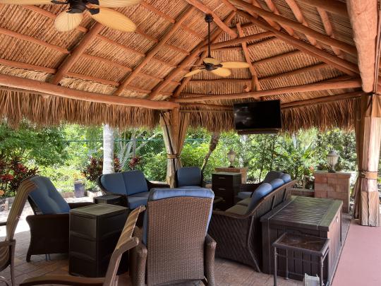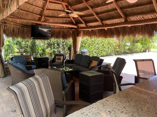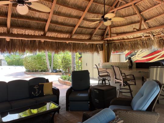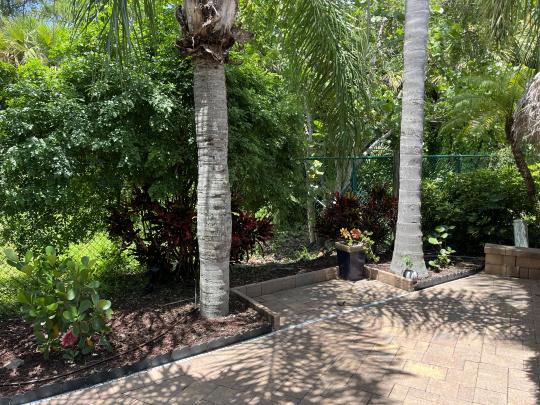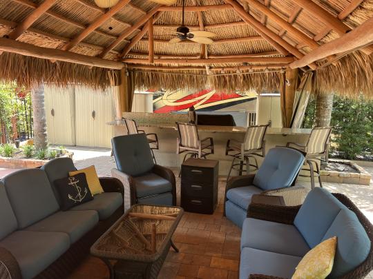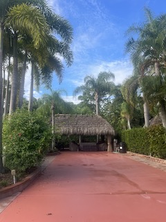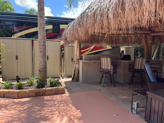 Beautiful landscaped . Newer large tiki, close to pool and additional parking. close to laundry facilities. Very active community . Bocce ball , shuffleboard, pickle ball , tennis , 18 hole golf course. This lot backs onto the reserve for privacy and has mature, lush landscaping. Newly refinished with more contemporary pavers, a golf cart parking area, and refreshed built in kitchen that includes a JennAir grill. Most of the furniture and storage units remain. There is a mosquito spraying system to ensure enjoyable evenings in the