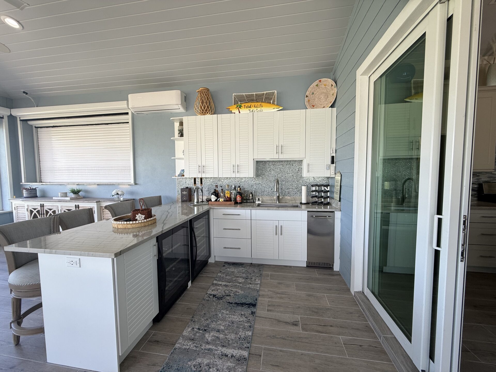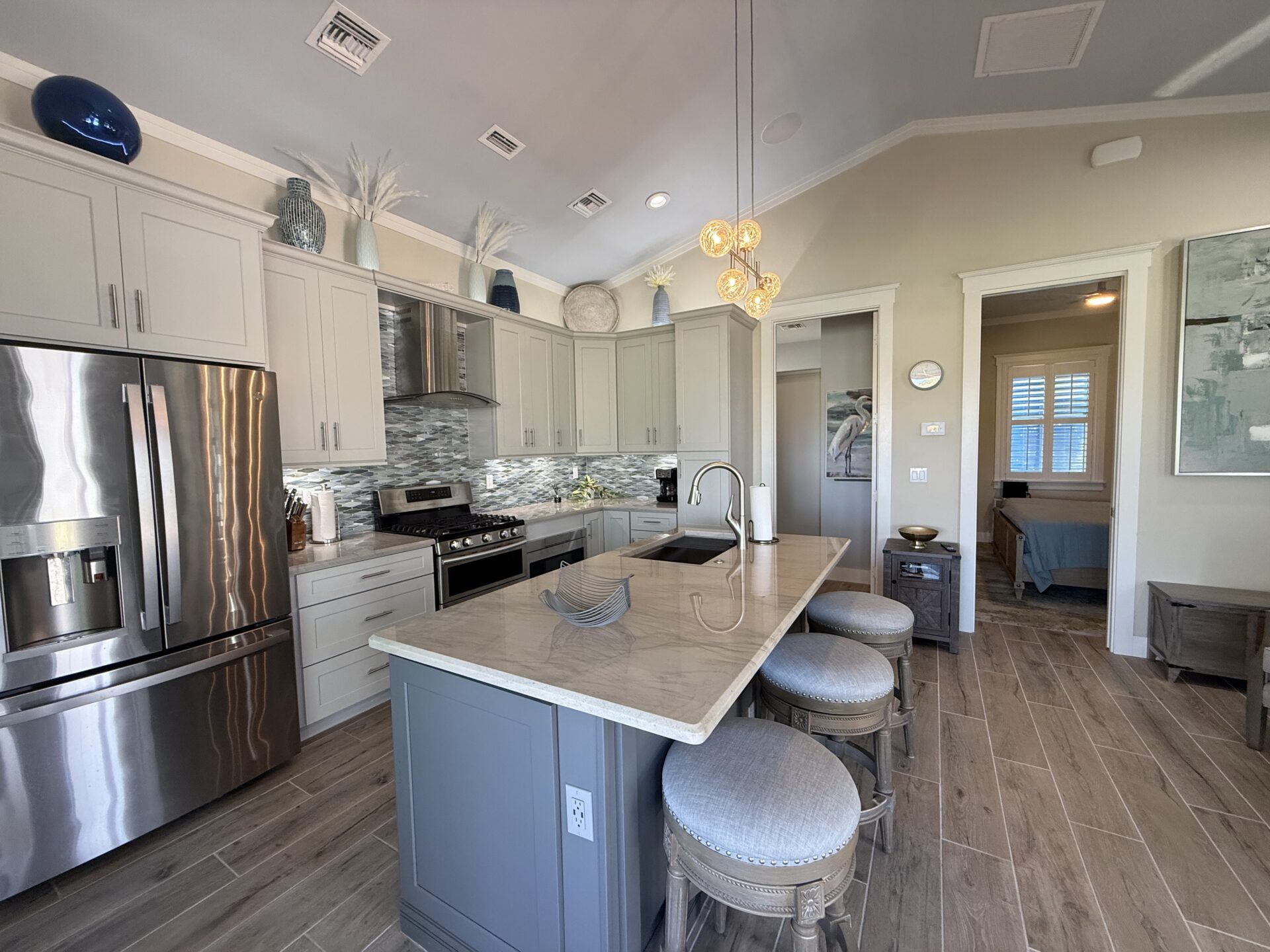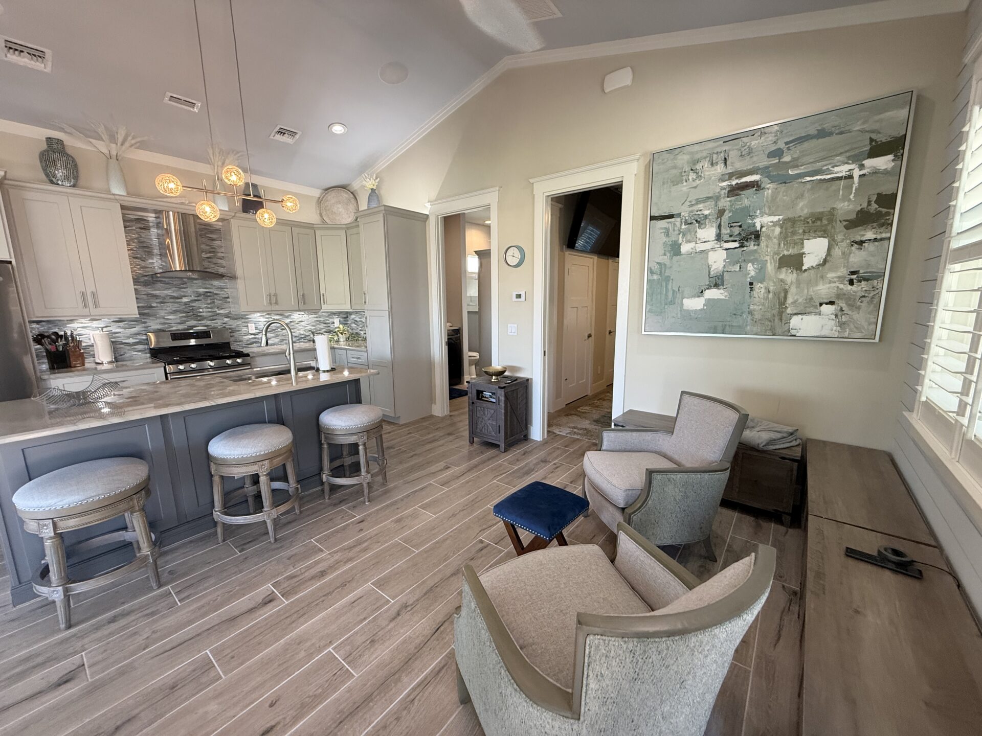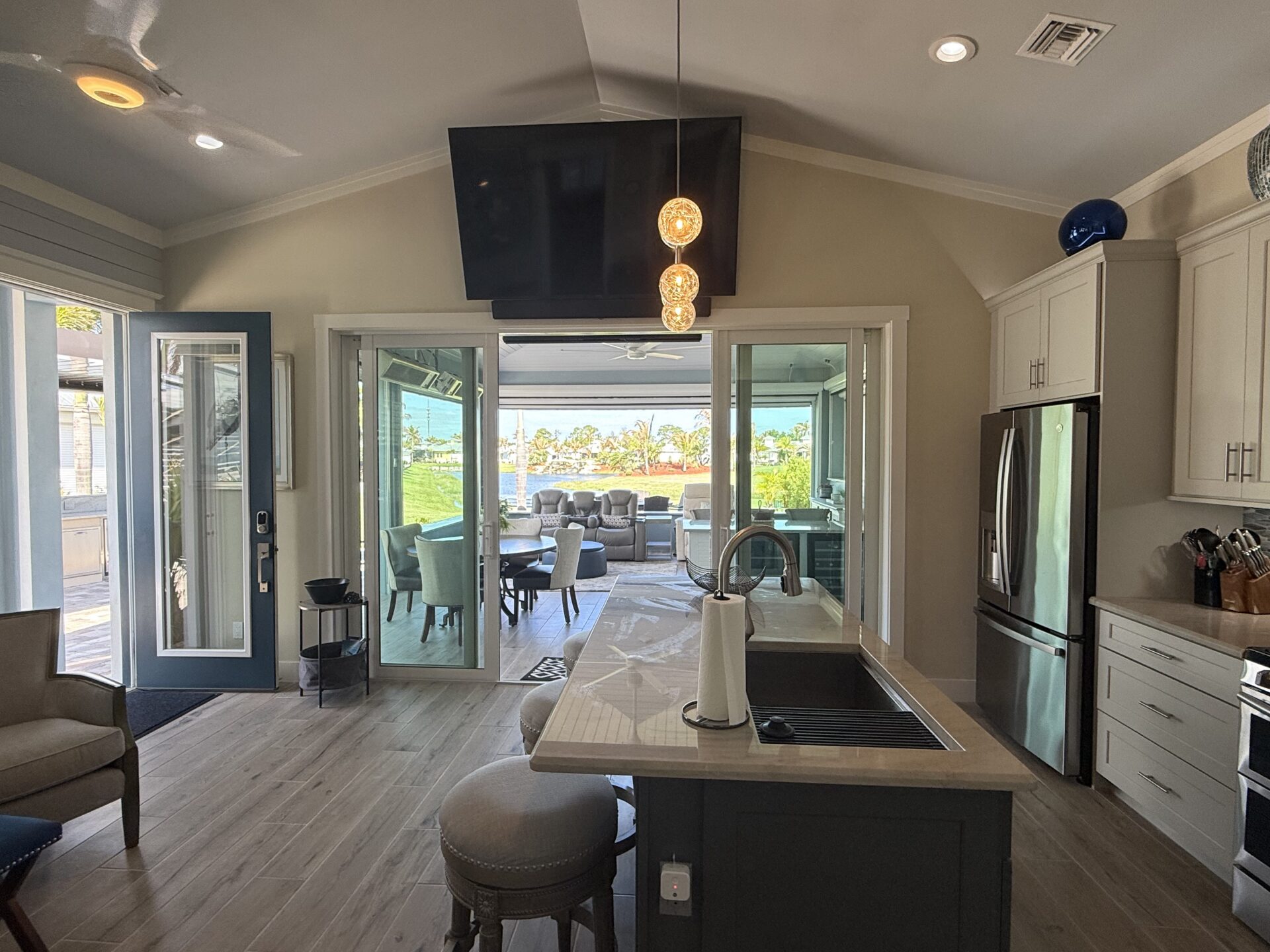 Inside, the home reflects professional design and thoughtful craftsmanship, with sophisticated furnishings, premium appliances, and carefully curated finishes that create a warm yet luxurious retreat. The fully equipped kitchen offers generous custom cabinetry and storage, complemented by additional built-in storage solutions both indoors and within the lanai—ensuring everything has its place while maintaining the home’s clean, elegant aesthetic.