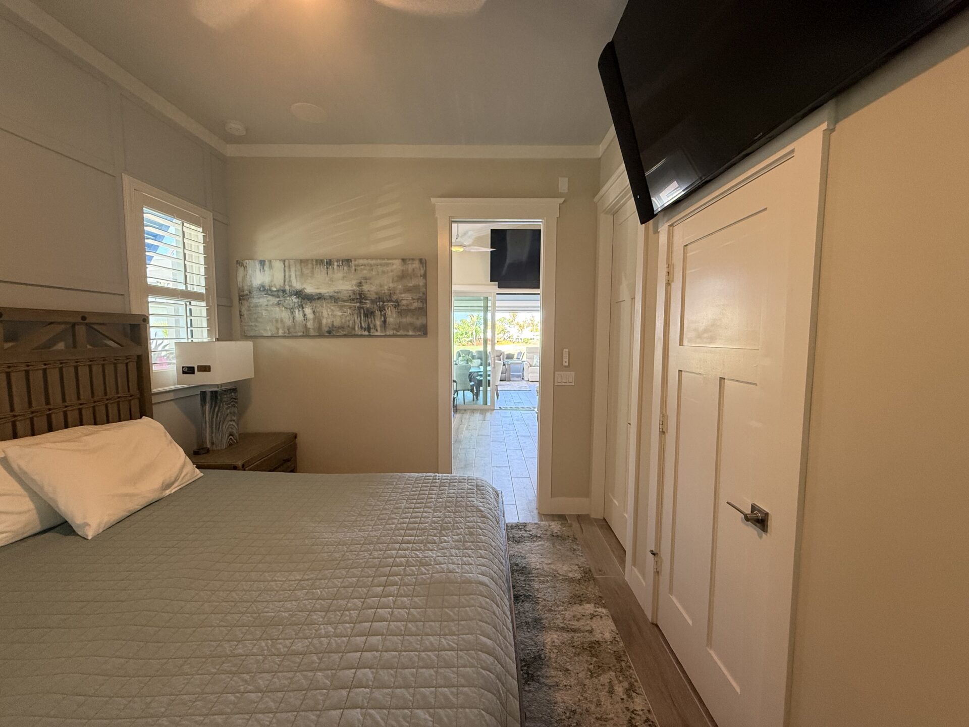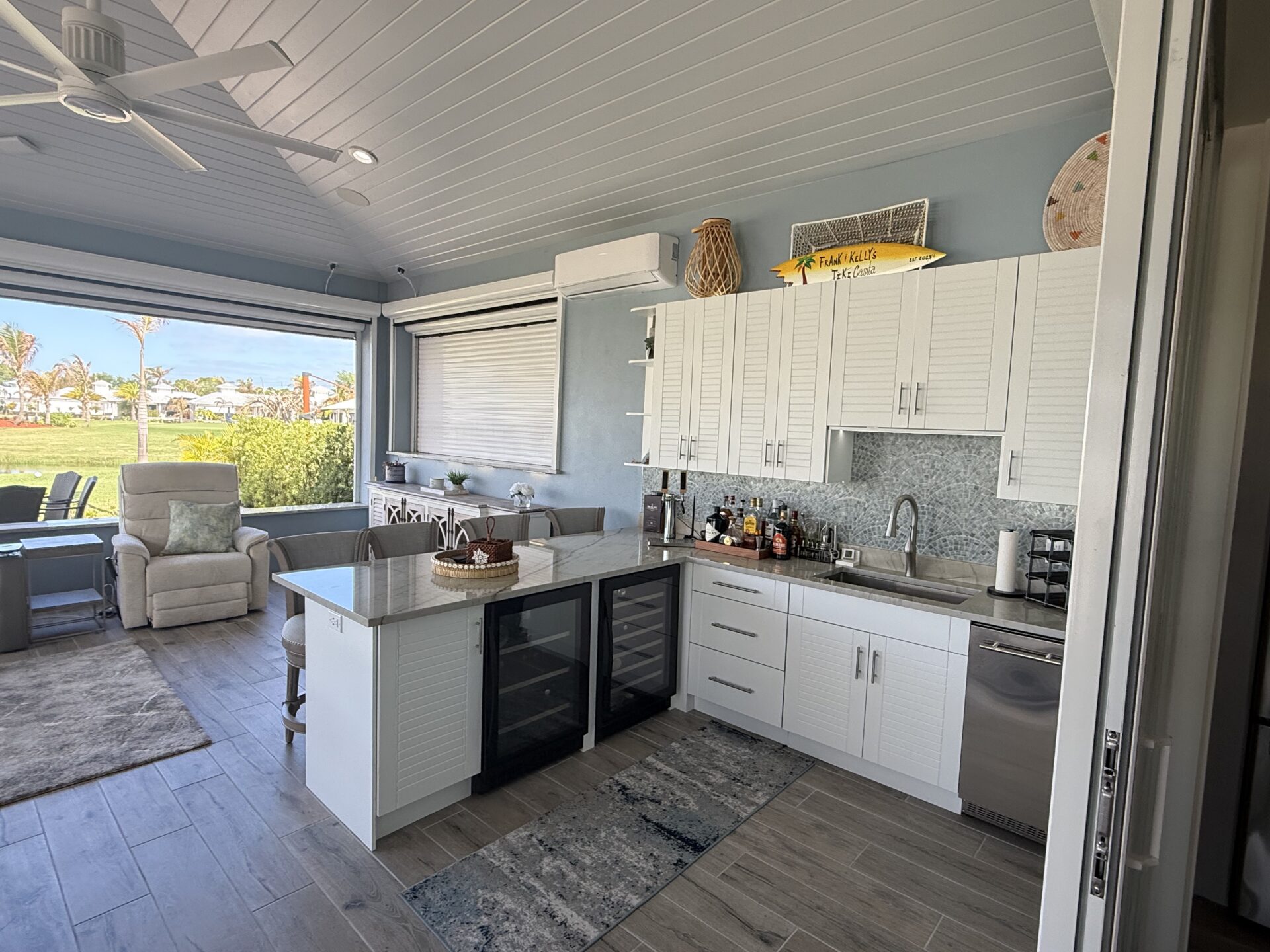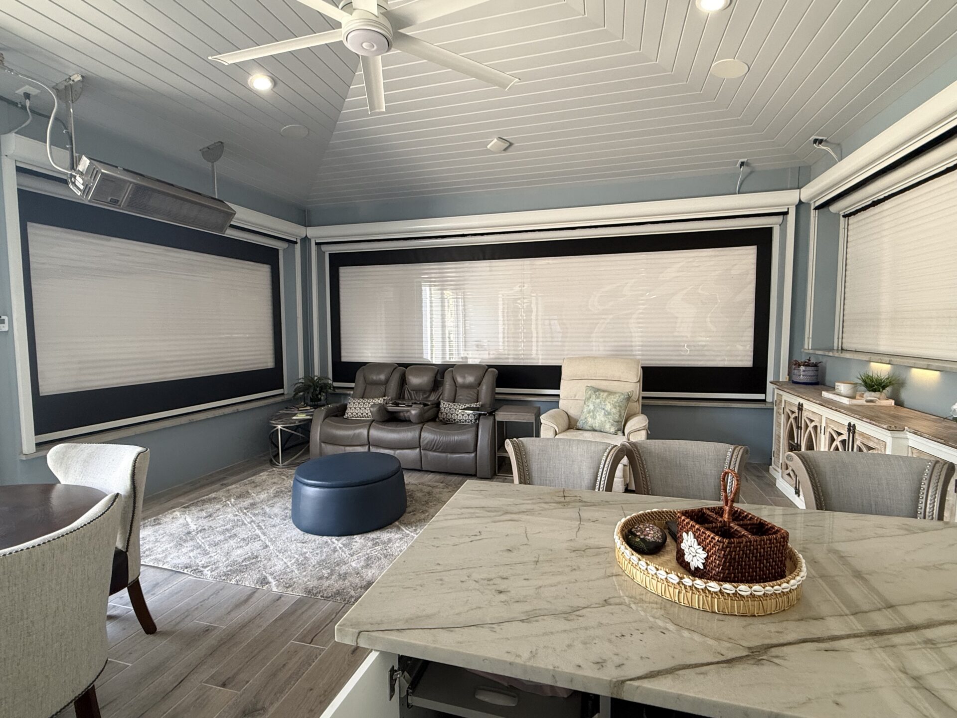 Inside, the home reflects professional design and thoughtful craftsmanship, with sophisticated furnishings, premium appliances, and carefully curated finishes that create a warm yet luxurious retreat. The fully equipped kitchen offers generous custom cabinetry and storage, complemented by additional built-in storage solutions both indoors and within the lanai—ensuring everything has its place while maintaining the home’s clean, elegant aesthetic.