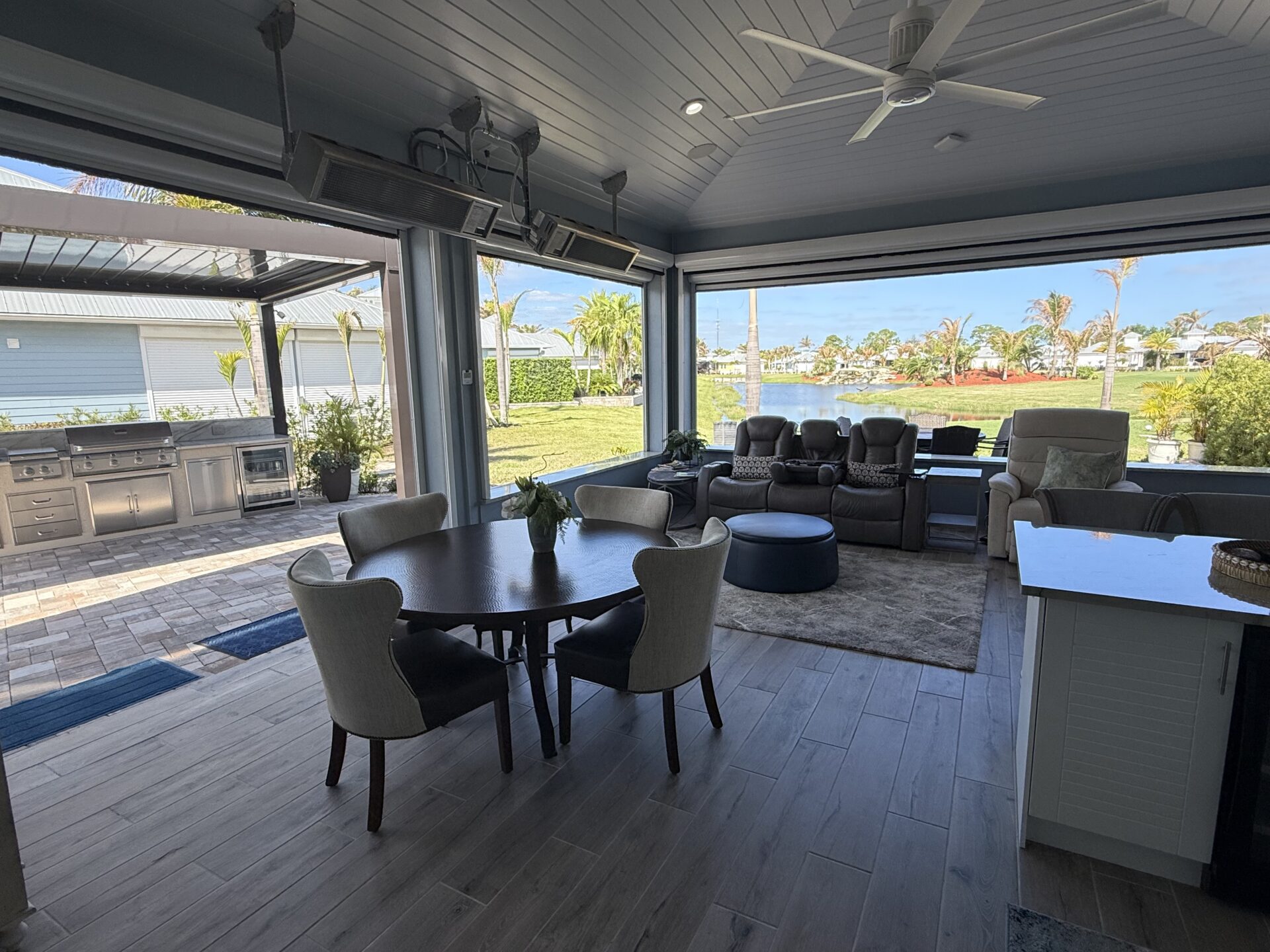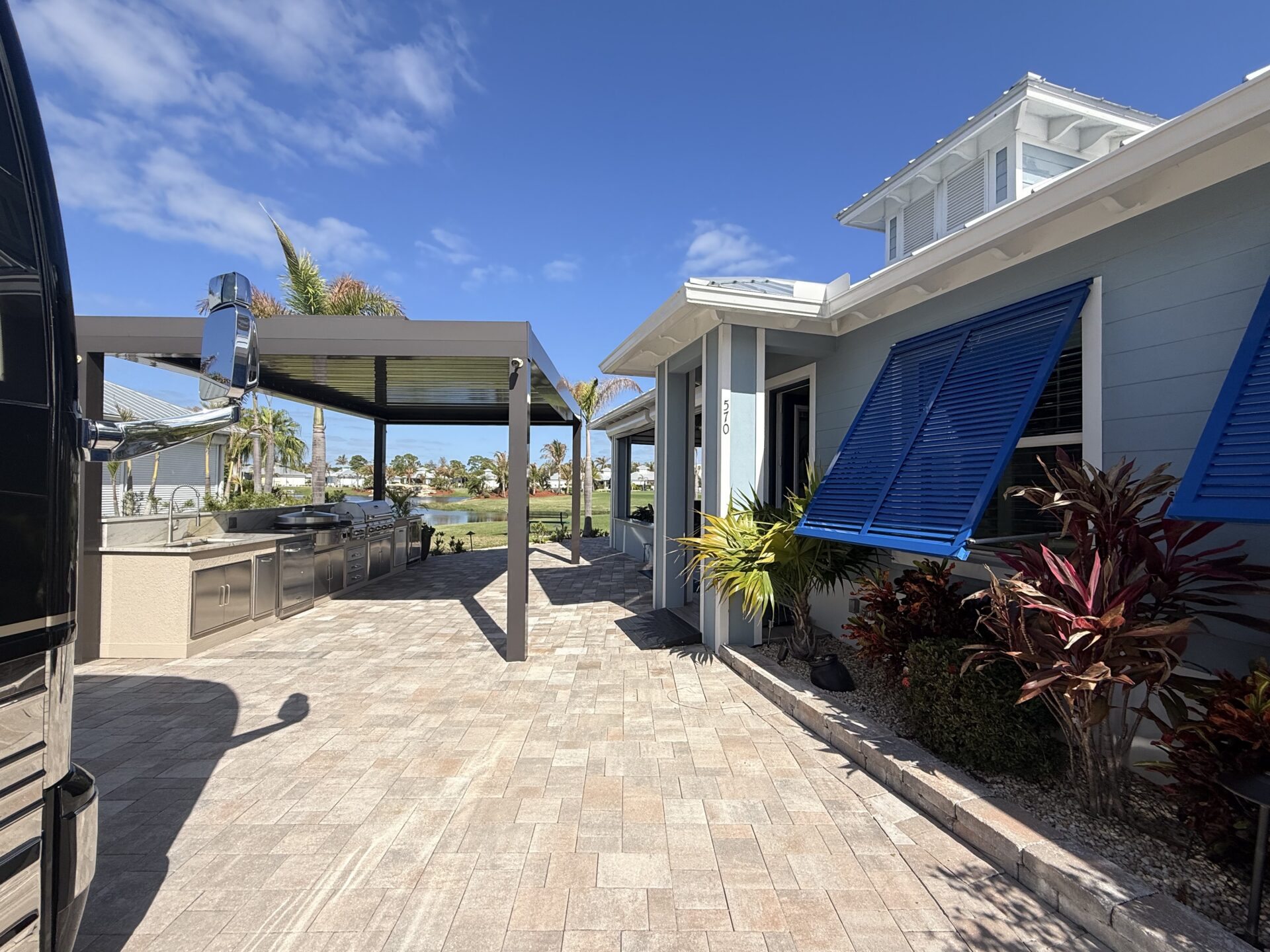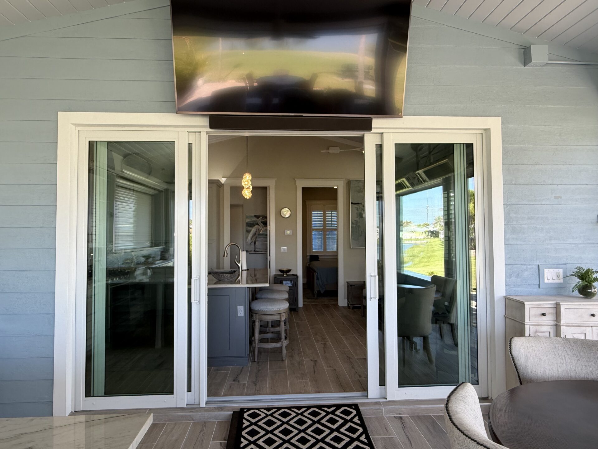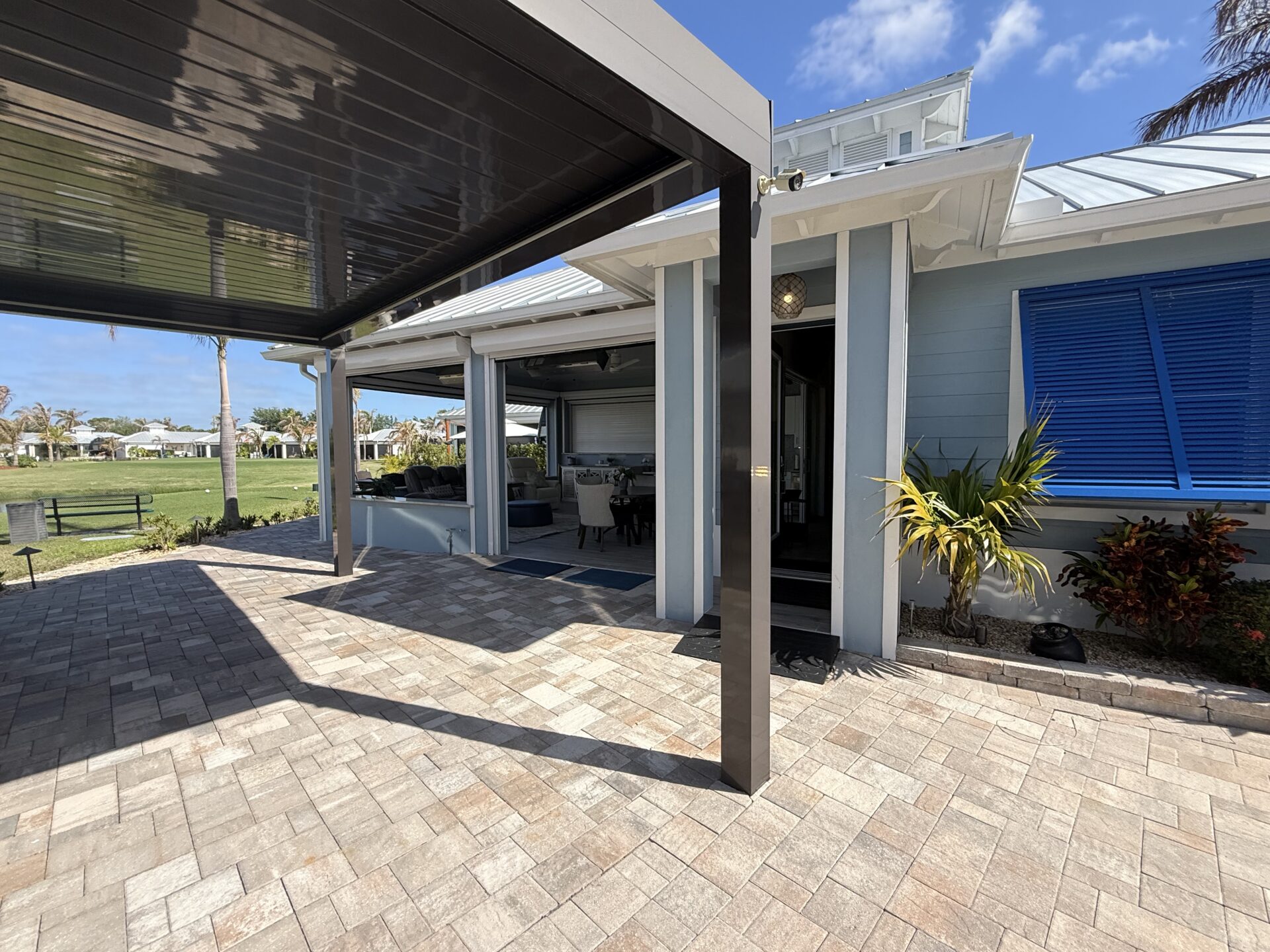 Designed with both comfort and style in mind, the residence features an expansive 500-square-foot lanai that serves as the heart of the home—an inviting outdoor living space ideal for entertaining or simply relaxing while enjoying serene golf and water views. The lanai is enhanced by a high-end outdoor kitchen that’s covered by a modern pergola with power-operated louvered slats, allowing you to effortlessly adjust sunlight and shade throughout the day and stay dry while cooking & entertaining outdoors.