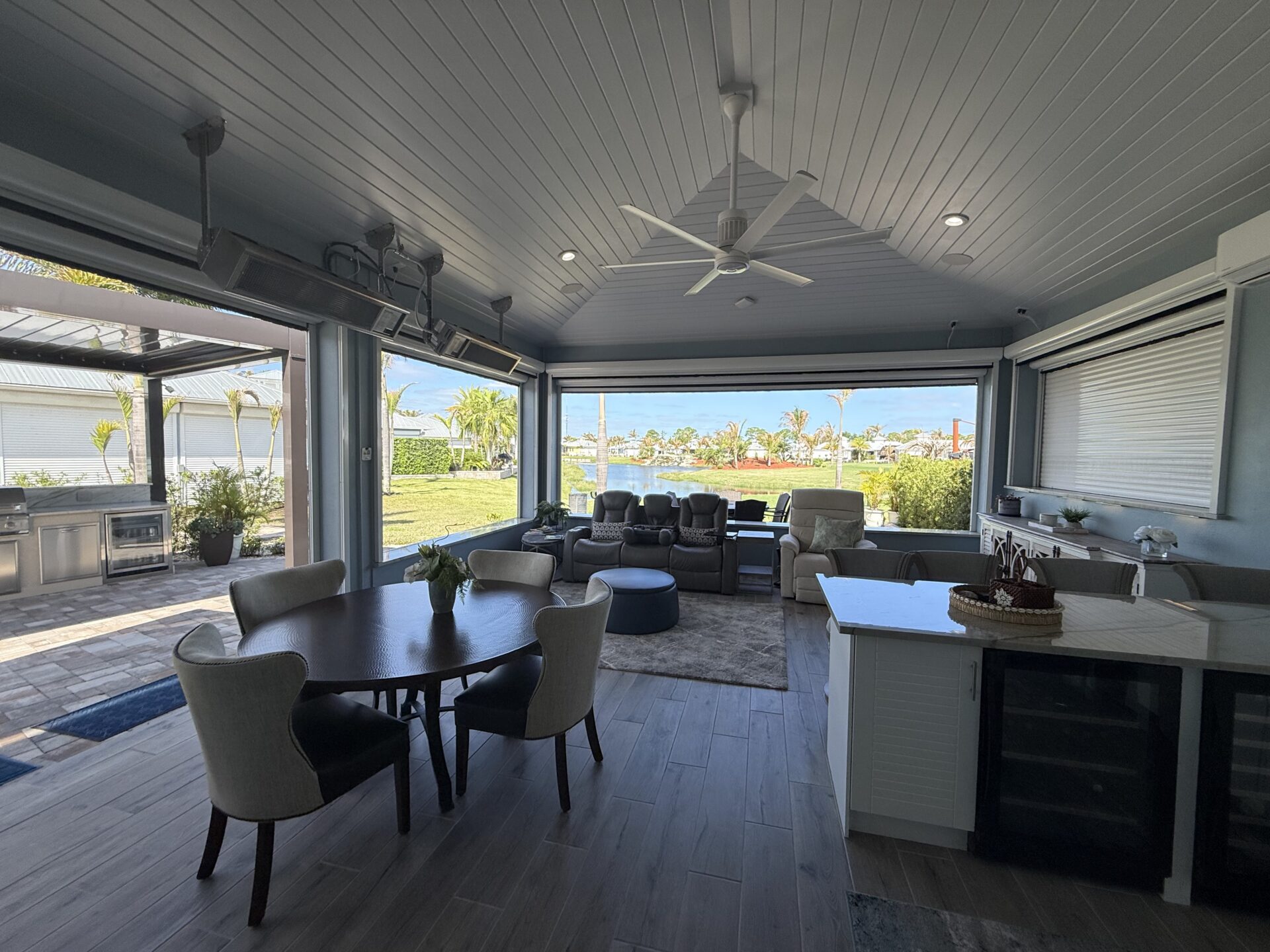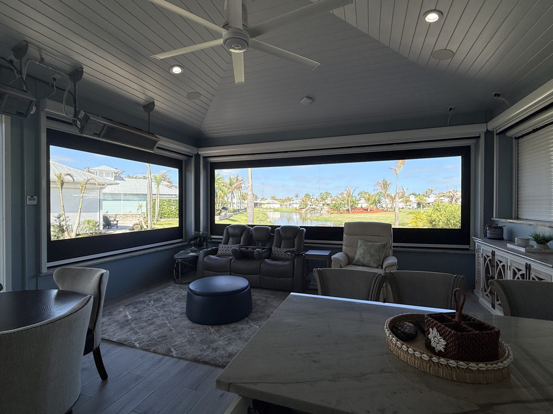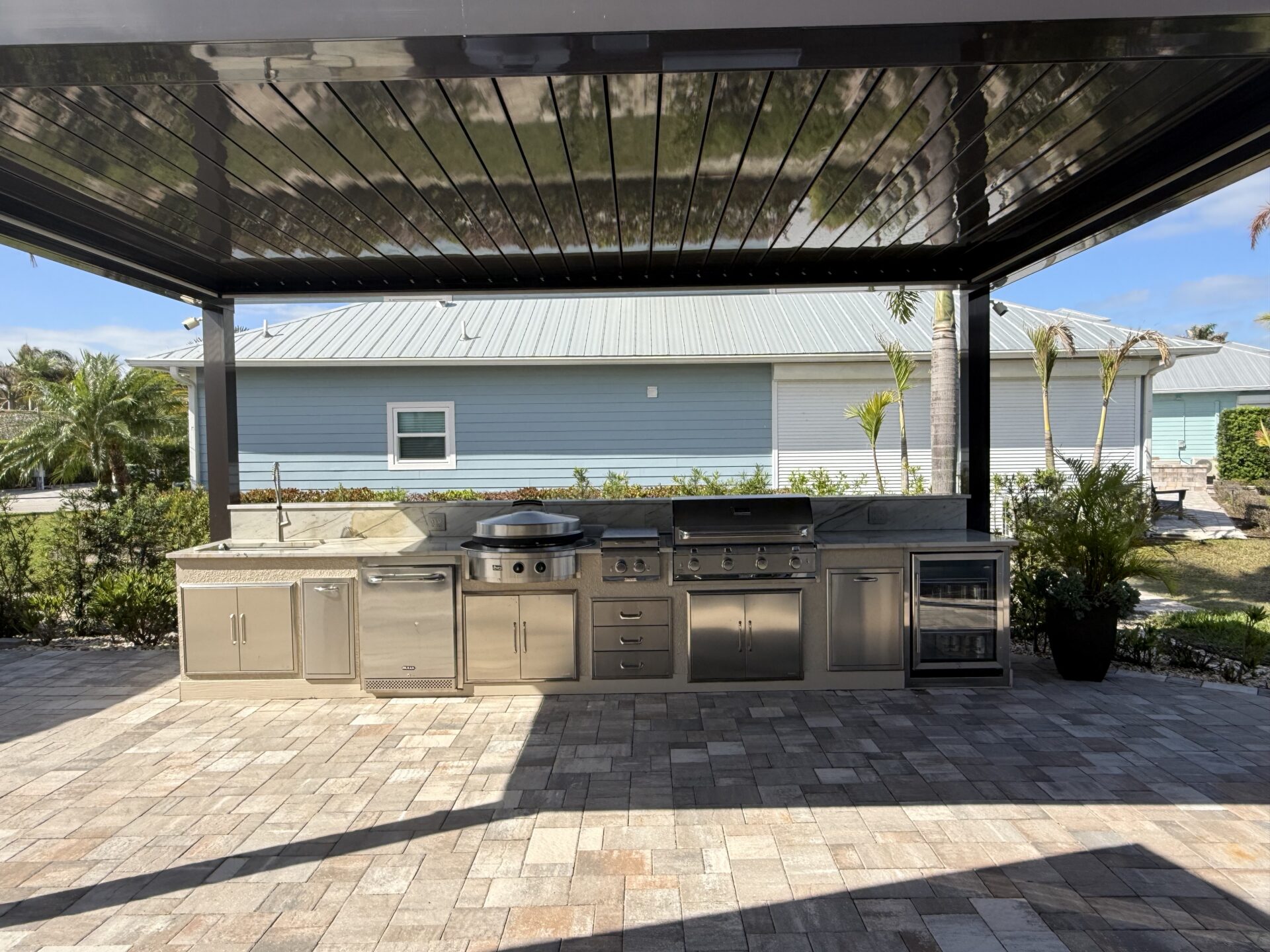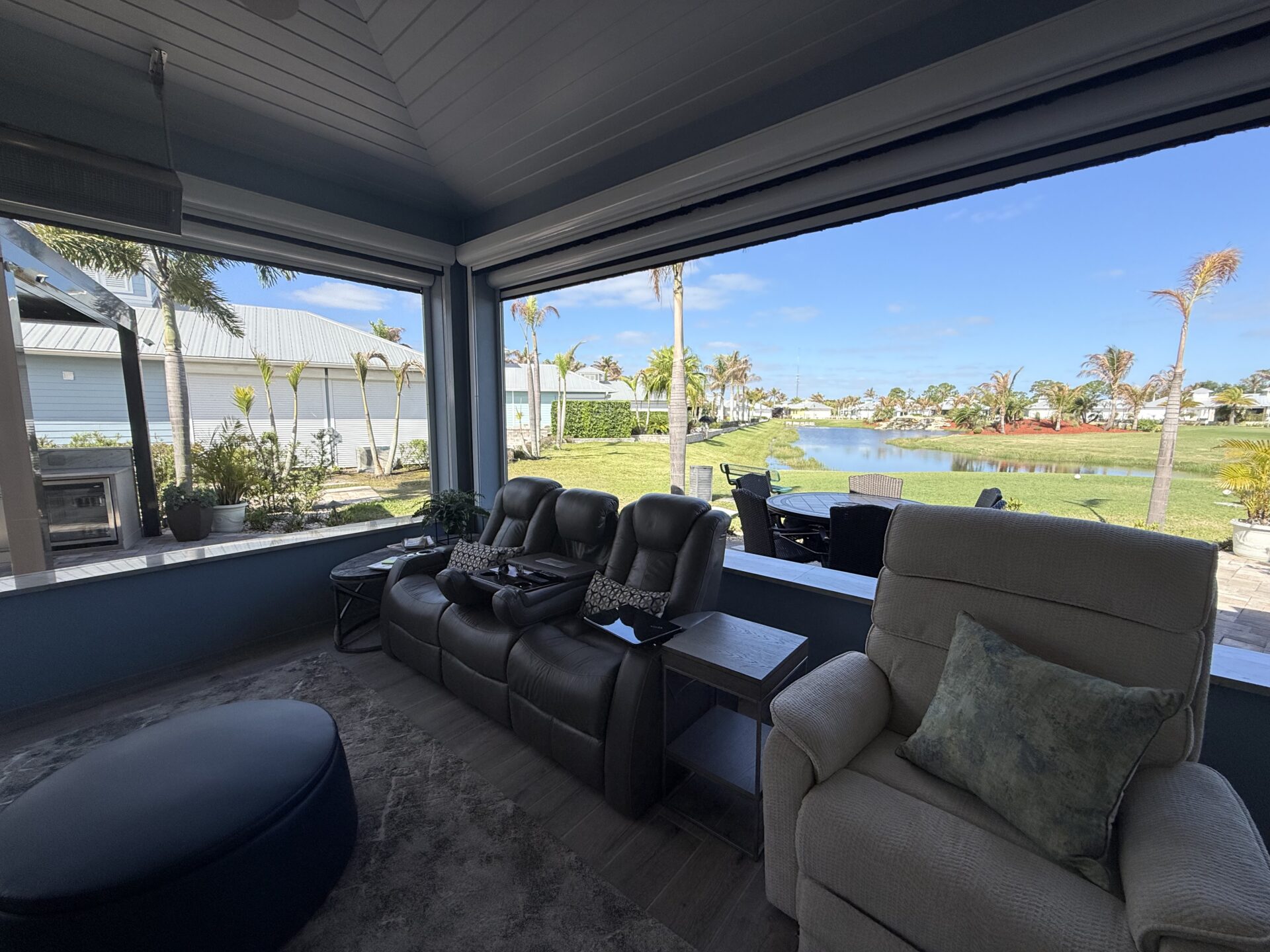 Designed with both comfort and style in mind, the residence features an expansive 500-square-foot lanai that serves as the heart of the home—an inviting outdoor living space ideal for entertaining or simply relaxing while enjoying serene golf and water views. The lanai is enhanced by a high-end outdoor kitchen that’s covered by a modern pergola with power-operated louvered slats, allowing you to effortlessly adjust sunlight and shade throughout the day and stay dry while cooking & entertaining outdoors.