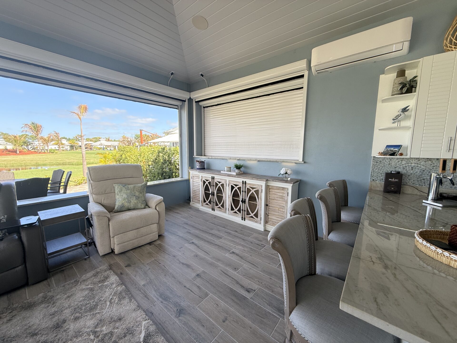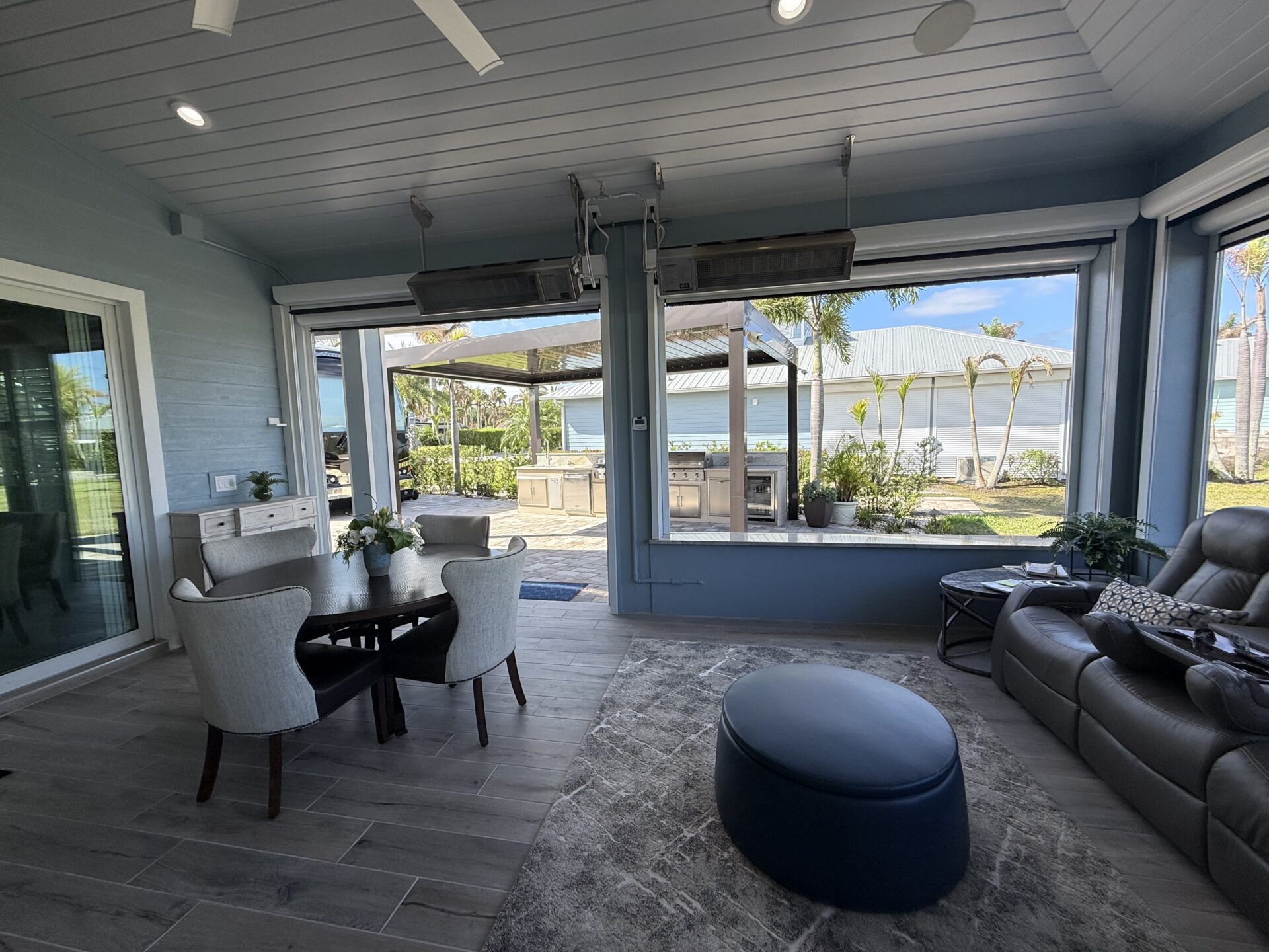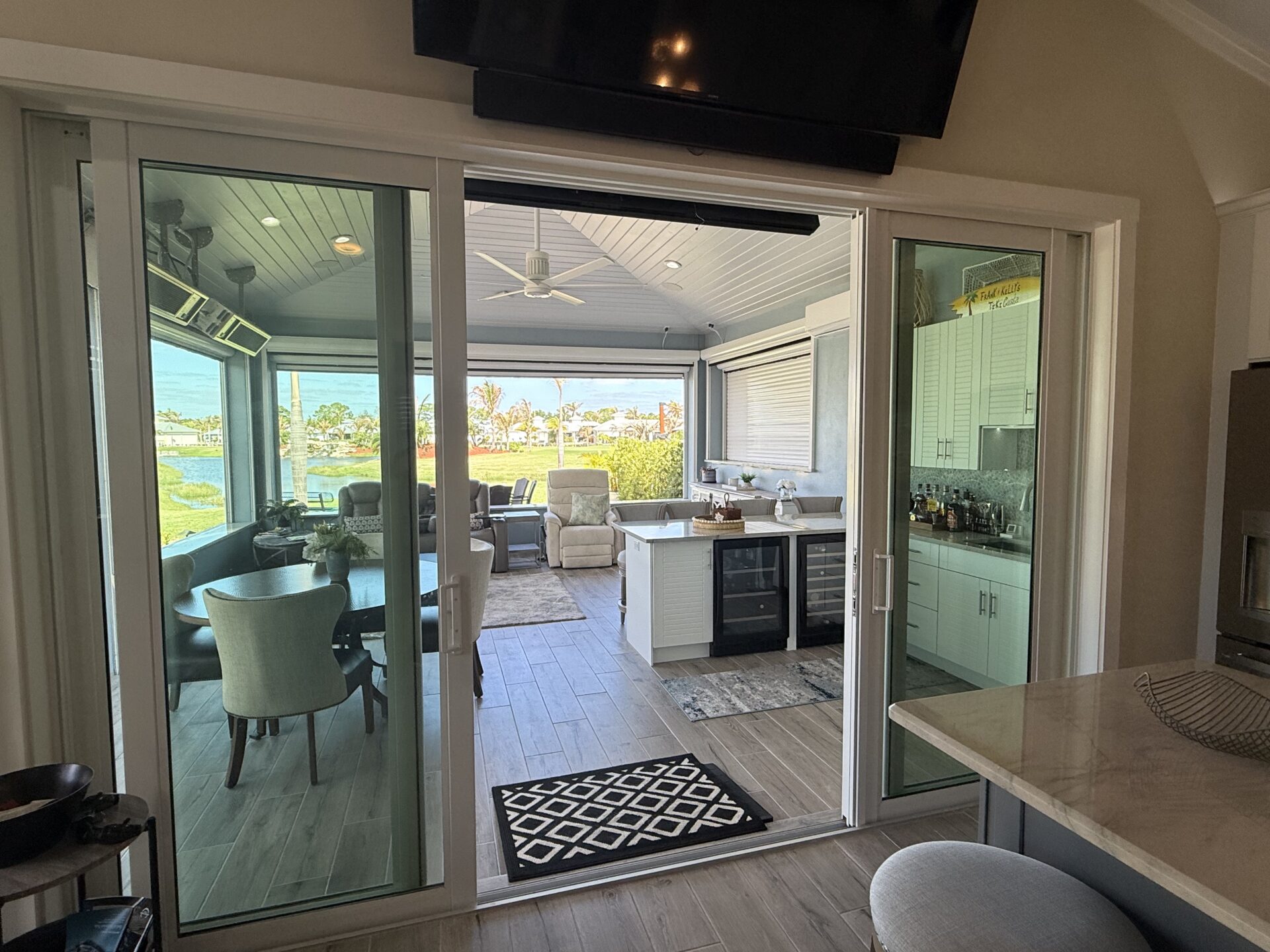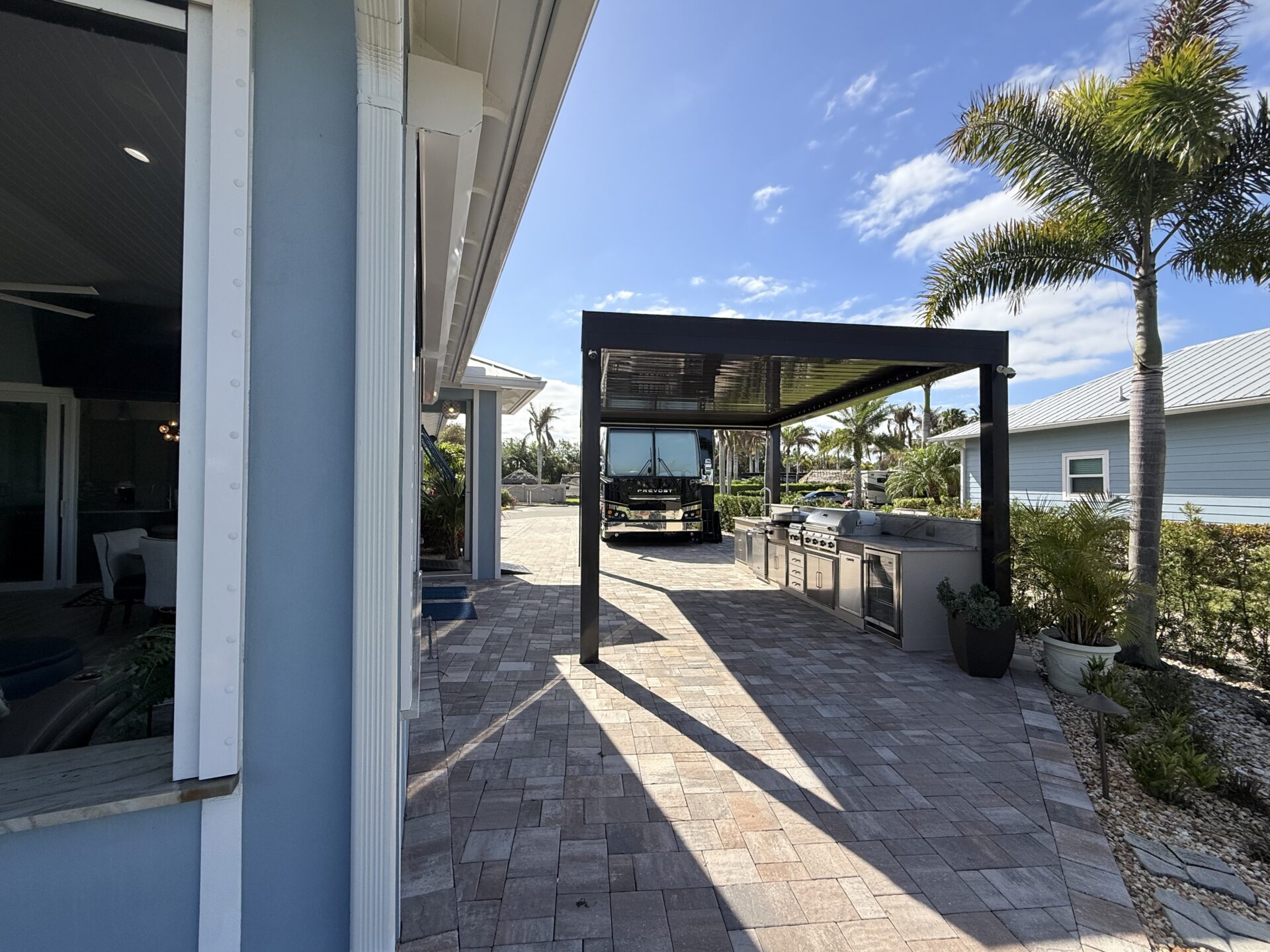 Designed with both comfort and style in mind, the residence features an expansive 500-square-foot lanai that serves as the heart of the home—an inviting outdoor living space ideal for entertaining or simply relaxing while enjoying serene golf and water views. The lanai is enhanced by a high-end outdoor kitchen that’s covered by a modern pergola with power-operated louvered slats, allowing you to effortlessly adjust sunlight and shade throughout the day and stay dry while cooking & entertaining outdoors.
