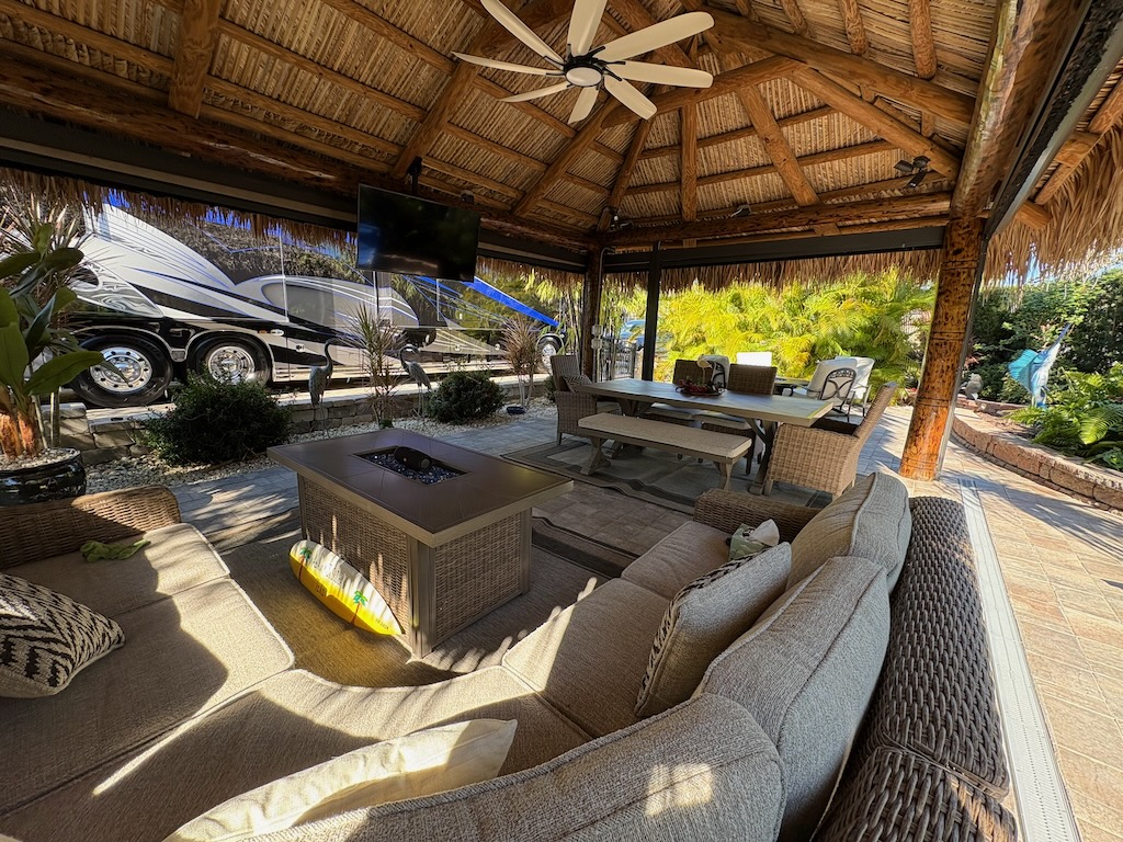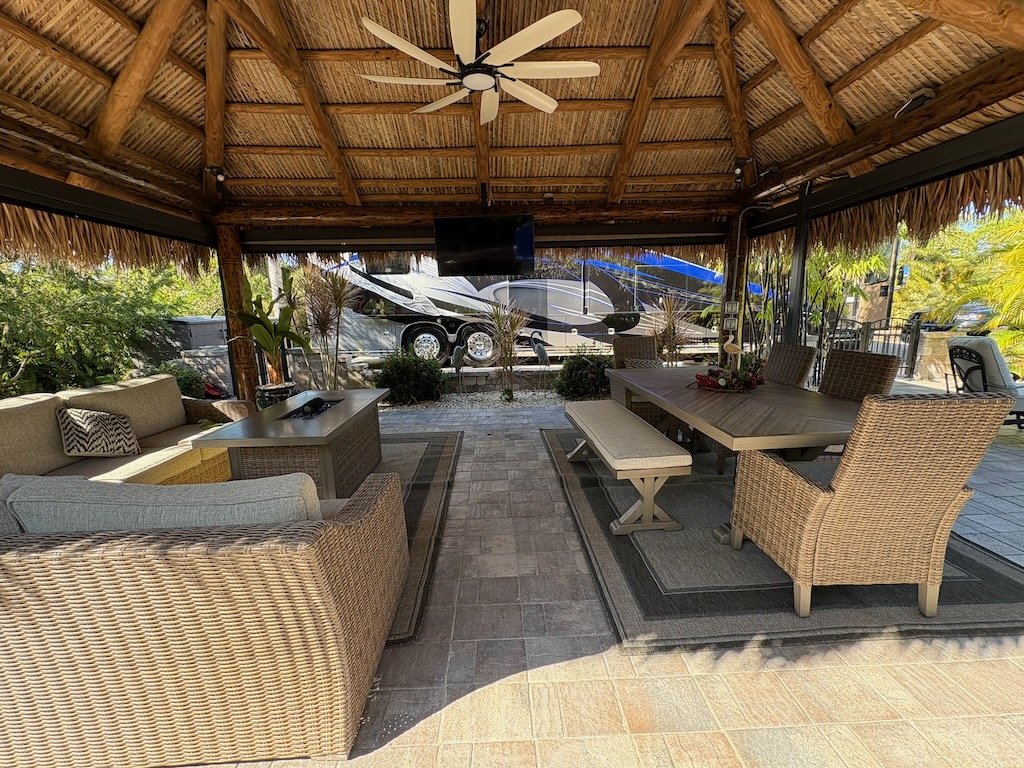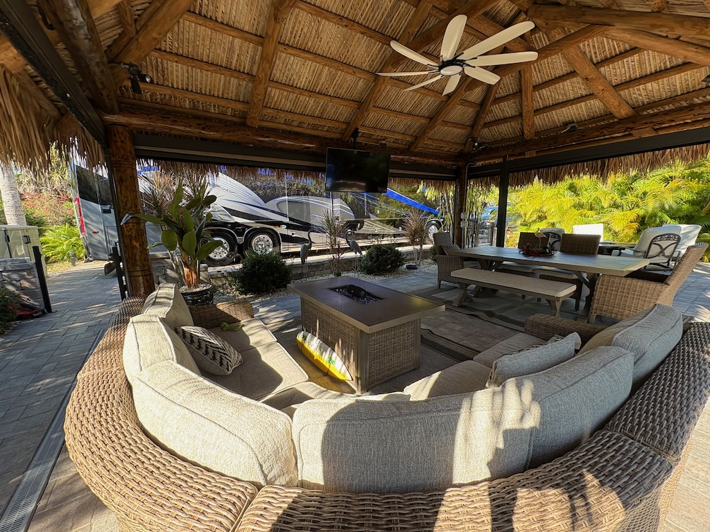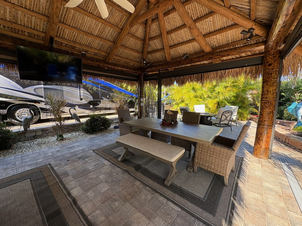 Nestled on a private corner location directly across from the North Satellite Pool, this desirable north-facing lot is a true nature lover’s retreat. Surrounded by mature landscaping, the property offers exceptional privacy and shade, creating a tranquil outdoor setting rarely found in the resort. The expansive backyard provides room for entertaining, or simply enjoying a generous outdoor living area. A large tiki hut features motorized Eisenglass shades for year-round comfort. Recent upgrades include new-style pavers over entire lot. There’s ample parking for up to three vehicles and additional guest parking conveniently located across the street near the satellite pool and spa, bathhouses, and laundry facilities. The corner setting allows for easy access and stress-free backing in. Fully furnished and move-in ready, this beautifully maintained property combines privacy, functionality, and resort-style living.