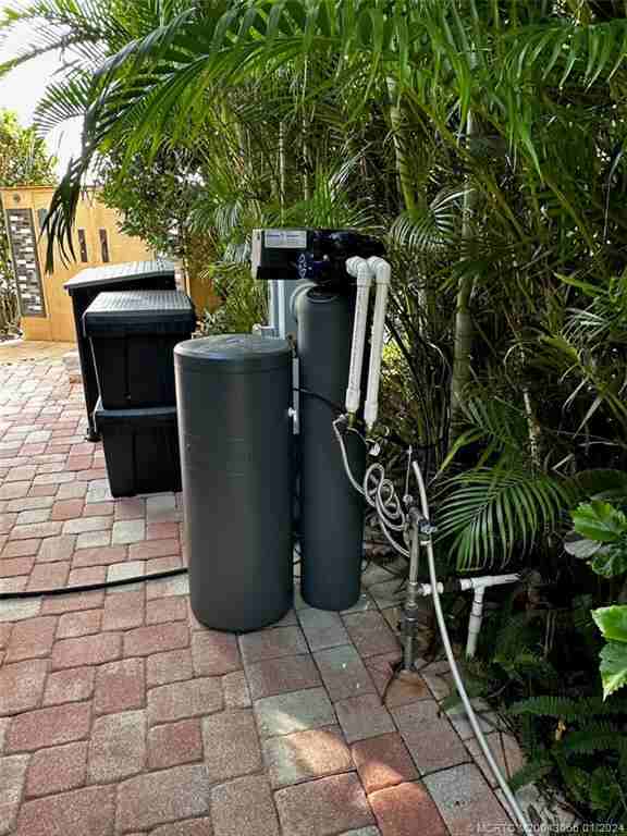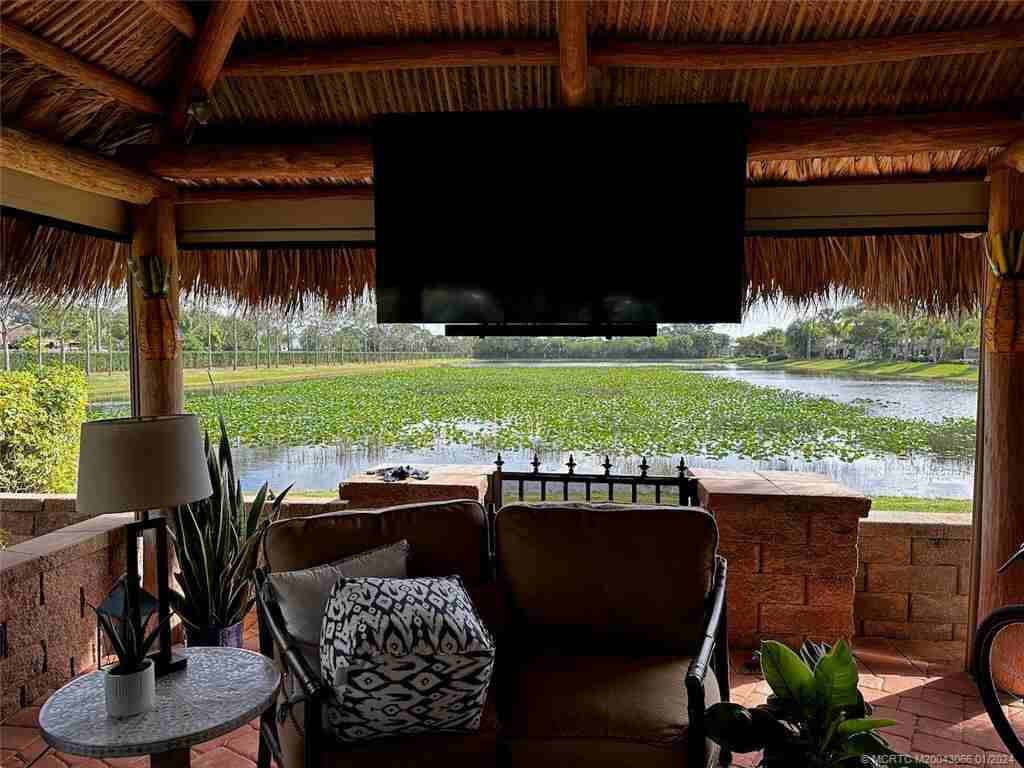LOCATION, LOCATION! Expansive lot ideally situated in a sought-after cul-de-sac, boasting a picturesque backdrop as it backs onto a lake with captivating views of an illuminated fountain and a nature lover’s dream location. Tucked away in a corner, this property is adorned with lush privacy landscaping, including a landscaped wall/bed strategically placed in front of the tiki for enhanced seclusion. The meticulously designed yard features bronze egrets and a stunning rock fountain/waterfall, adding a touch of elegance. The tiki is equipped with motorized eisenglass screens for chilly nights, a built-in bar/kitchen, and custom-made sideboard and storage units. Enjoy newly installed upgraded landscape lighting throughout. The property is fully furnished with top-of-the-line furnishings and TV, ensuring a move-in-ready experience. The new tiki roof rethatch in 2021 enhances its appeal. Experience total privacy in a tropical oasis – a must-see property!